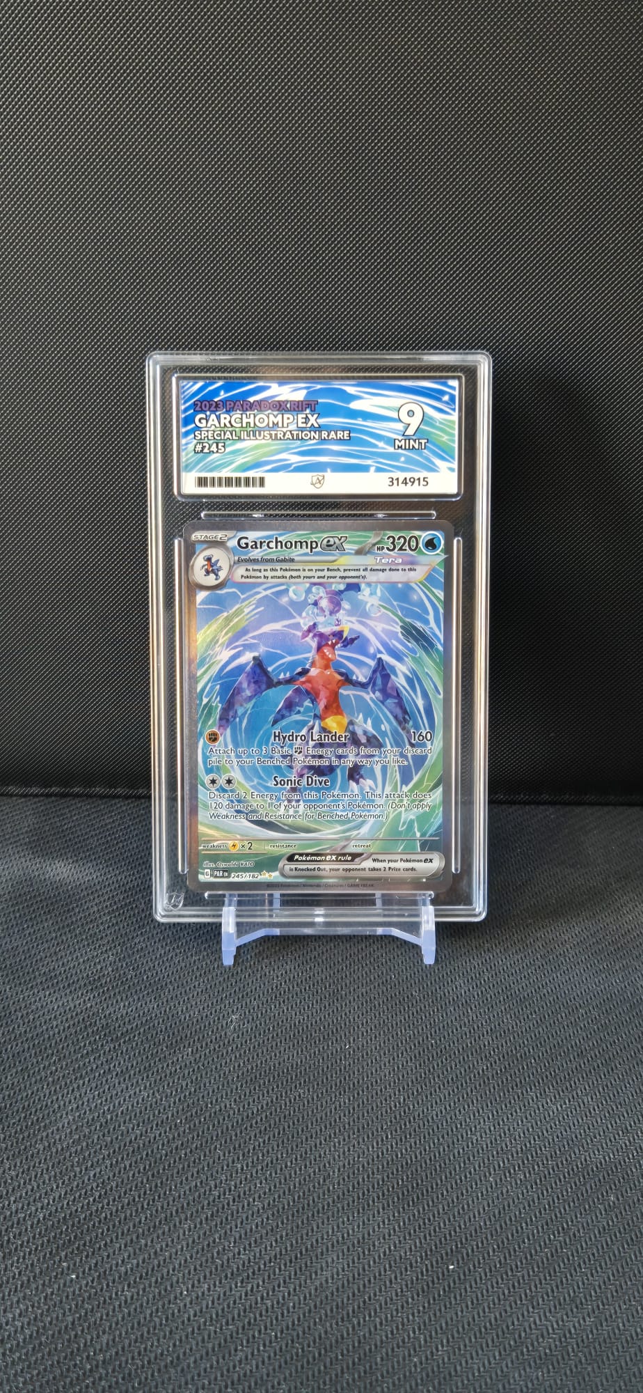 The 2023 Paradox Rift Garchomp EX #245 ACE 9 is priced at $40.00. Free shipping is available on orders over $49.