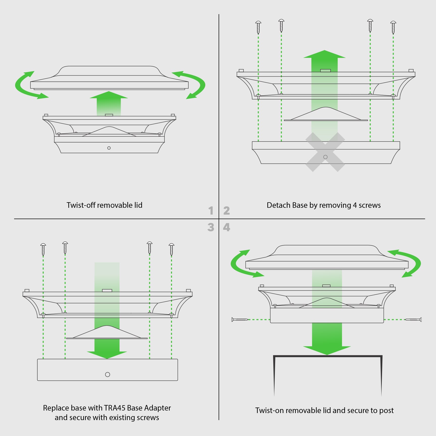 4.5" x 4.5" base will easily replace the existing 4x4 base of item # SL211R (simply remove the 4 screws located on the inside of the lens of the 4x4 base and replace with the 4.5" x 4.5" base)
