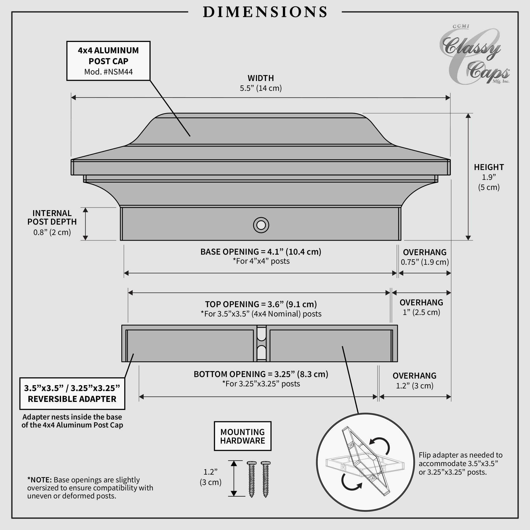 Crafted from heavy-duty cast aluminum, this versatile post cap is designed to fit three standard post sizes: 4"x4", 3.5"x3.5", and 3.25"x3.25". Its robust construction ensures long-lasting performance, while the sleek, modern design adds a touch of sophistication. Perfect for enhancing the appearance of your fence, deck, or posts, the Classy Caps 4x4 Aluminum Post Cap not only protects your posts from weathering and decay but also elevates your exterior decor. Easy to install and maintenance-free, this post cap is the ideal finishing touch for any project.