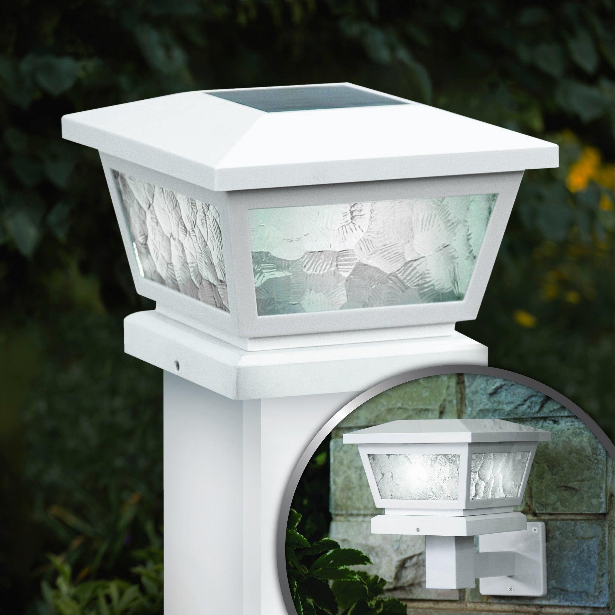 The novel all-weather versatile White Fairmont Solar Post Cap can be used for post or wall mount with easy installation. It is complimented using real pebbled glass and two high-output LED's that will cast a brilliant white light. Will fit over 3 post sizes - 5x5, 4x4, or 3.5x3.5" post. (Wall adaptor included)