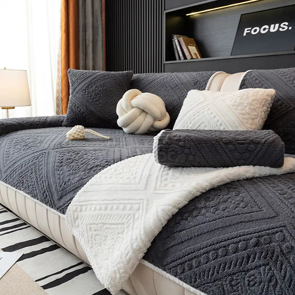 • Intricate Carved Jacquard Plush: Crafted with premium textured plush and woven in a delicate raised pattern, this cover delivers a soft, dimensional feel that elevates your sofa into a statement piece. The intricate design adds an artisanal touch—rich in texture, never flat.