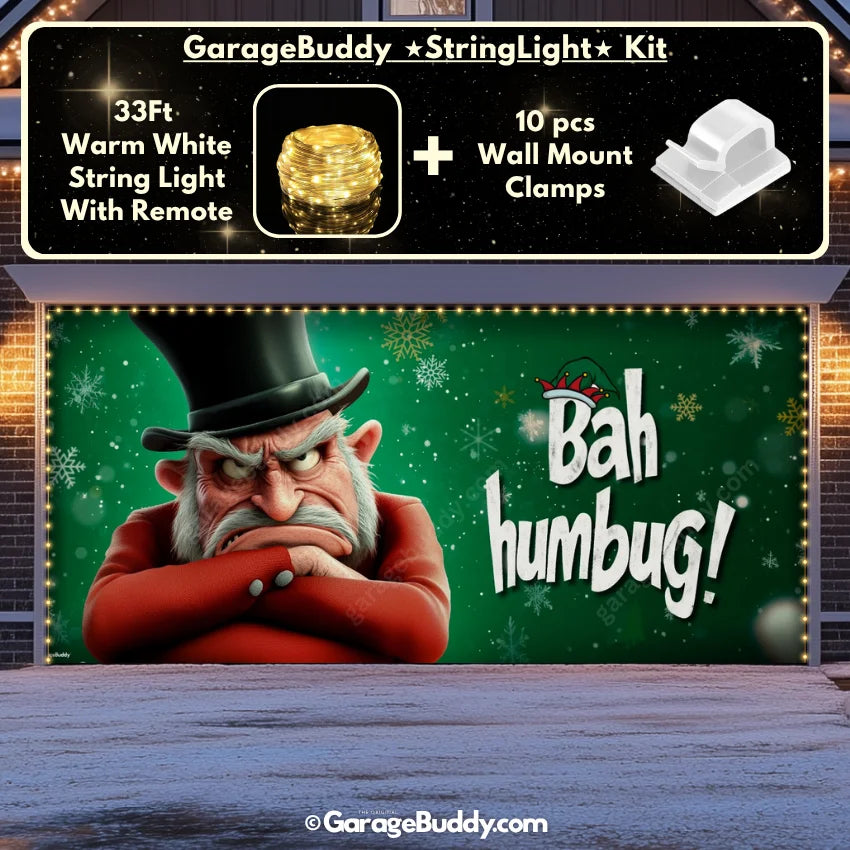 You now have the option to add the GarageBuddy string light kit at 50% off and turn your garage into a true showstopper. Pair your Bah Humbug Holiday Garage Door Cover with glowing outdoor Christmas lights to make your home the talk of the block.
