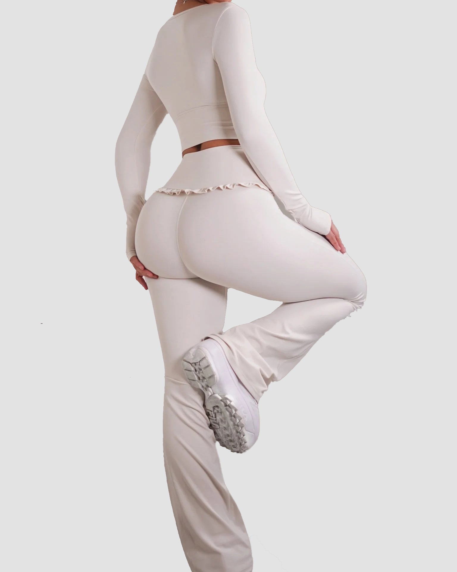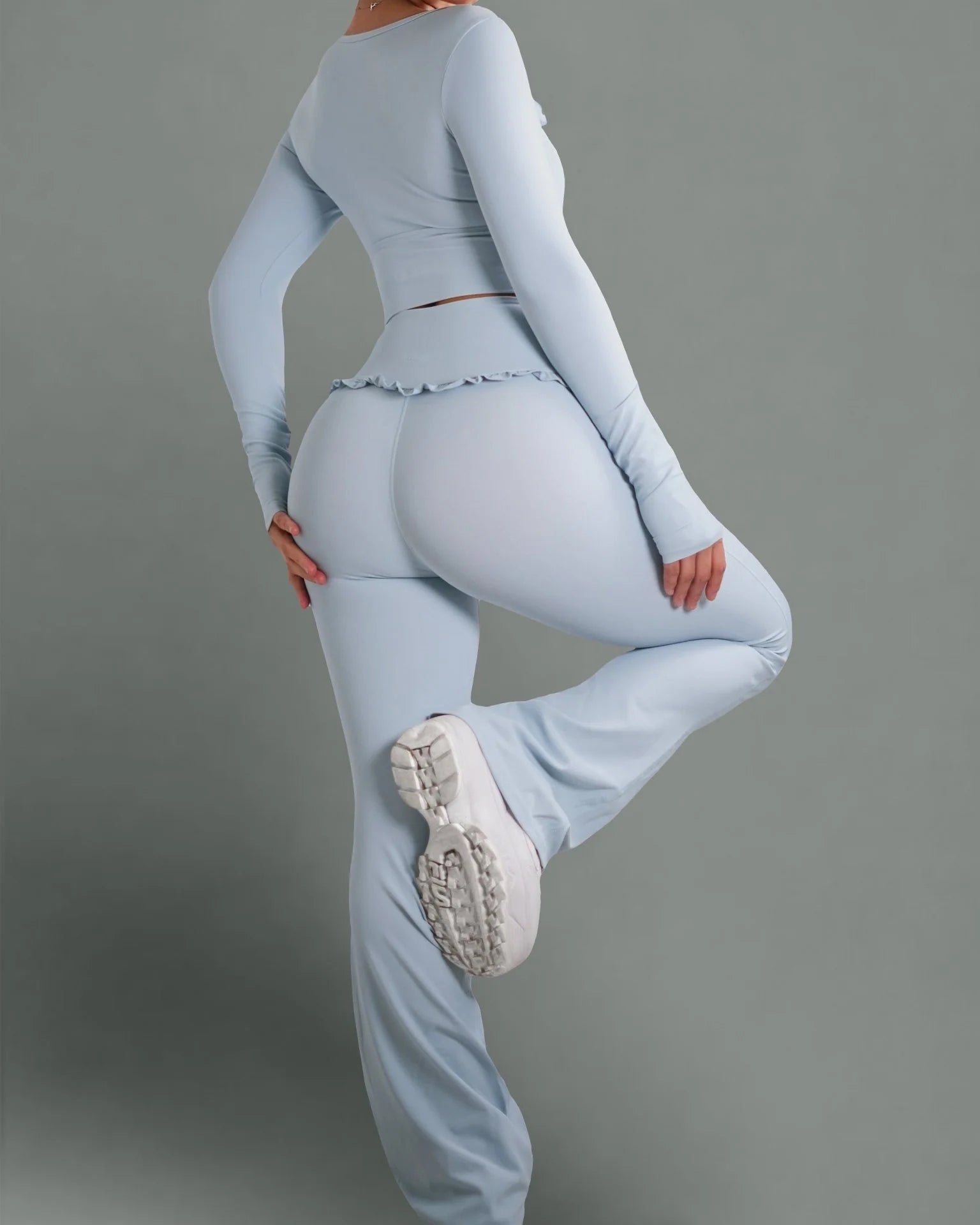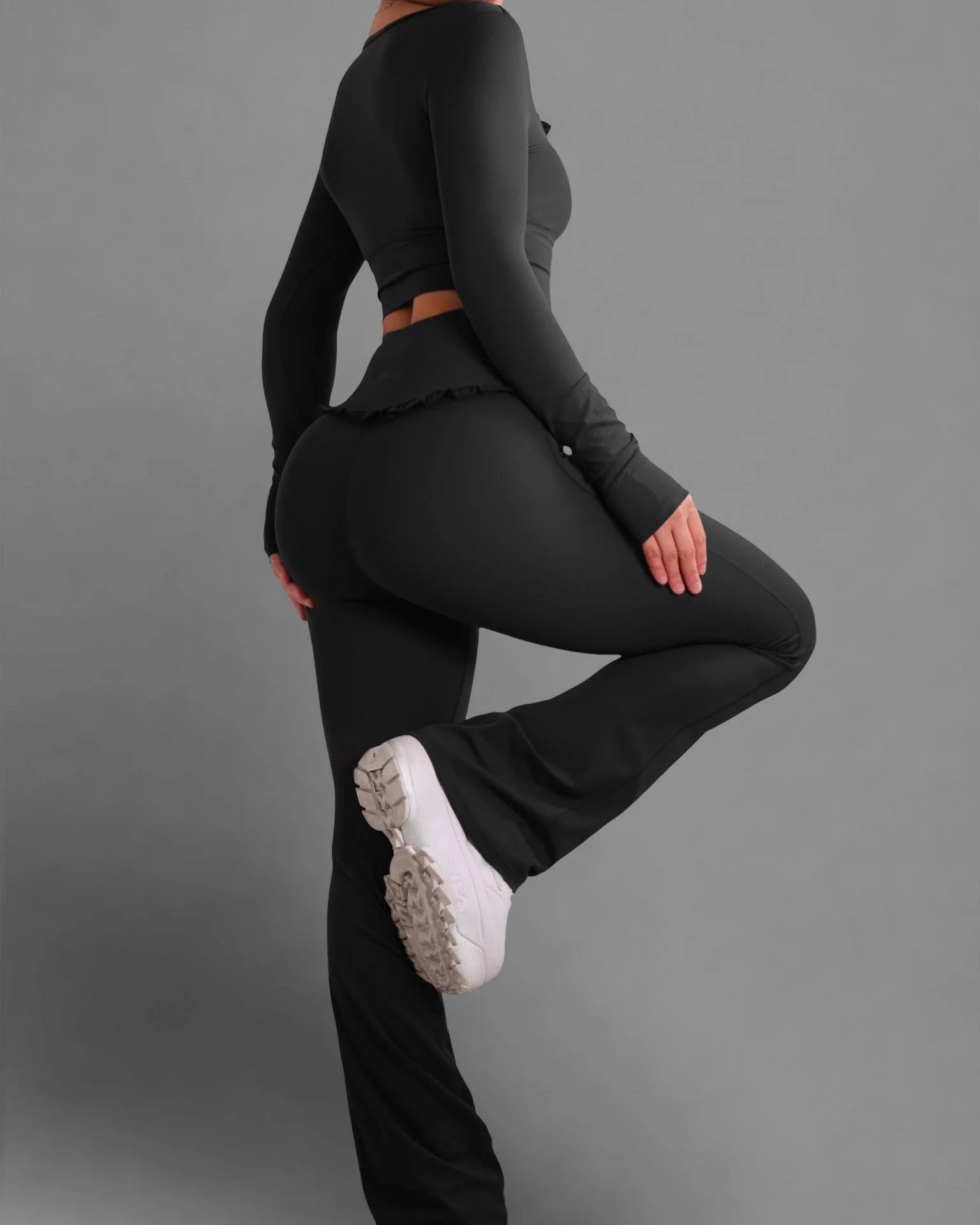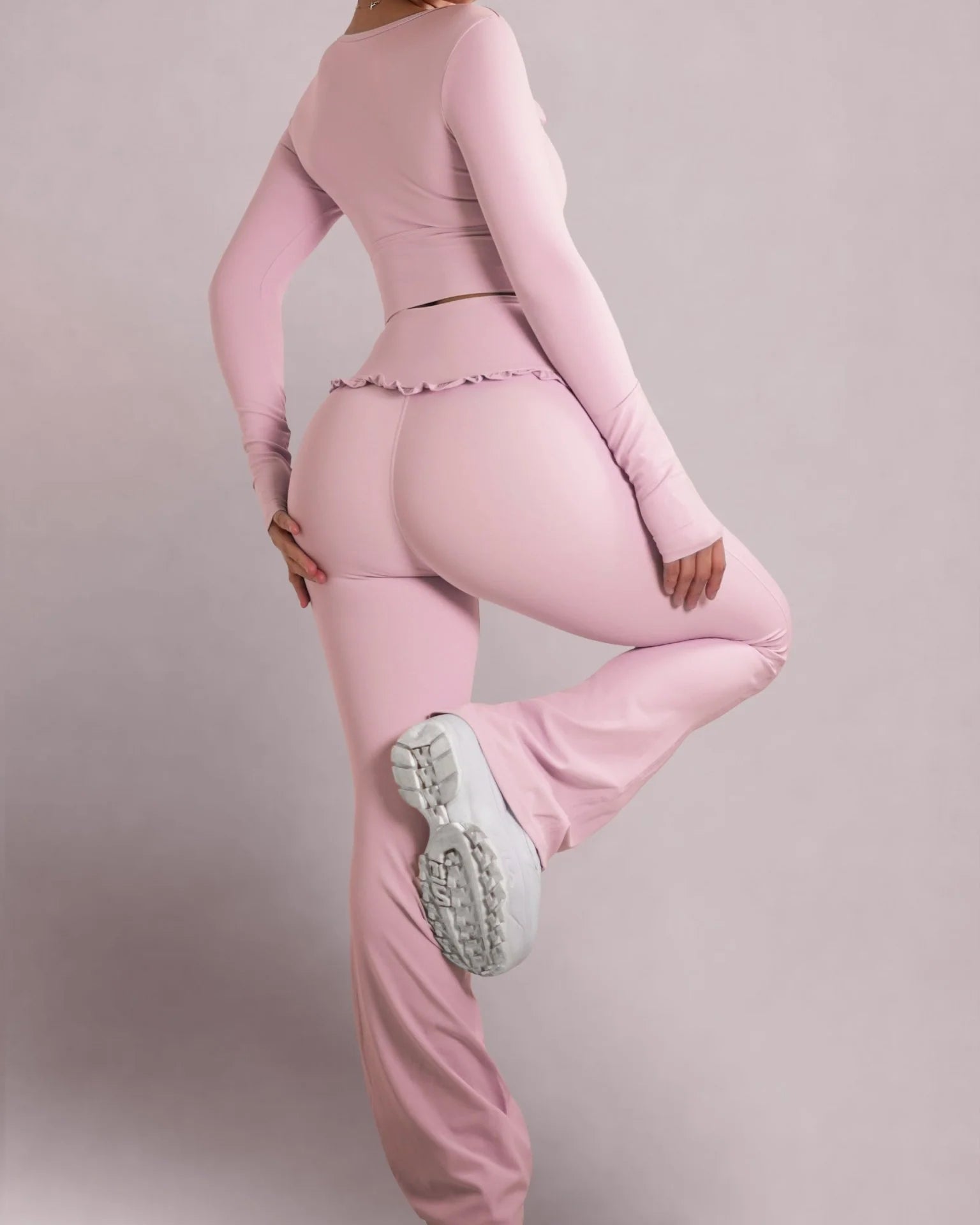 • High-waisted flare design for a long-leg, ballet-inspired silhouette