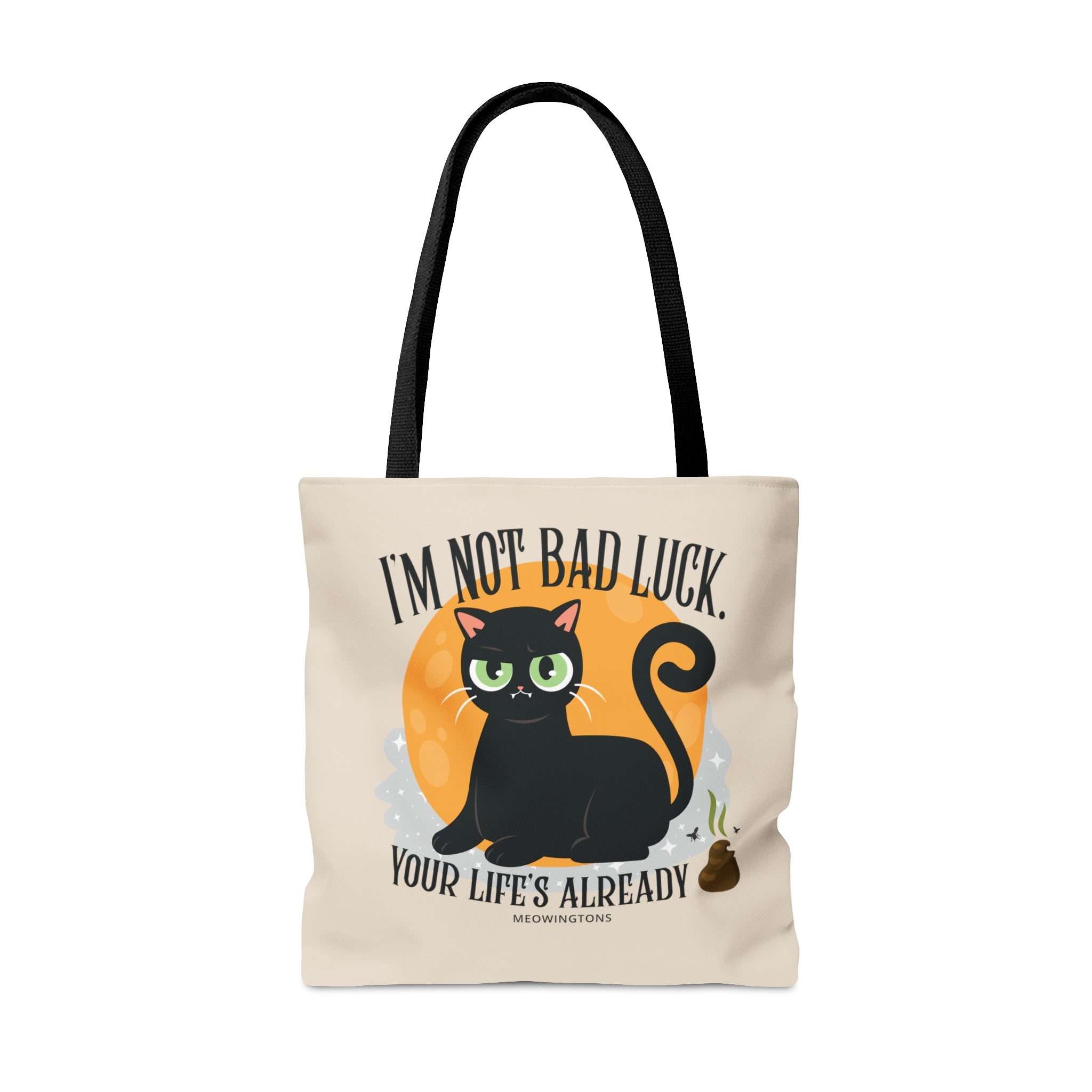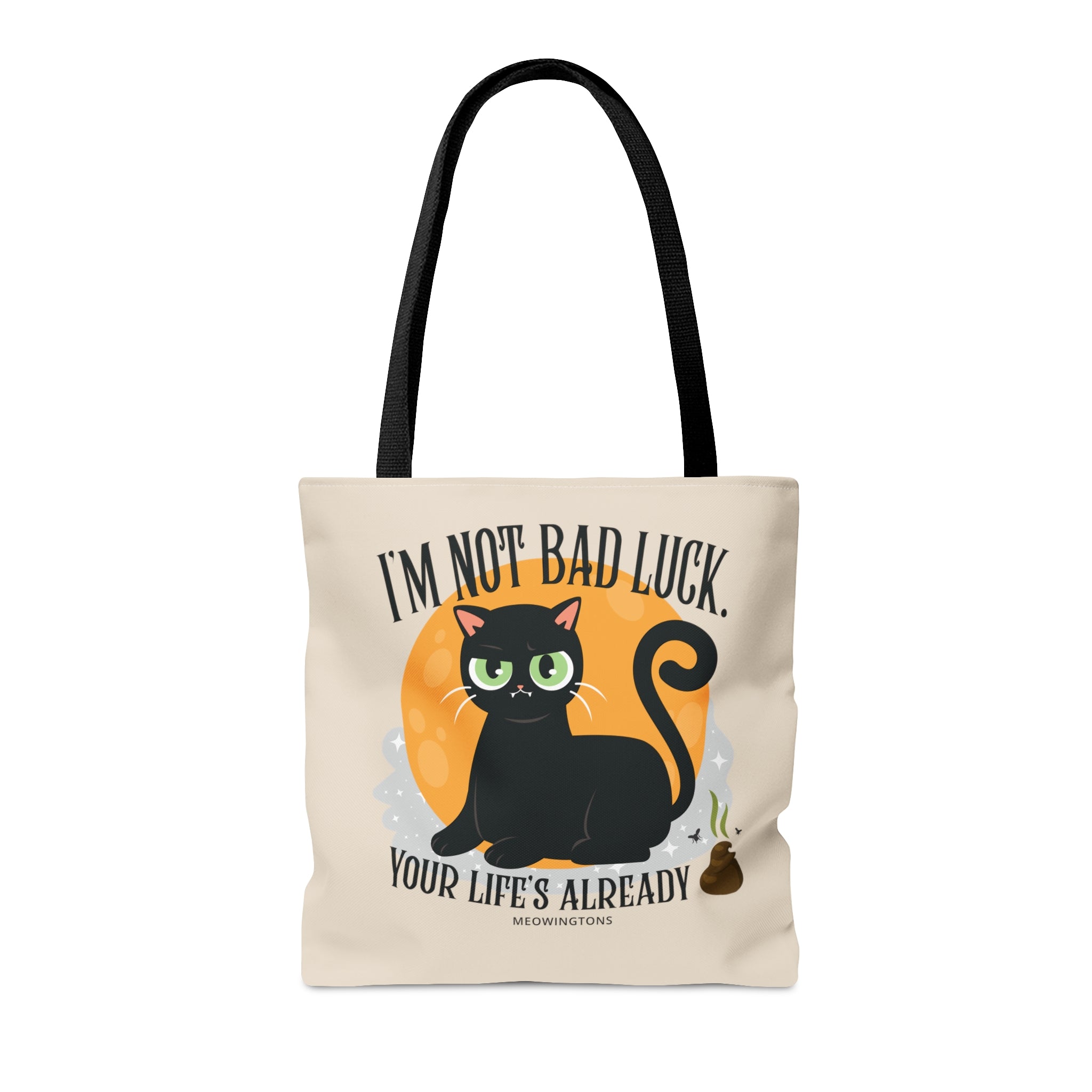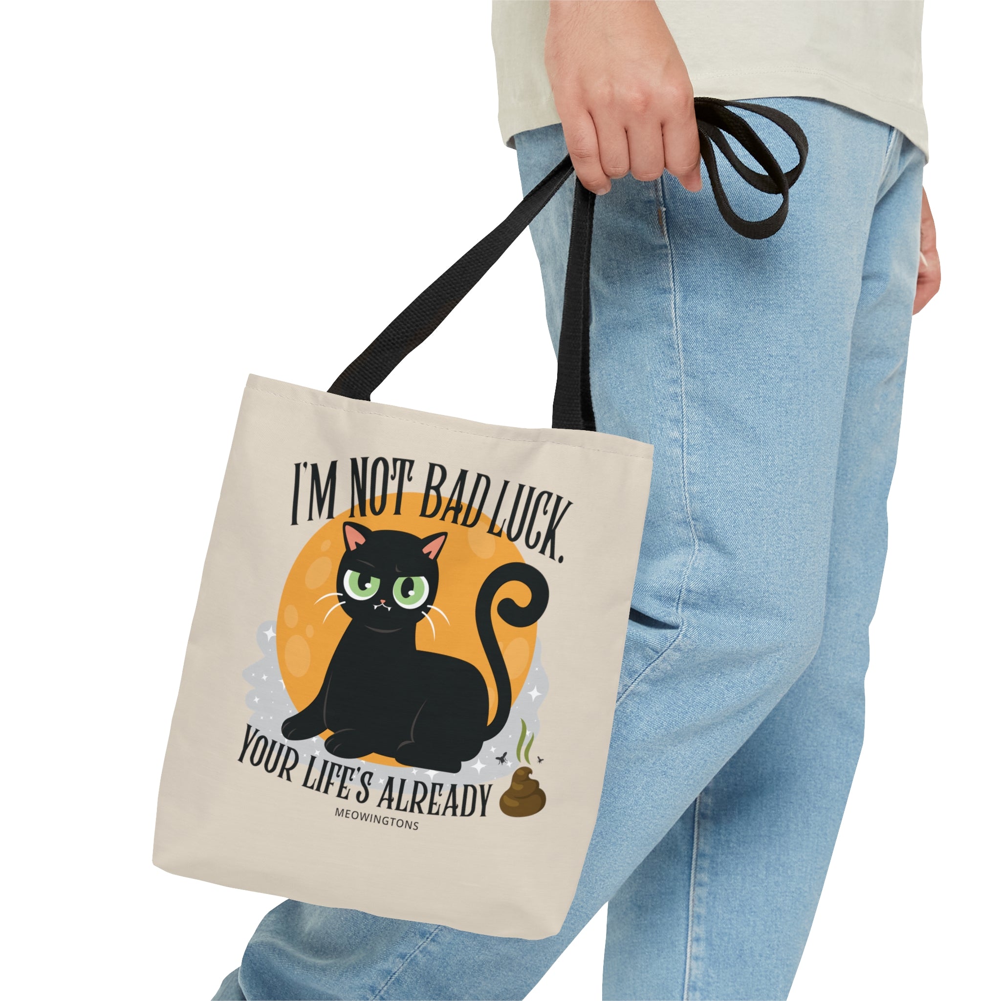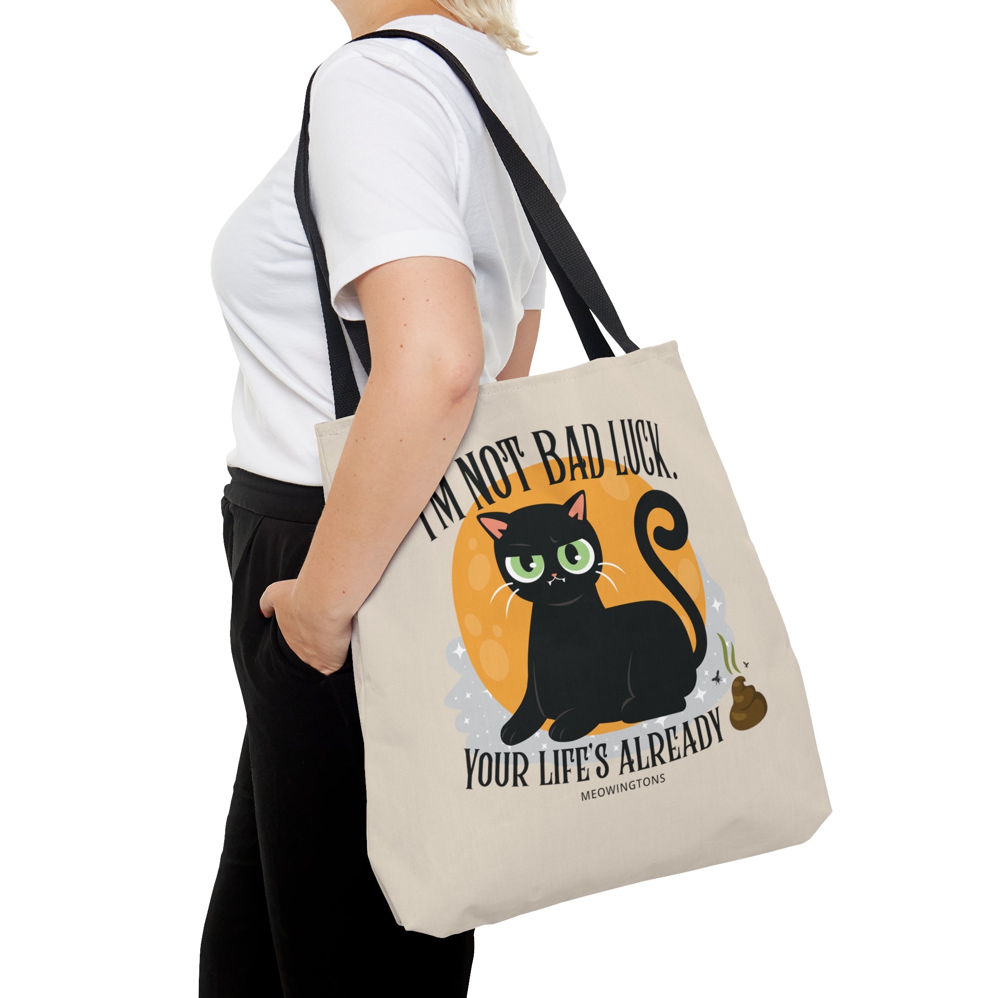 Introducing our Black Cats Aren’t Bad Luck Tote Bag – the purr-fect blend of sass and style for this Halloween season! Have you ever met a cat with more attitude than a black cat under a full moon? This cat tote bag features a cheeky black cat silhouetted against a glowing moon, and it's here to set the record straight: Black cats aren't bad luck, your life was already shitty. With a sense of humor as sharp as their claws, this cat knows how to keep it real during Halloween (or any time of year). With its wide bottom and boxed corners and added stability, this tote will totes tote your tote-ables, whether it’s groceries, knitting supplies, or your ever-growing crystal collection on their way to charge under the full moon.