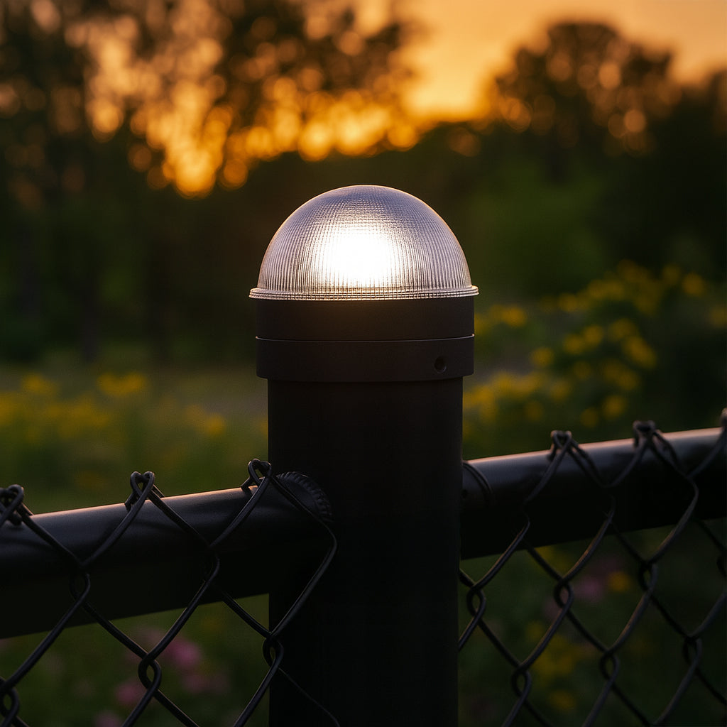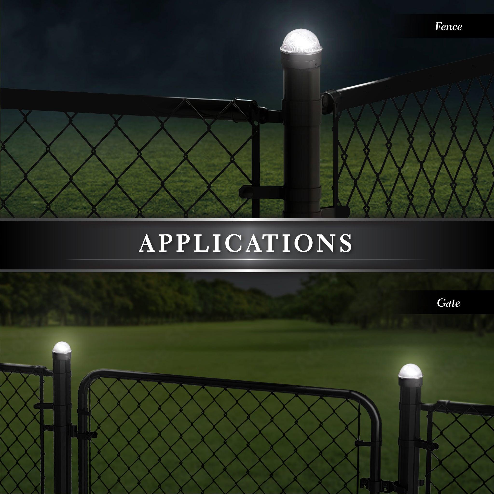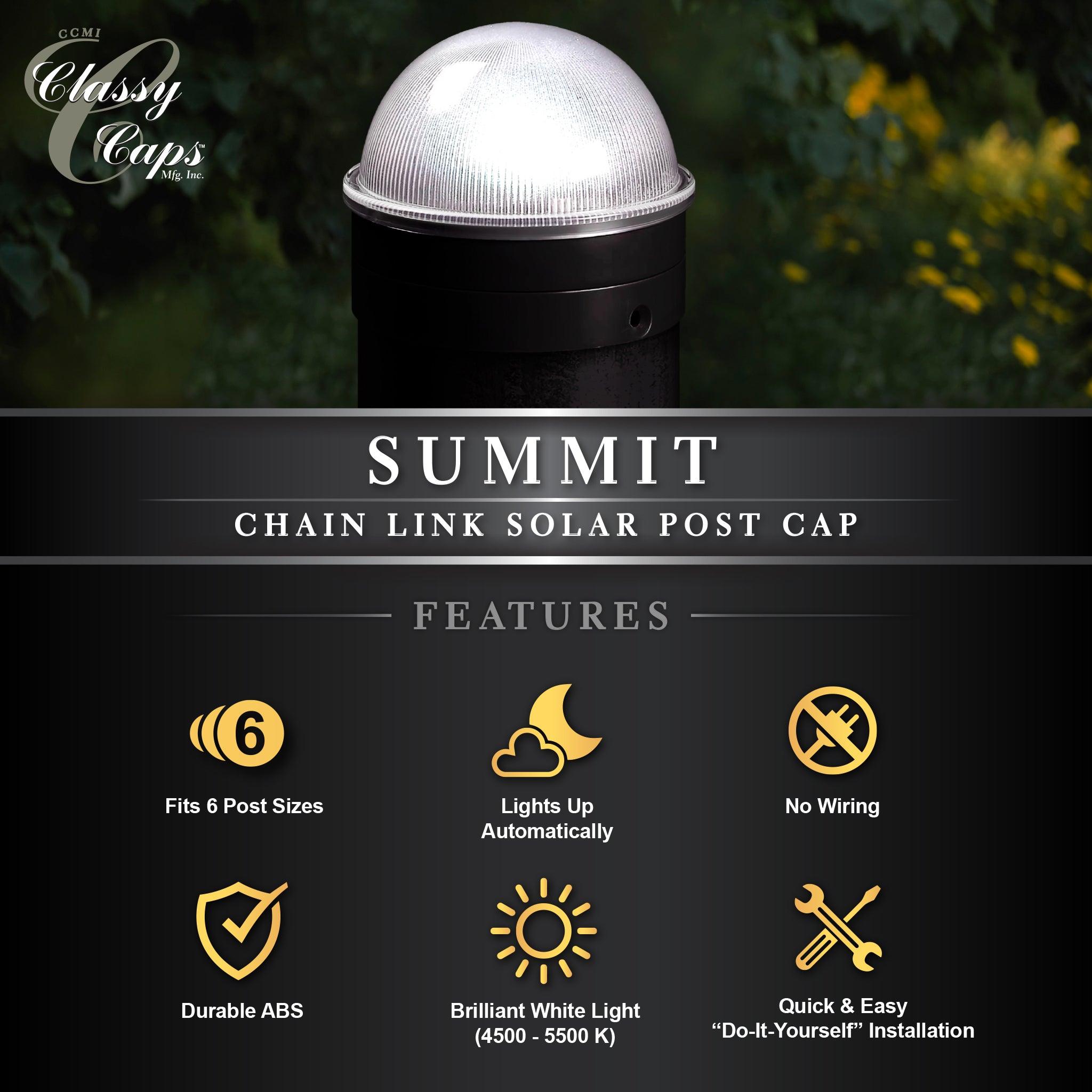 Add a touch of class to your chain link fence with our high performance Summit solar post cap. This one of a kind design by Classy Caps will compliment your existing chain link posts. Turns on automatically every night casting a brilliant white light onto the surrounding area. Manufactured to fit over six standard chain link fence posts - 3" dia., 2-7/8" dia., 2.5" dia., 2-3/8" dia., 2" or 1-7/8" dia.