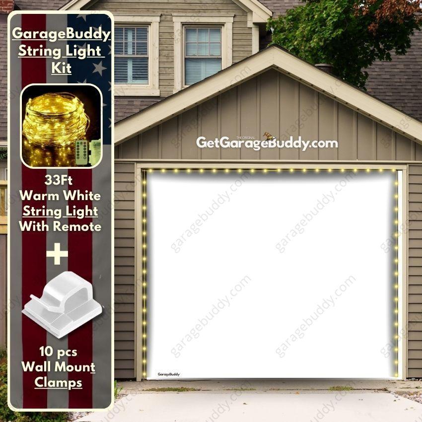 You now have an option to add the GarageBuddy string light kit to your order at 50% off and turn your garage into a true winter wonderland. The kit includes 1x 33 ft warm white string light, a remote control and 10x sticky wall mount clamps. The 2-door garage option comes with 2 string light kits. The lights work on three AA batteries (not included), so you don't need to run around finding electrical outlets.