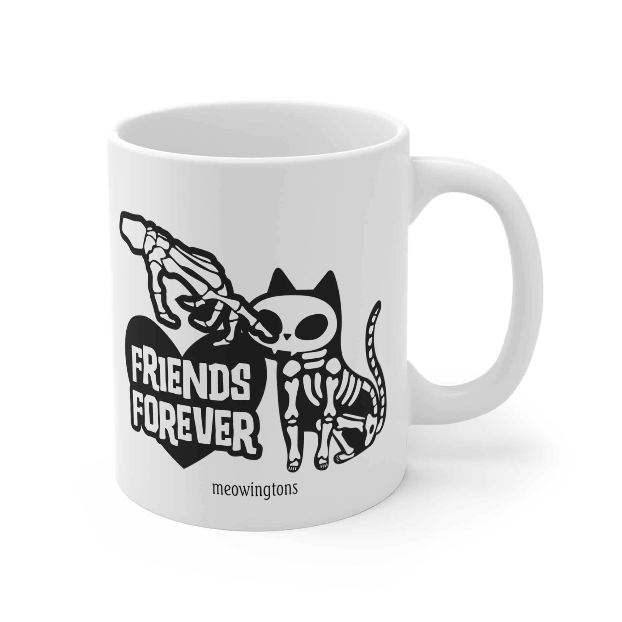 Who says skeletons can't have a soft side? This cute cat mug features a cute and cuddly skeleton cat getting its nose booped by his best friend furever. It's a heartwarming reminder that even in the afterlife, friendships can be as strong as bone! "Friends Forever" is the motto, and it couldn't be truer.