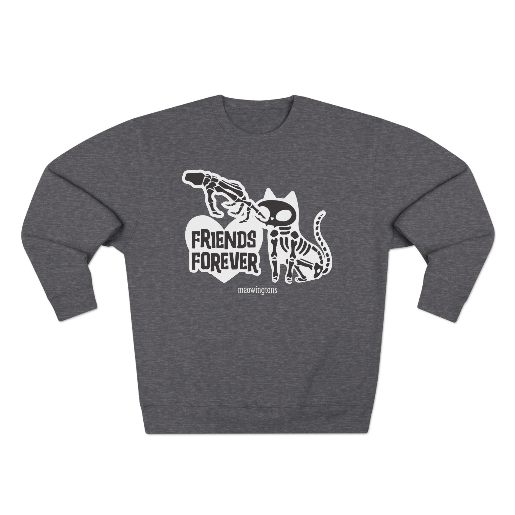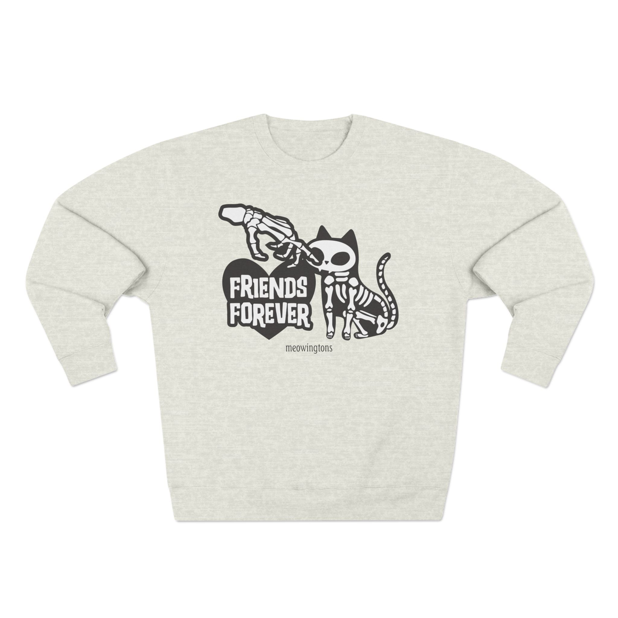 Who says skeletons can't have a soft side? This cute cat mug features a cute and cuddly skeleton cat getting its nose booped by his best friend furever. It's a heartwarming reminder that even in the afterlife, friendships can be as strong as bone! "Friends Forever" is the motto, and it couldn't be truer. Each premium crewneck sweatshirt is soft to the touch and crafted from a blend of recycled polyester and breathable cotton to keep you cozy and warm on those chilly autumn days. Just in time for Sweater Weather, too!