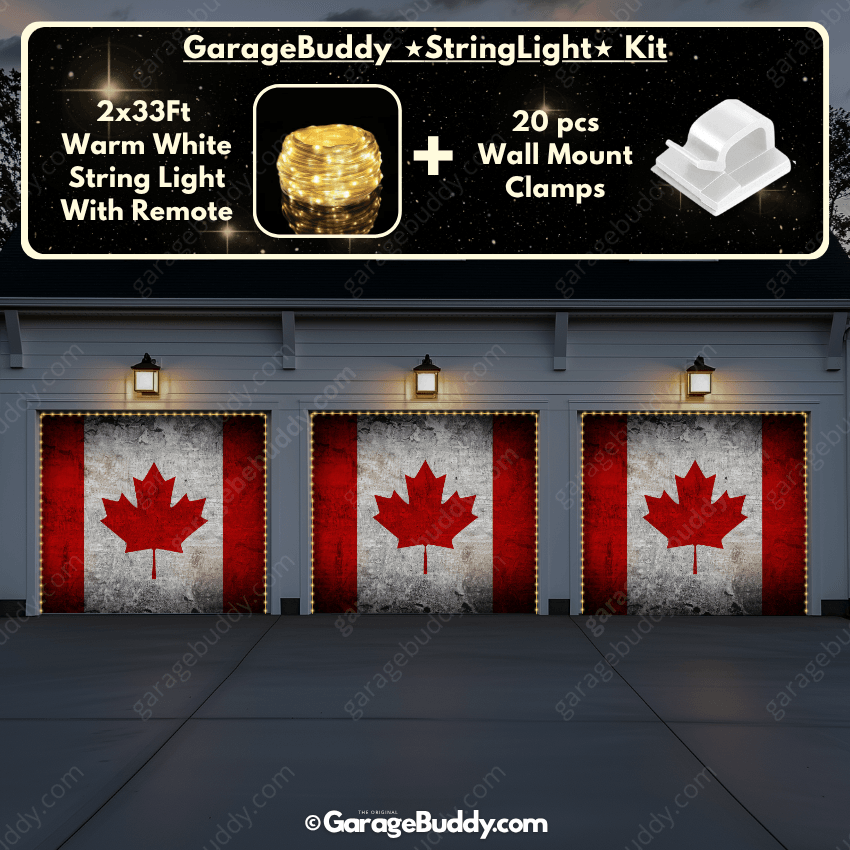 Take your patriotic setup to the next level with our GarageBuddy string light kit, now available at 50% off. Pair your Canada Flag (Rustic) Patriotic Garage Door Banner with glowing lights for a bold and festive effect. The kit includes 1x 33ft warm white string light, a remote control, and 10x sticky wall mount clamps. The 2-Door garage option comes with 2 string light kits. The lights work on three AA batteries (not included), so you don't need to run around finding electrical outlets.