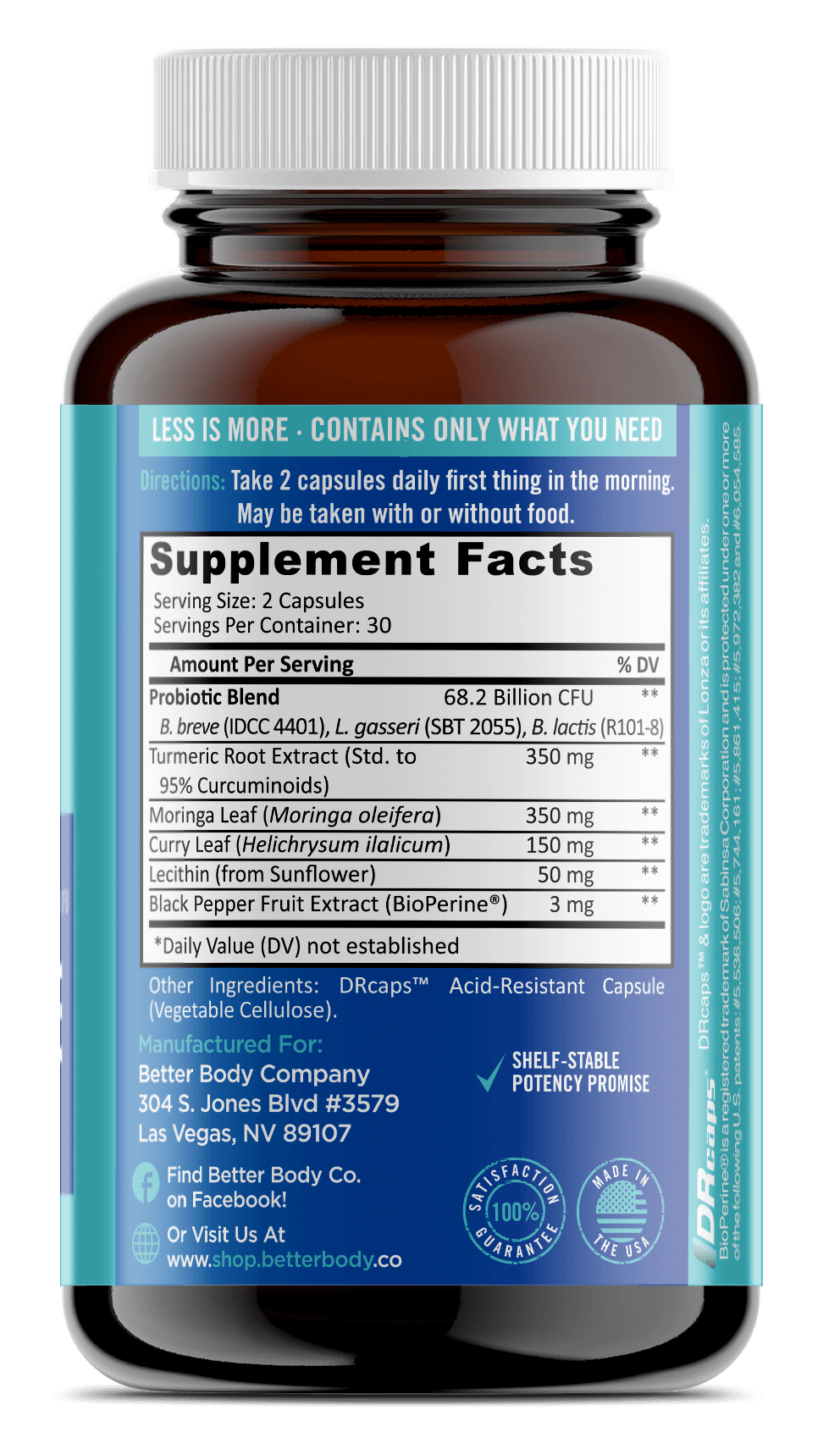 - Ingredients: L. gasseri, B. breve, B. lactis. PLUS, we've added the superblend of ingredients which include Turmeric extract, Moringa, Curry leaves, BioPerine®, Sunflower lecithin
