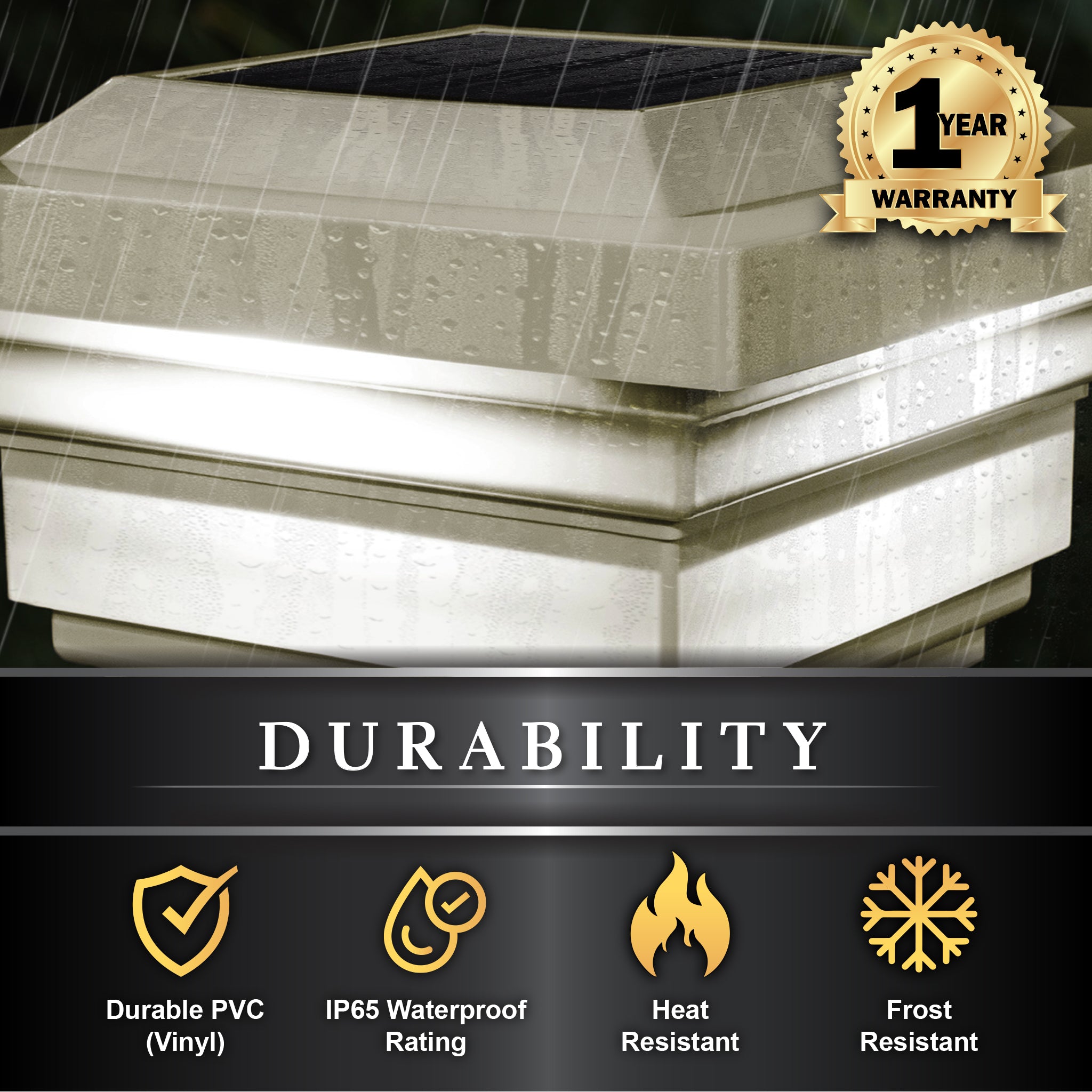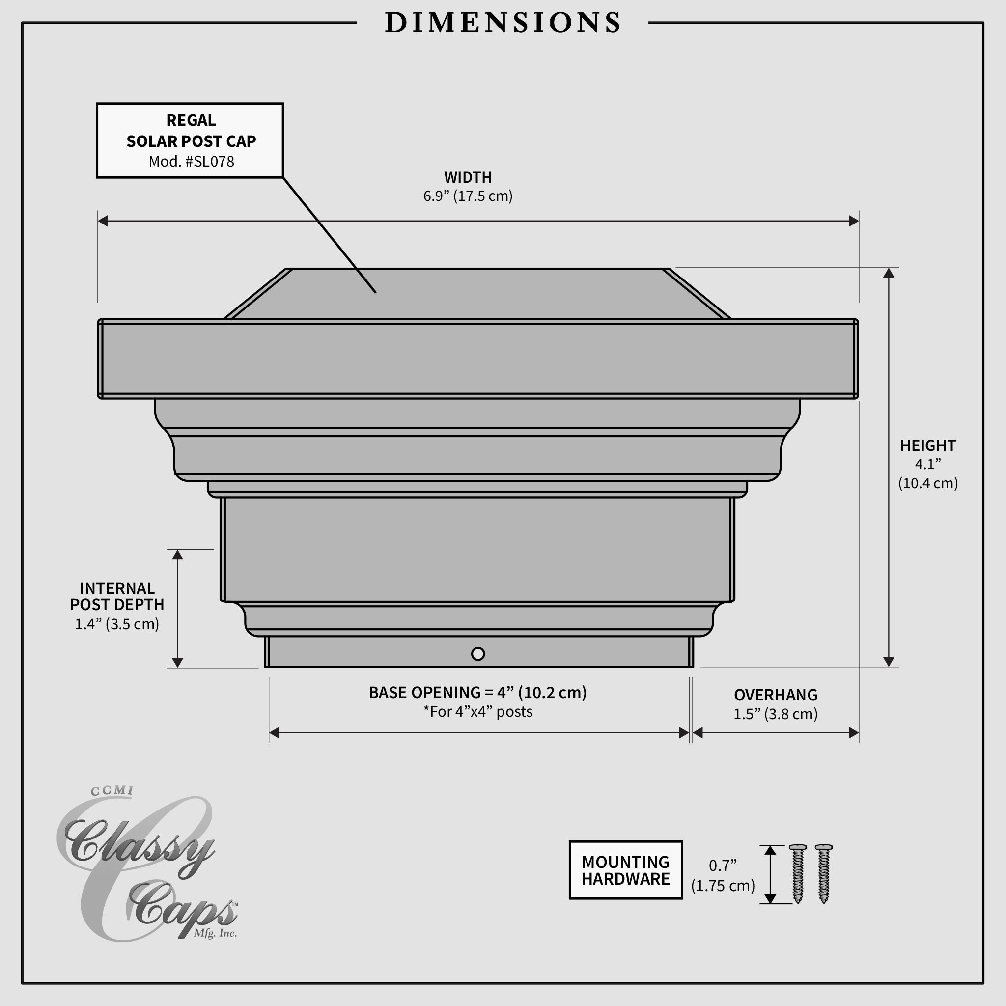 The attractive low-profile design of the Classy Caps Regal Solar Post Cap will add beauty and elegance to your deck, fence, or gardens. Four surface-mount LEDs cast a brilliant white light downward onto the post and surrounding area for up to 12 hours. The high-quality, durable PVC construction will not fade, crack or yellow. Easily installs on an actual 4”x4” post with included mounting screws. Three times brighter than standard LEDs.
