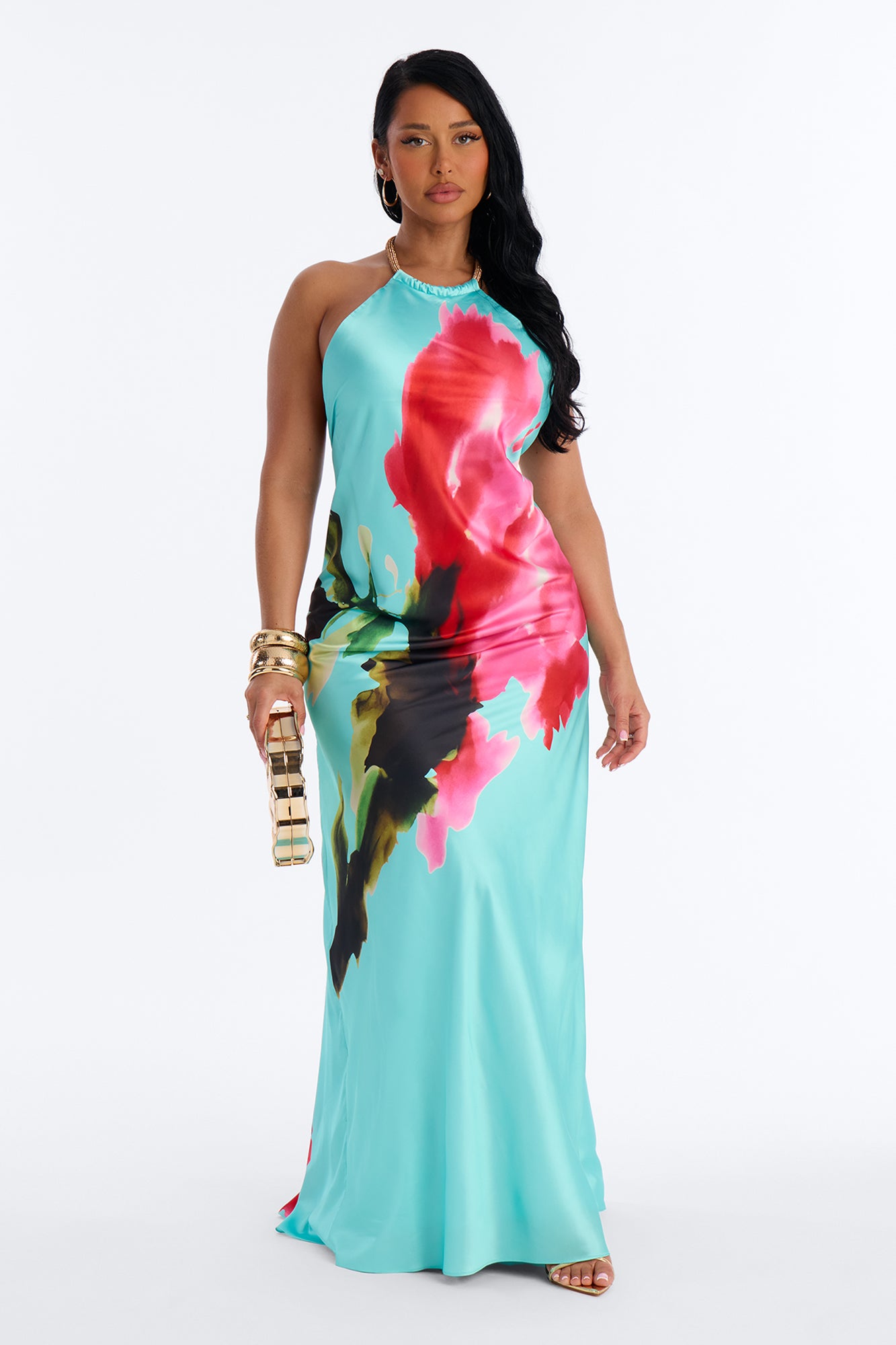 The Cordelia Sleeveless Satin Maxi Dress - Turquoise/combo is currently on sale for $89.99 (originally $89.99, save 0%). Price includes free shipping on orders over $49.