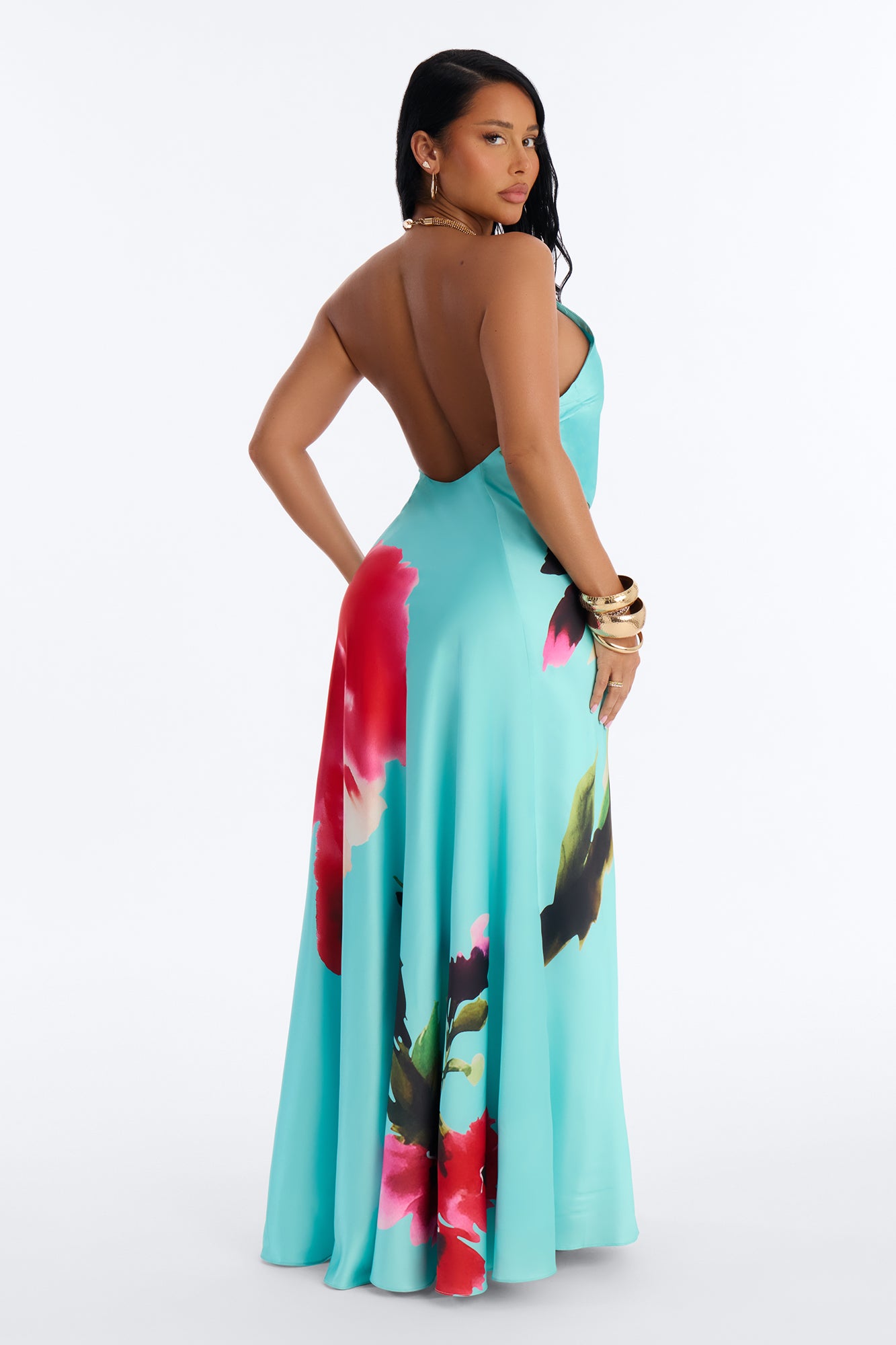 The Cordelia Sleeveless Satin Maxi Dress - Turquoise/combo is available in the following options: XS, S, M, L, XL. Check the product page for current stock availability.