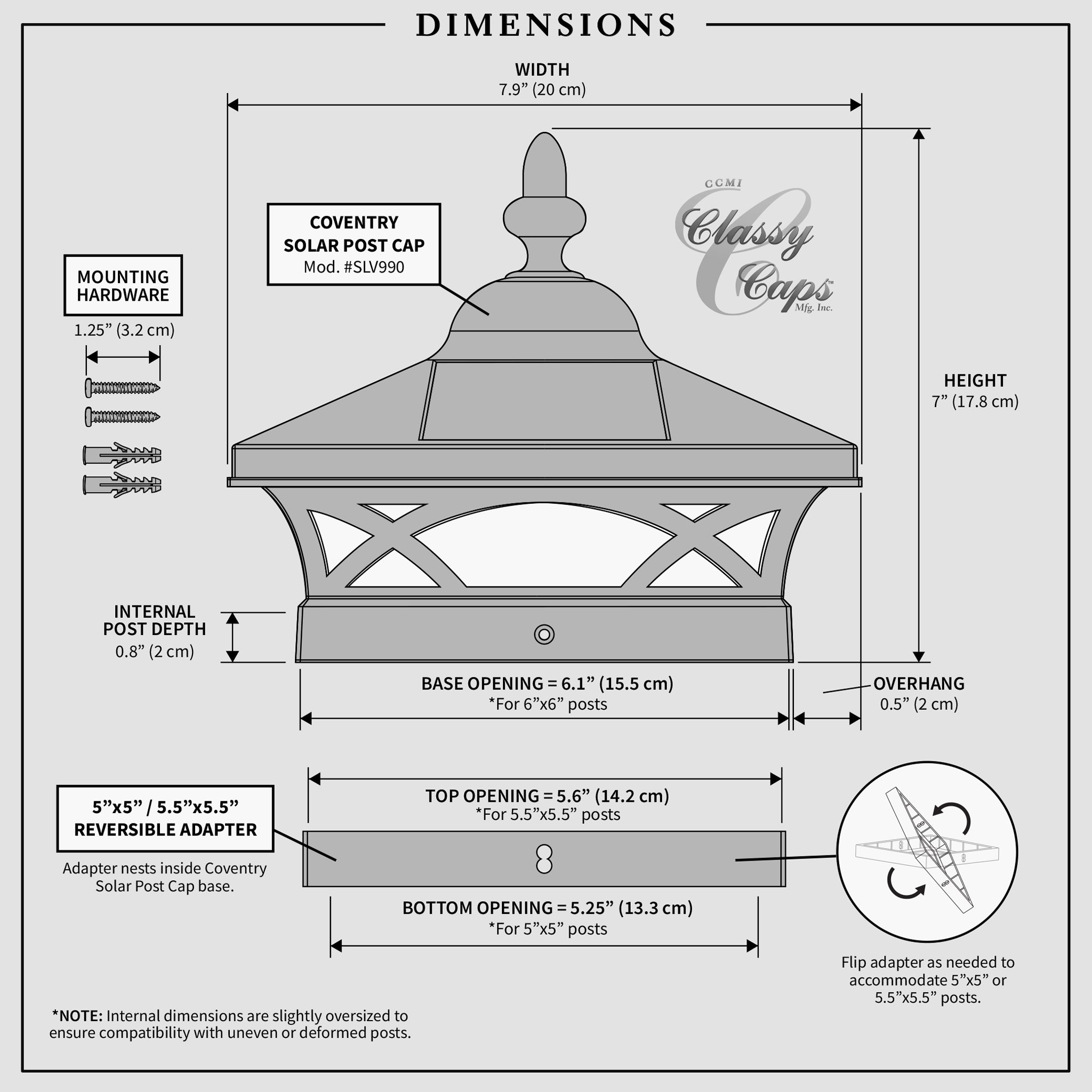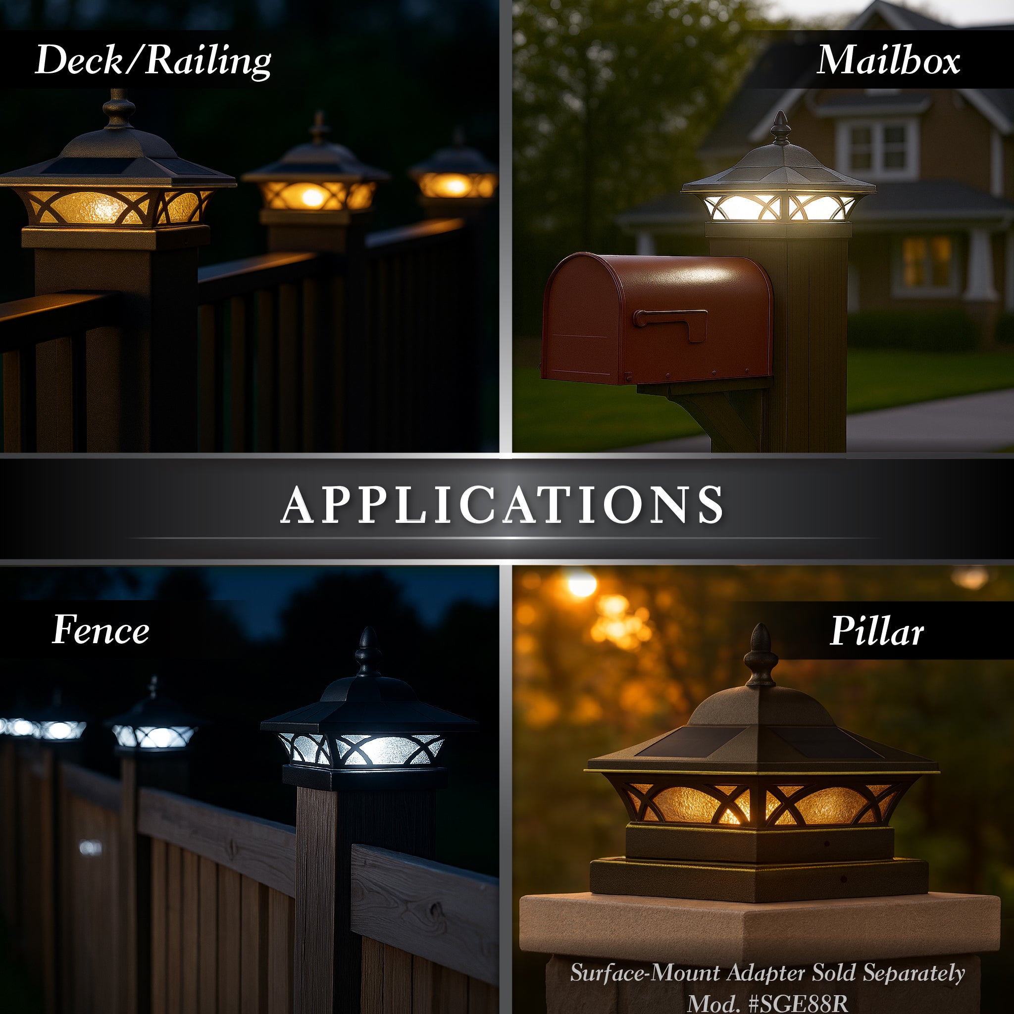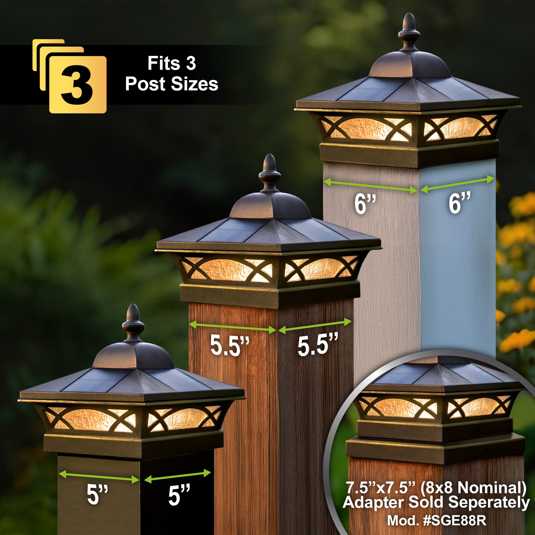 Designed for versatility, the Coventry Solar Post Cap fits seamlessly on 5"x5", 5.5"x5.5", and 6"x6” fence and deck posts (7.5“x7.5” adapter sold separately - Mod #SGE88R), making it the perfect addition to enhance your home's curb appeal. Elevate your outdoor ambiance with this exceptional solar lighting solution that blends beauty, functionality, and brilliant illumination.