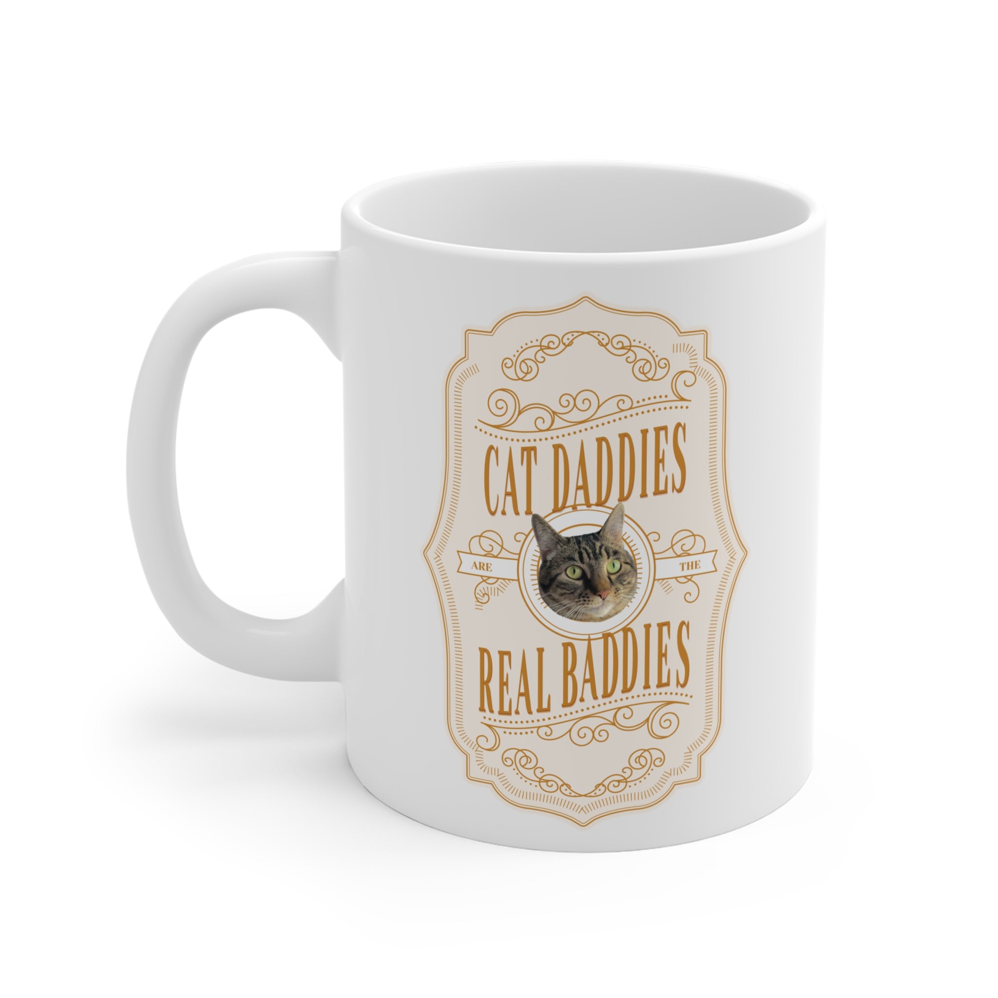The Custom Cat Daddies Are The Real Baddies Whiskey Label Cat Mug is currently on sale for $25.00 (originally $30.00, save 17%). Price includes free shipping on orders over $49.