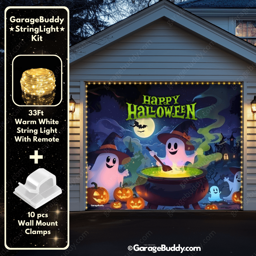 You now have the option to add the GarageBuddy string light kit to your order at 50% Off and turn your Halloween garage door cover into a true showstopper. The kit includes 1x 33 ft warm white string light, a remote control, and 10x sticky wall mount clamps. The 2-door garage option comes with 2 string light kits. The lights work on three AA batteries (not included), so you don’t need to run around finding electrical outlets.