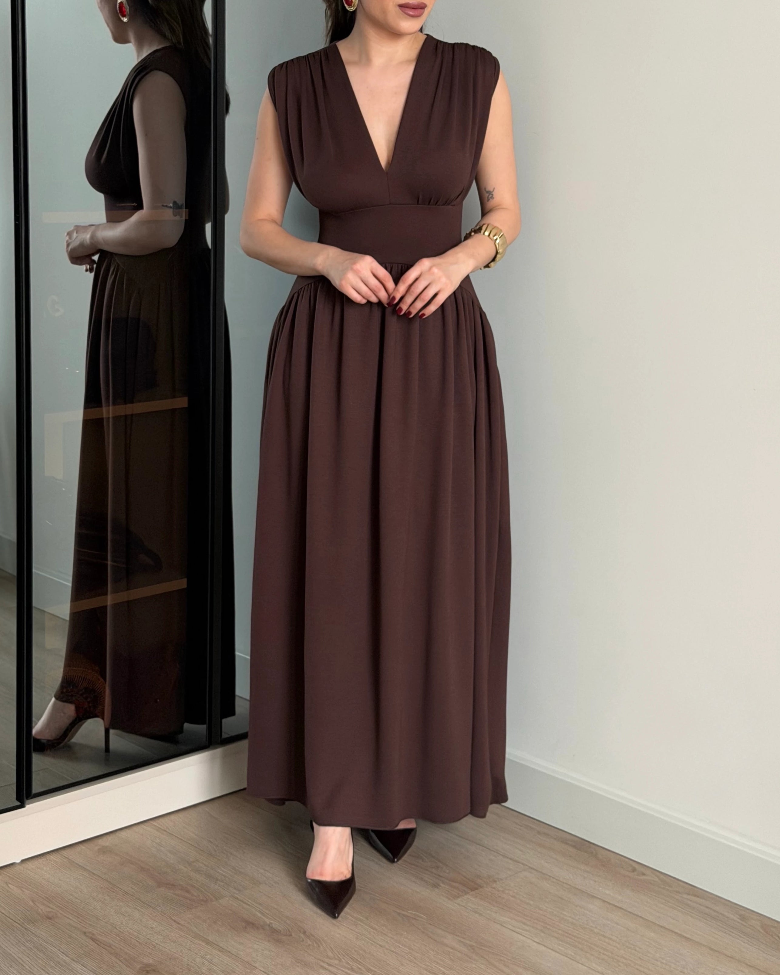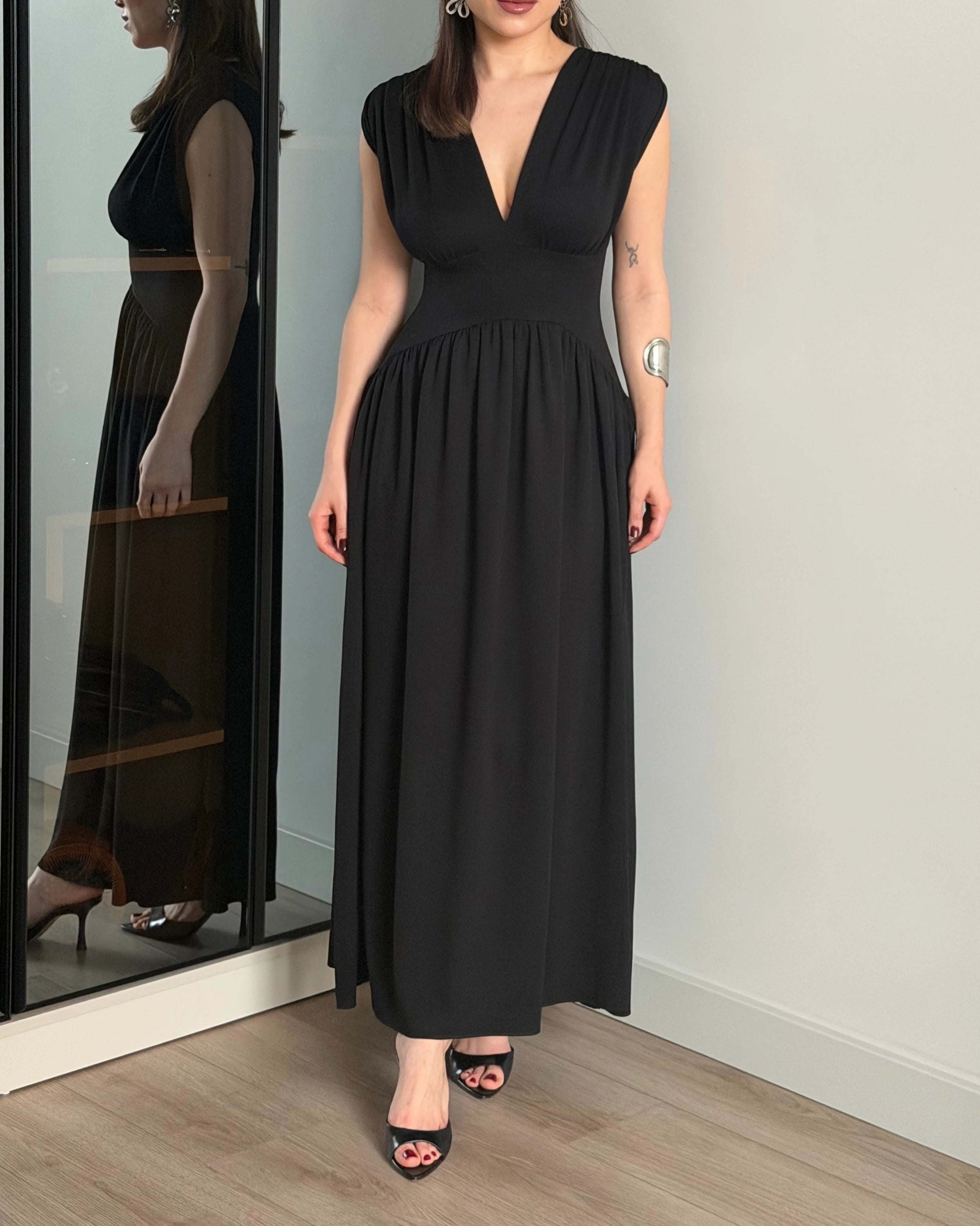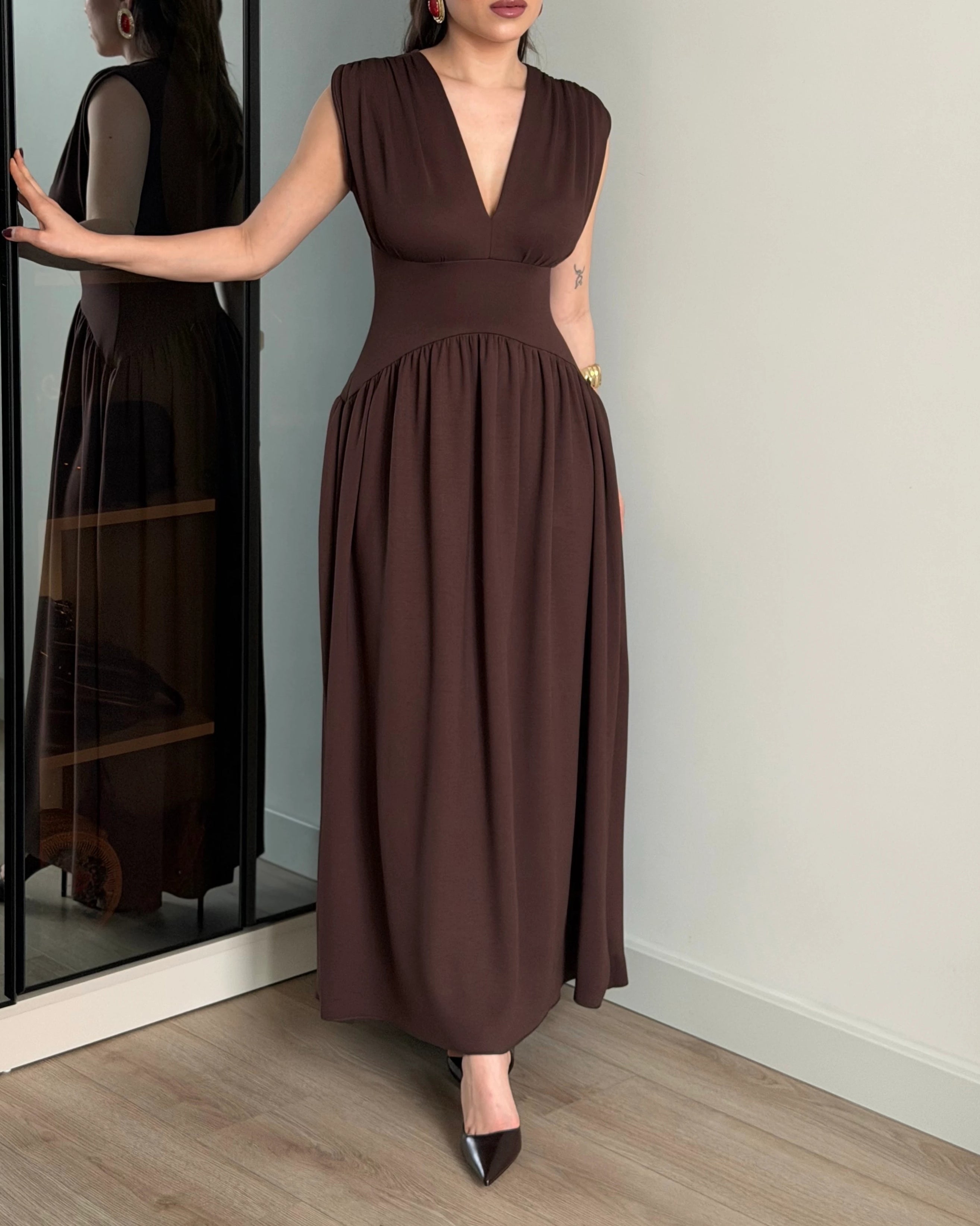 This deep V-neck sleeveless maxi dress perfectly balances elegance and a flattering silhouette! The deep V-neckline accentuates the neck, while the high waistline precisely defines the waistline. The naturally flowing skirt subtly conceals any tummy bulge or wide hips, creating a graceful, swaying movement with every step, showcasing feminine softness and confidence.