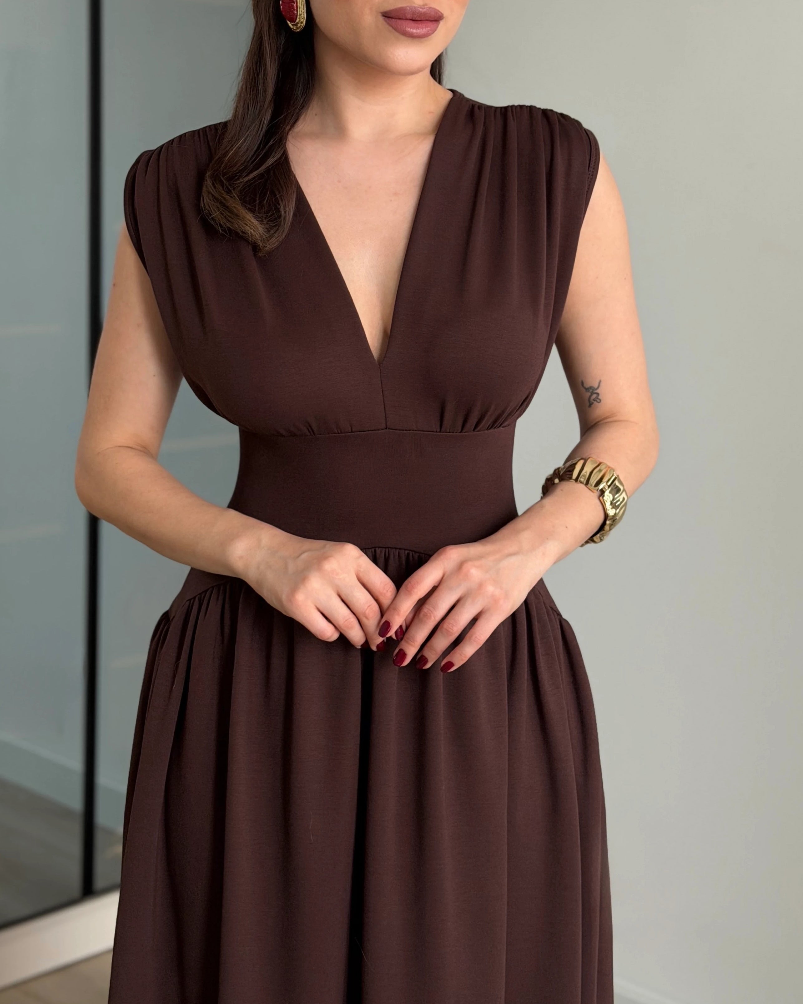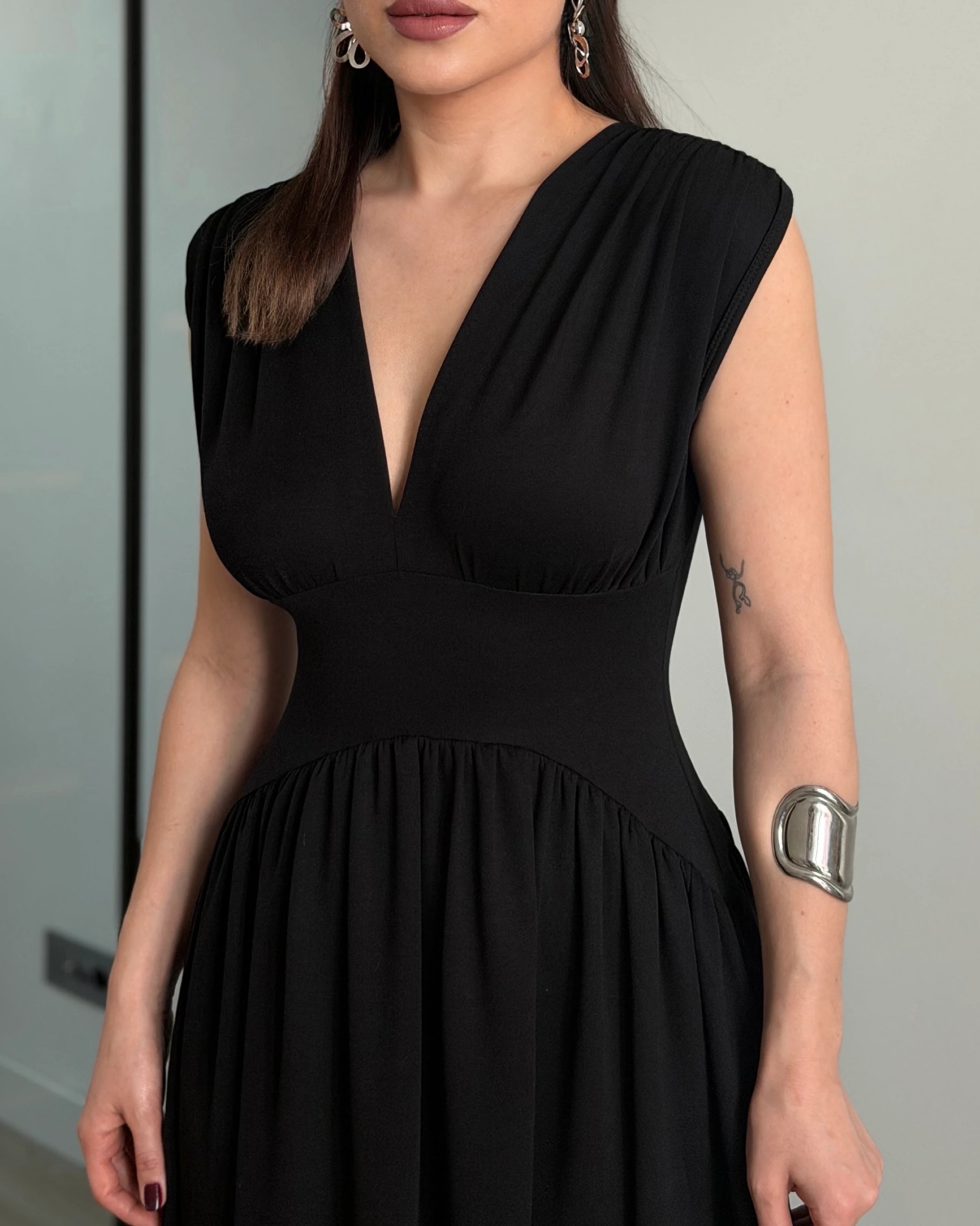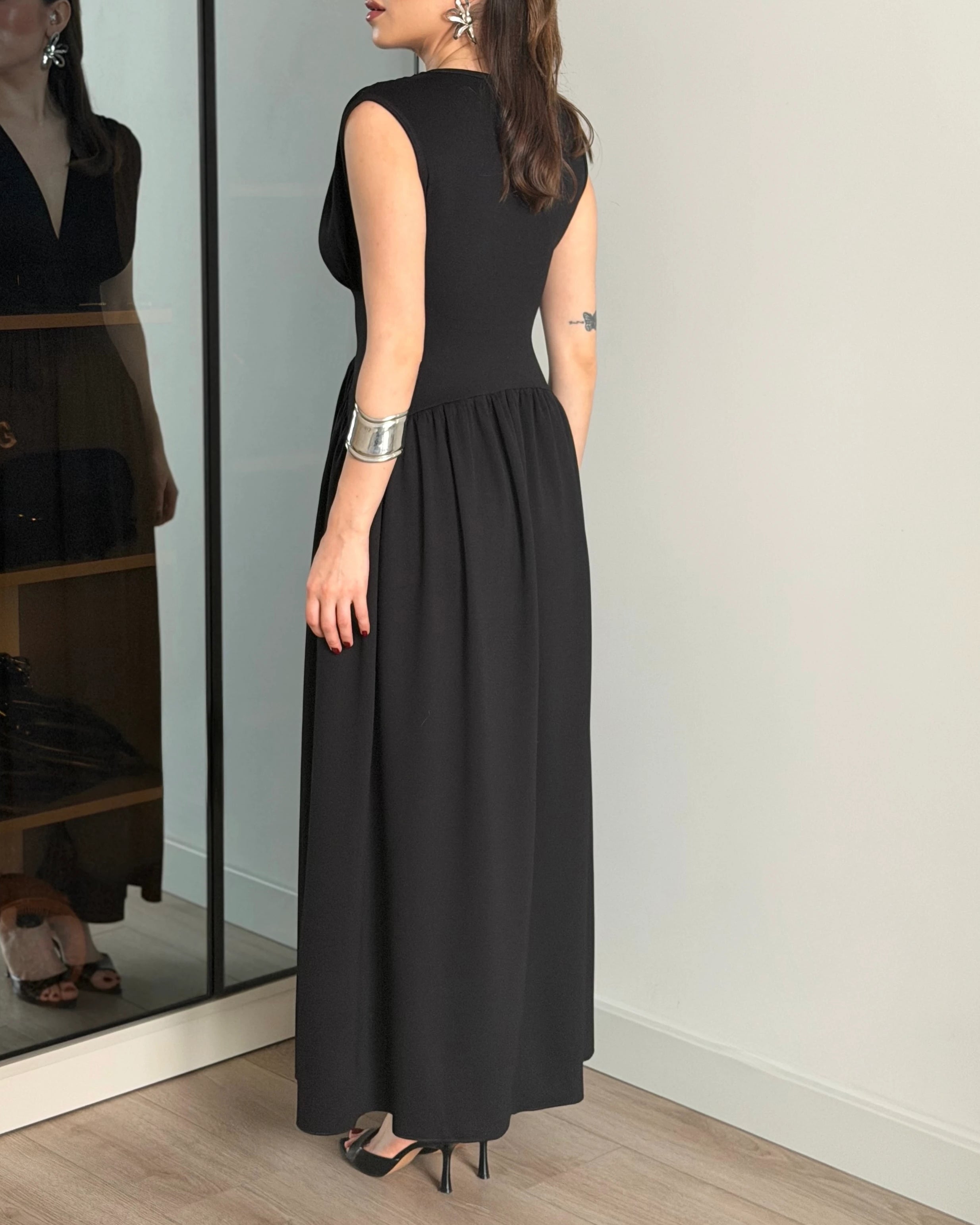This deep V-neck sleeveless maxi dress perfectly balances elegance and a flattering silhouette! The deep V-neckline accentuates the neck, while the high waistline precisely defines the waistline. The naturally flowing skirt subtly conceals any tummy bulge or wide hips, creating a graceful, swaying movement with every step, showcasing feminine softness and confidence.