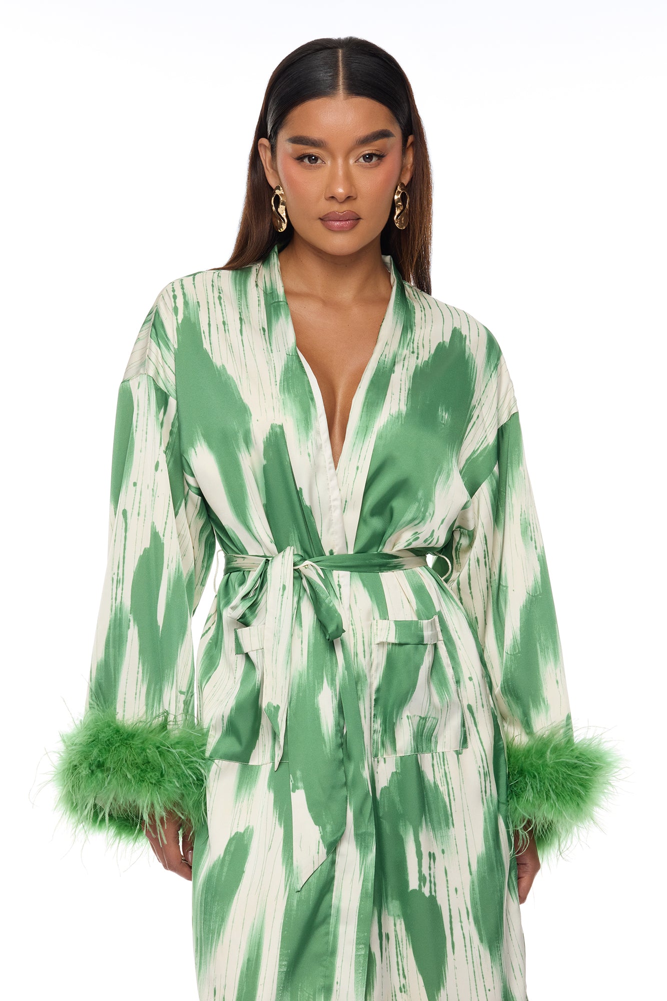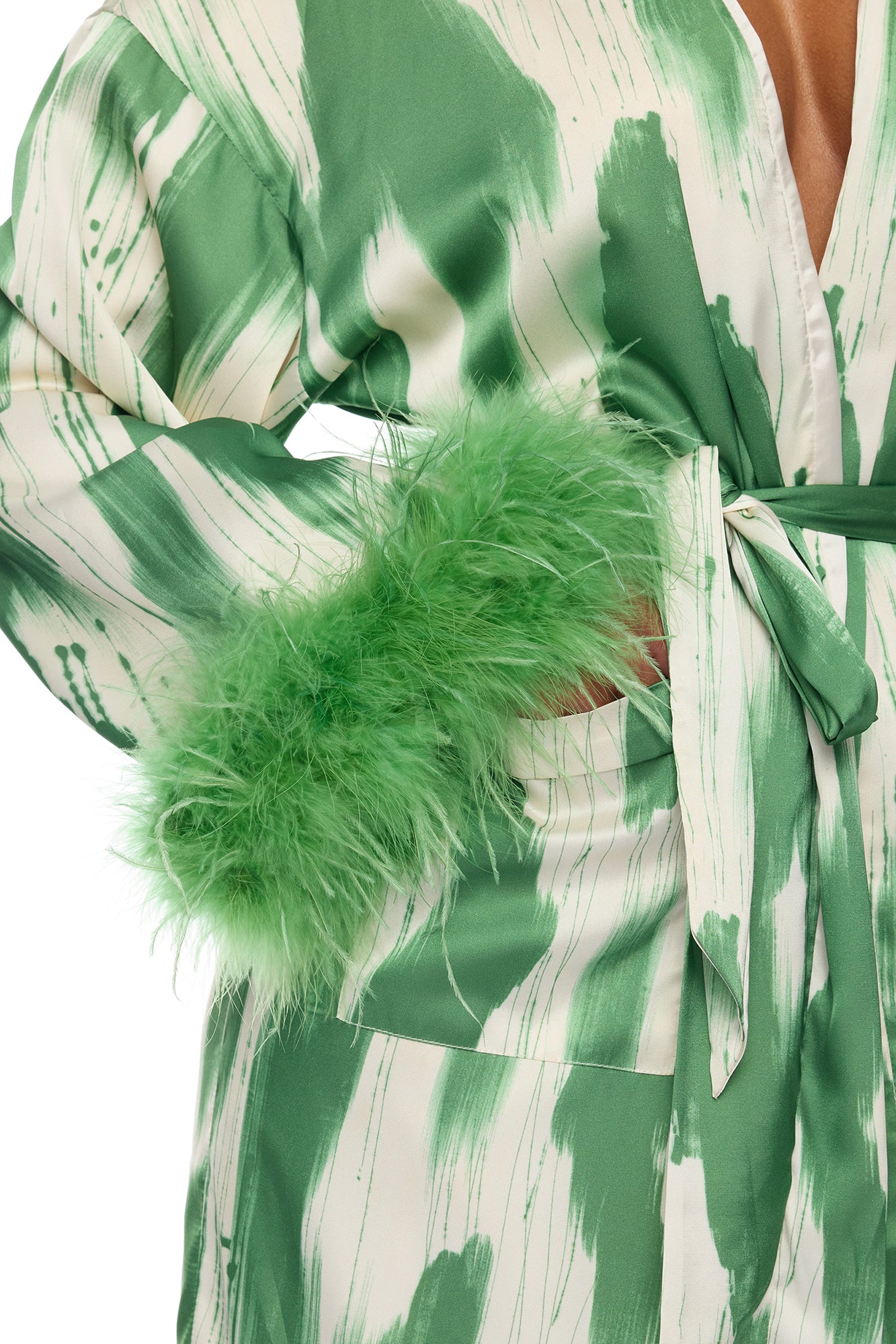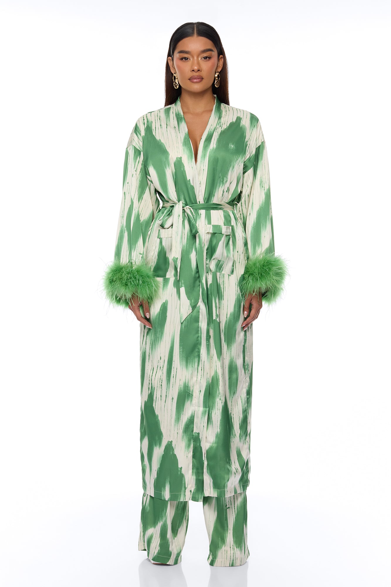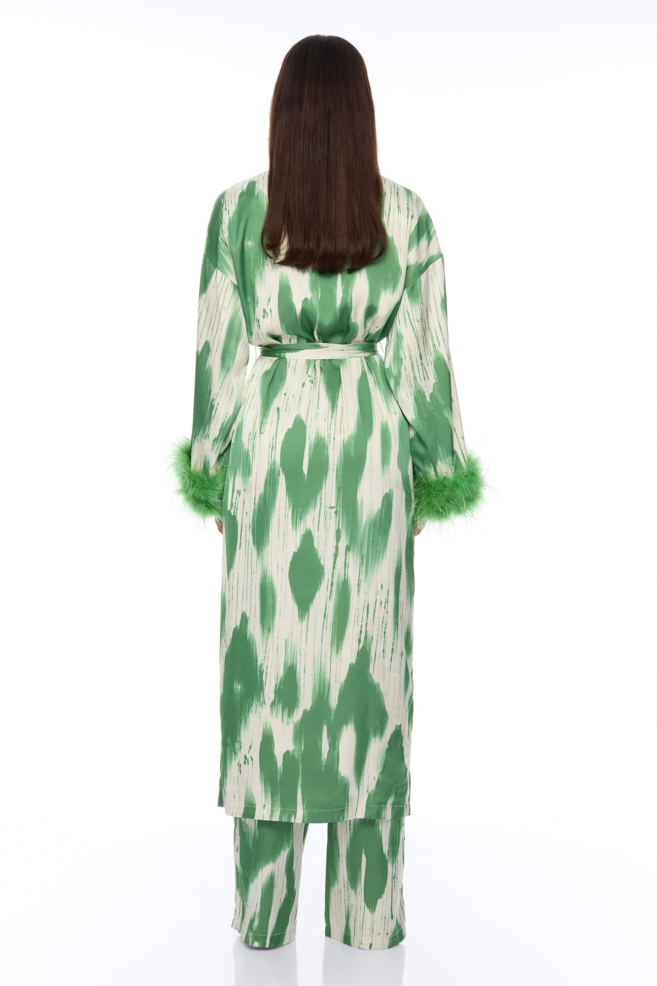 Freya Feathered Satin Kimono Pant Set - Green/combo