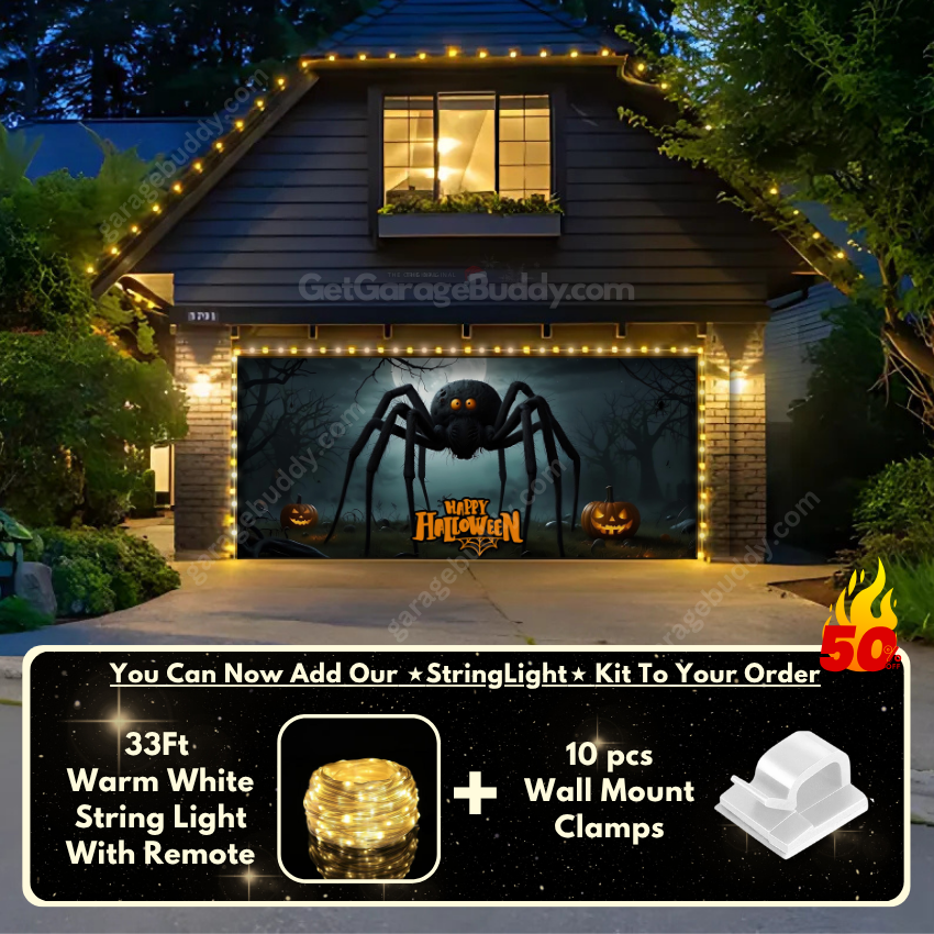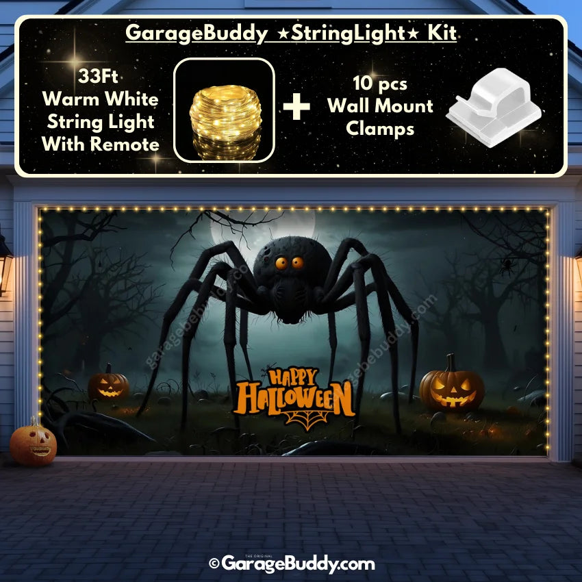 You now have the option to add the GarageBuddy string light kit to your order at 50% off and turn your garage into a true showstopper. The kit includes 1x 33 ft warm white string light, a remote control, and 10x sticky wall mount clamps. The 2-door garage option comes with 2 string light kits. The lights work on three AA batteries (not included), so you don’t need to run around finding electrical outlets. Combine this with your spooky garage door cover for the ultimate haunted effect.