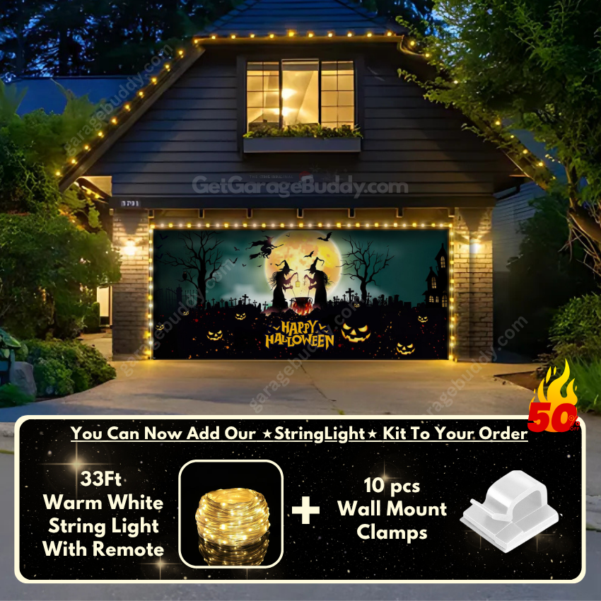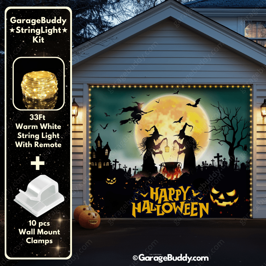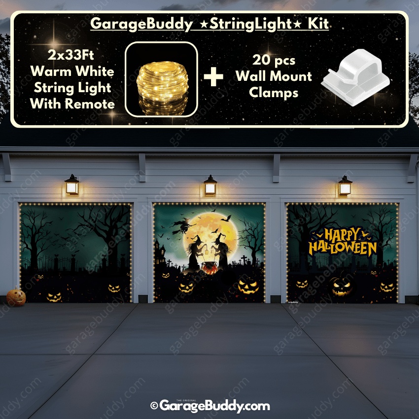 Level up your Halloween garage door cover with the GarageBuddy string lights kit. Available at 50% off, the kit includes 33 ft of warm white string lights, a remote control, and wall mount clamps. Paired with a creepy Halloween garage door cover, the glow turns your garage into a true haunted spectacle. Whether it’s a single- or double-door setup, the spooky garage door cover paired with lights guarantees a show-stopping effect.