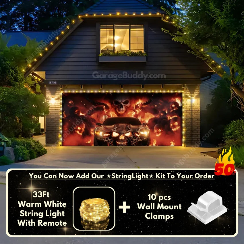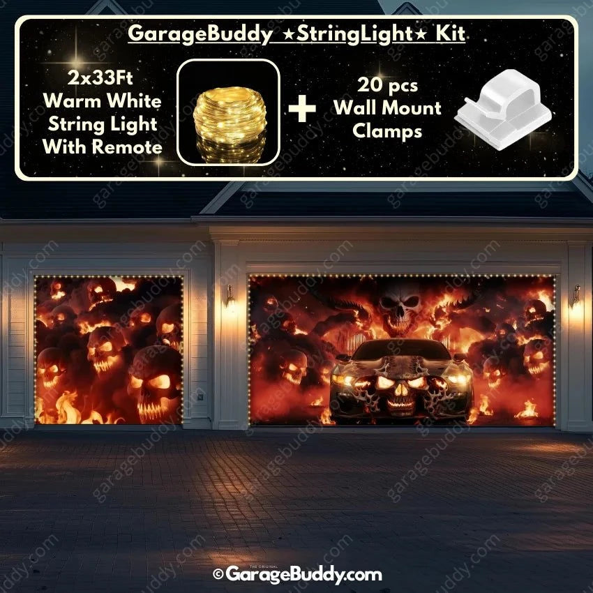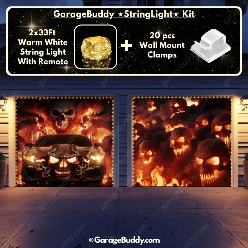 You now have the option to add the GarageBuddy string light kit to your order at 50% off and turn your garage into a true showstopper. The kit includes 1x 33 ft warm white string light, a remote control, and 10x sticky wall mount clamps. The 2-door garage option comes with 2 string light kits. The lights work on three AA batteries (not included), so you don't need to run around finding electrical outlets. Paired with a Spooky Garage Door Cover, it creates the ultimate haunted haven that brings your outdoor Halloween decorations to life.