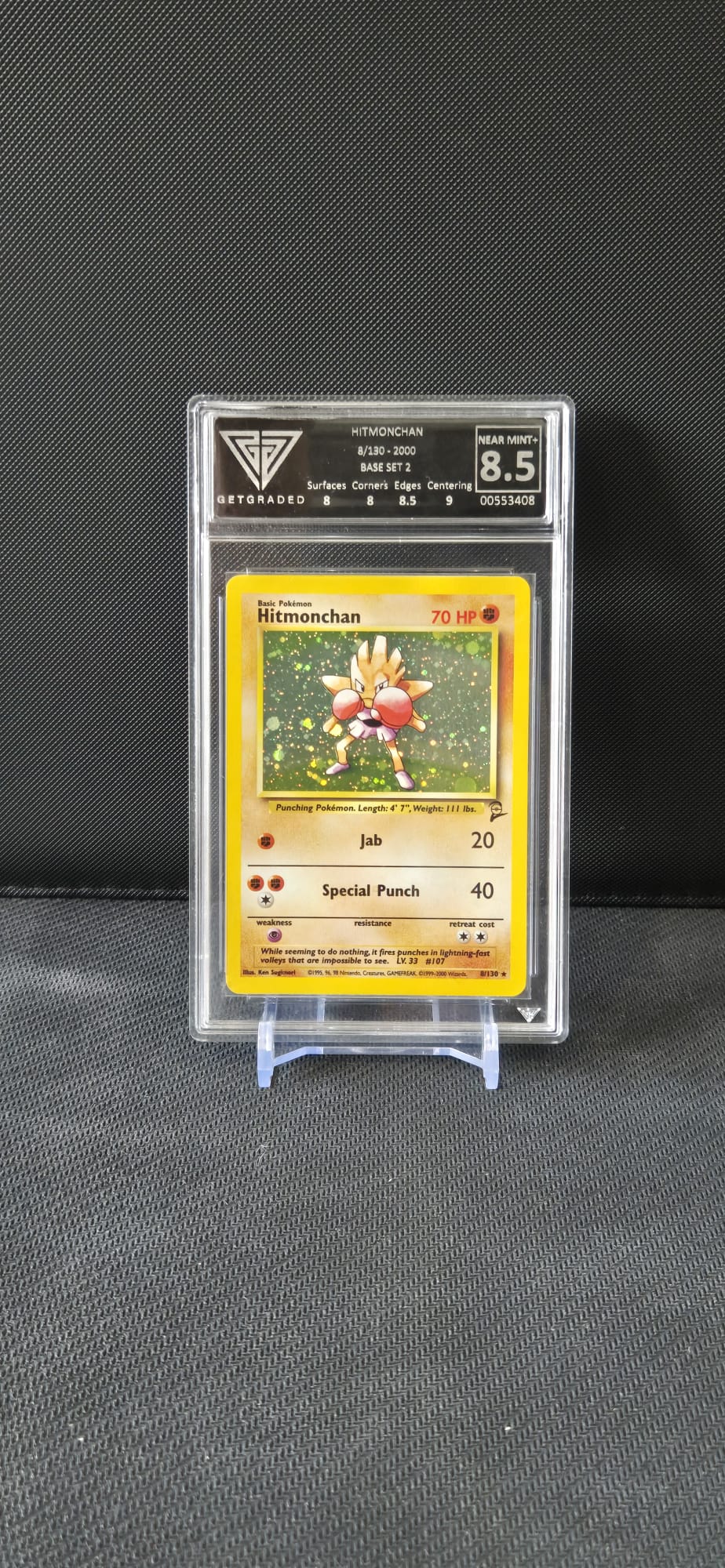 The Hitmonchan 008/130 Base Set 2 Holo GetGraded 8.5 is priced at $40.00. Free shipping is available on orders over $49.
