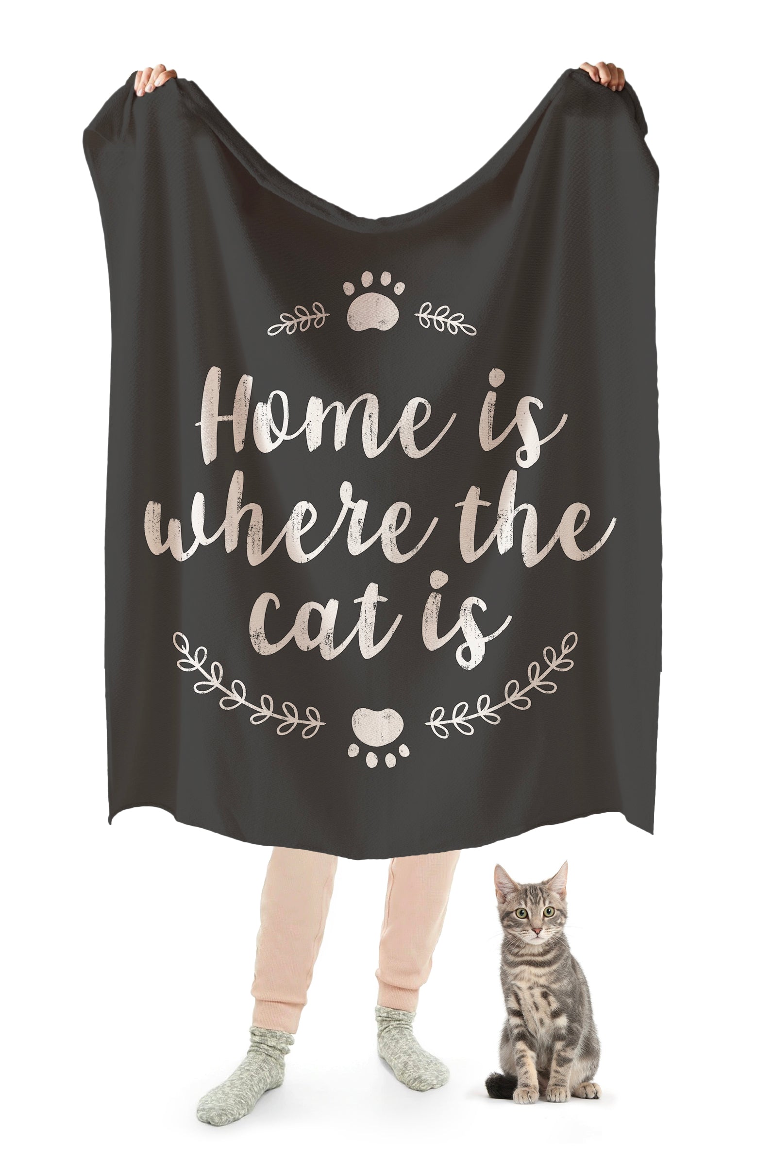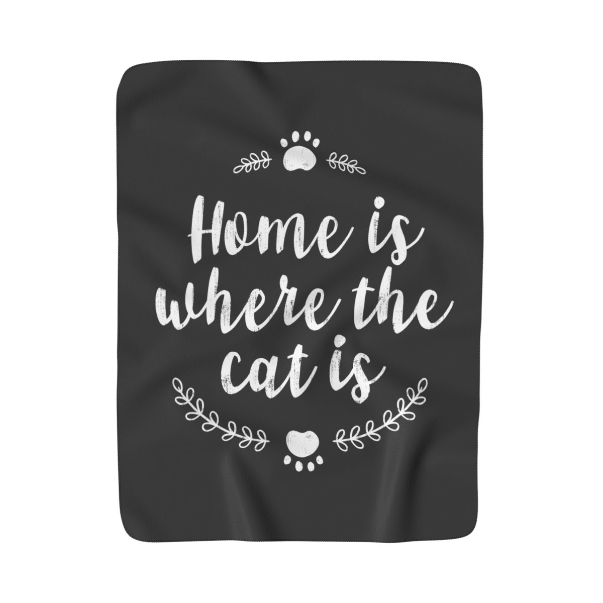 We know that a house simply isn’t a home without at least one cat! Featuring a bold graphic print with a heartwarming message, this cute cat throw blanket is the purrfect piece of cat-themed décor to brighten up your living room or bedroom. Freshen up your home décor and get ready for the ultimate catnap experience! This cat-themed Sherpa fleece blanket features brush lettering that reads, “Home Is Where The Cat Is,” accented by laurels and two adorable kitty paws. The front of each Where The Cat Is Sherpa Blanket is crafted from 100% Polyester, while the reverse is lined with soft-to-the-touch, vegan Sherpa fleece for extra cozy comfort. While this is definitely a cat blanket for humans, it’s so comfy you might have to fight with your cat over who gets to use this blanket. The Where The Cat Is Sherpa Blanket is the purrfect blanket for year-round comfort; and it’s so cute you simply won’t want to wait ‘til winter comes around to use it! You can happily drape it over your favorite chair or sofa for regular use, and even take it on the road so you can catnap on the go.
