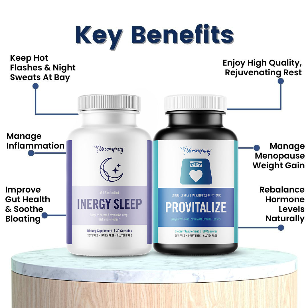 Our bundle’s special blend of herbs and probiotics provides a natural, anti-inflammatory boost that lowers inflammatory levels in the body. With high levels of inflammation being linked to increased frequency of hot flashes, our bundle not only allows our customers to easily manage hot flashes, but also other inflammatory-based symptoms like joint pains & leaky gut syndrome.