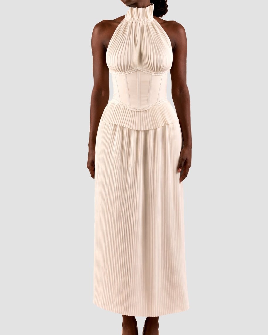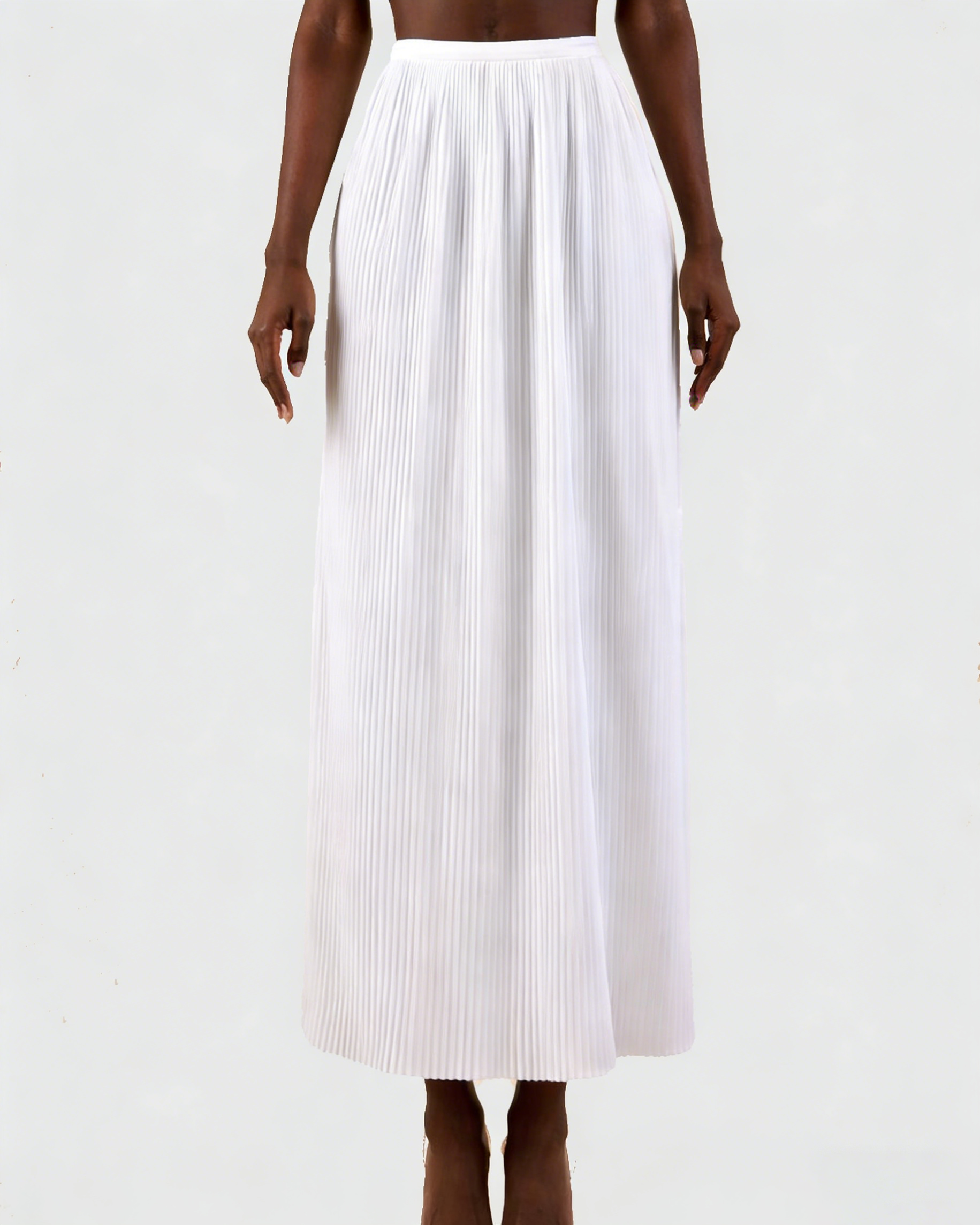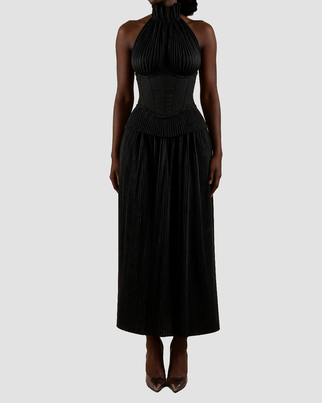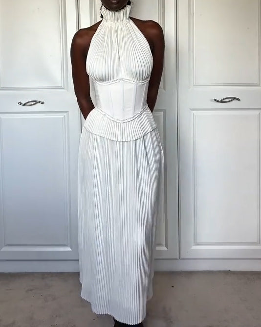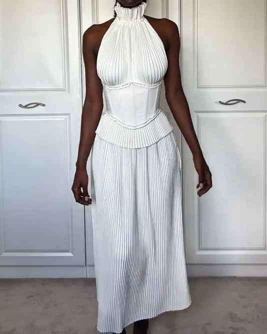 This corset top is designed to leave a lasting impression. With structured boning it enhance the waistline and creates a beautifully contoured silhouette. The corset allows for a custom fit, while the pleats ensures a seamless finish. Maxi skirt is designed to sculpt the waist while moving with grace. Cut to a full-length silhouette with structured pleats, it creates a refined shape that elongates the body and flows beautifully with every step.