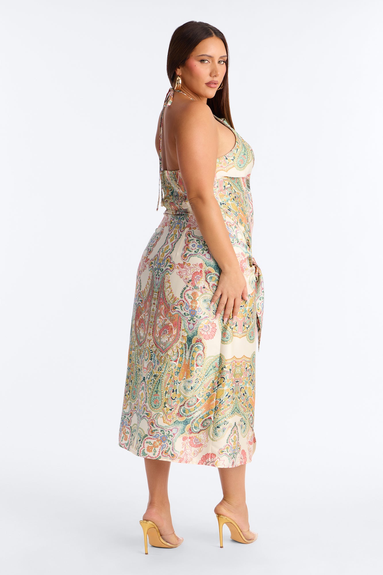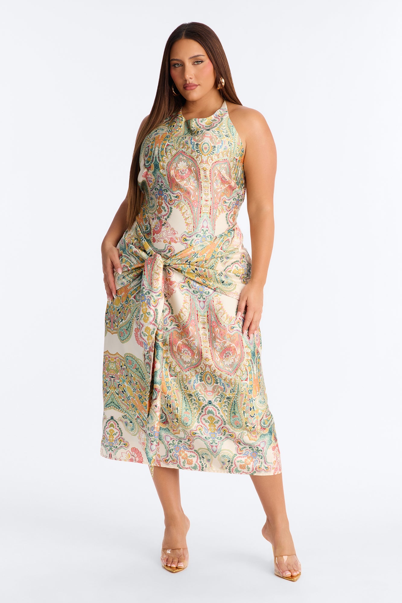 The Imani Satin Midi Dress - Green/combo is available in the following options: XS, S, M, L, XL, 1X, 2X, 3X. Check the product page for current stock availability.