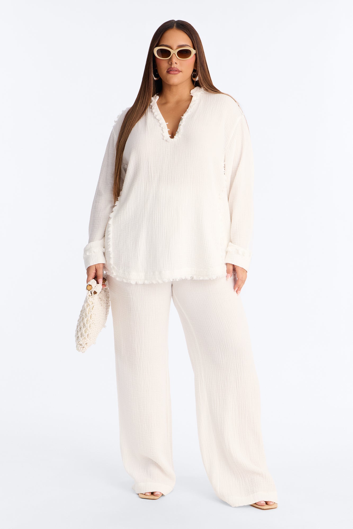 The Isabella Gauze Wide Leg Pant Set - White is available in the following options: XS, S, M, L, XL, 1X, 2X, 3X. Check the product page for current stock availability.