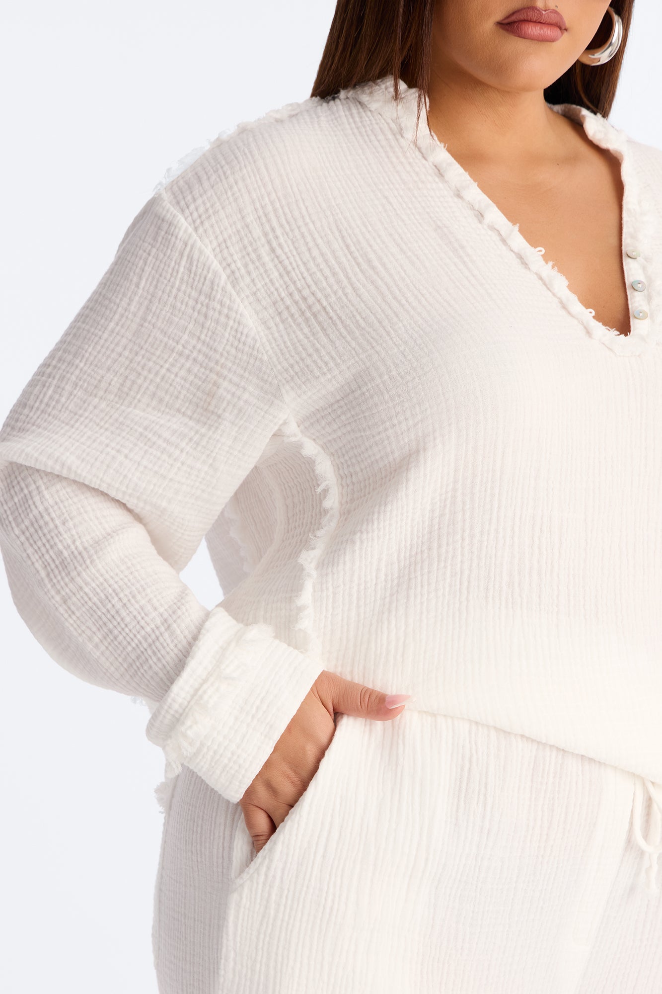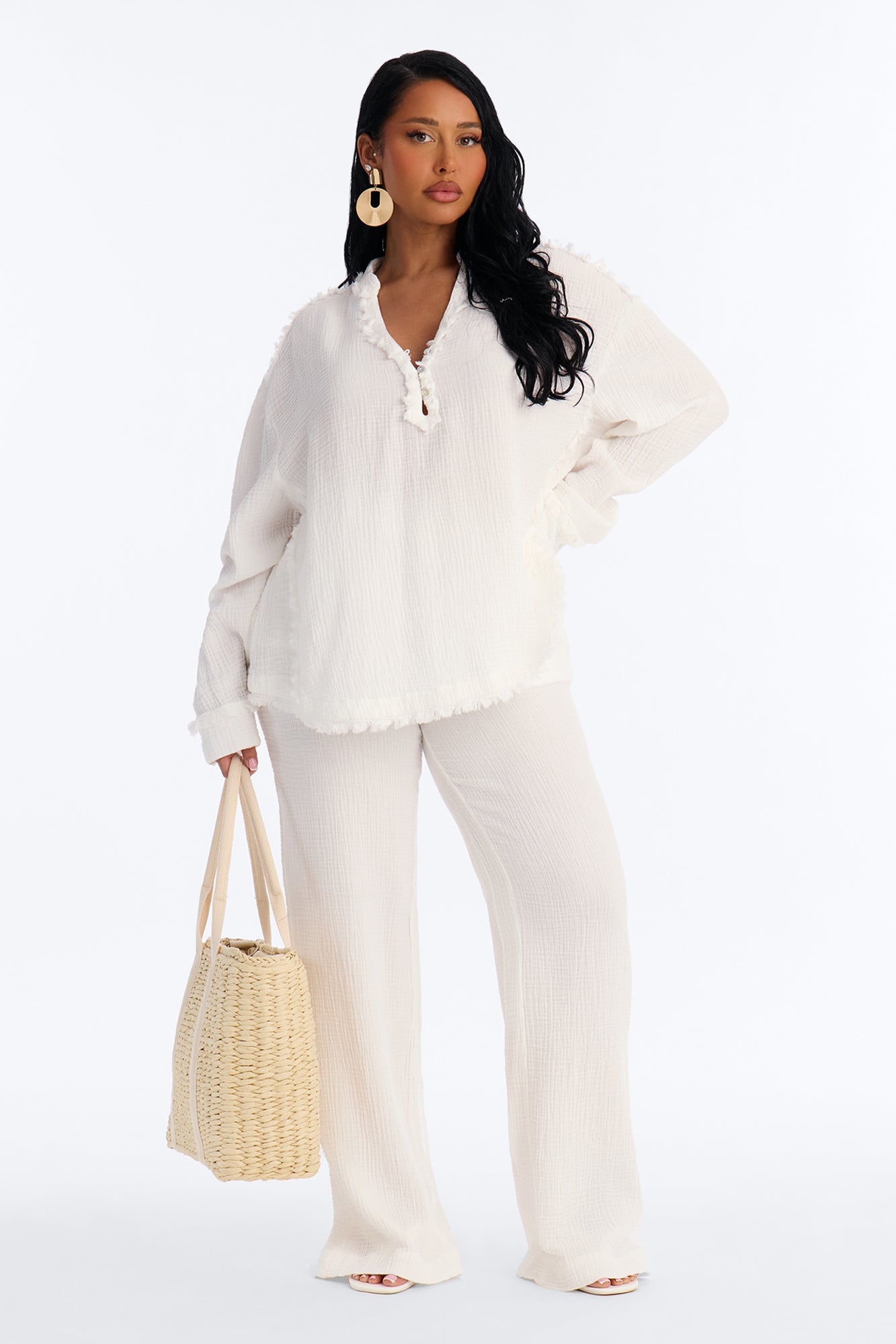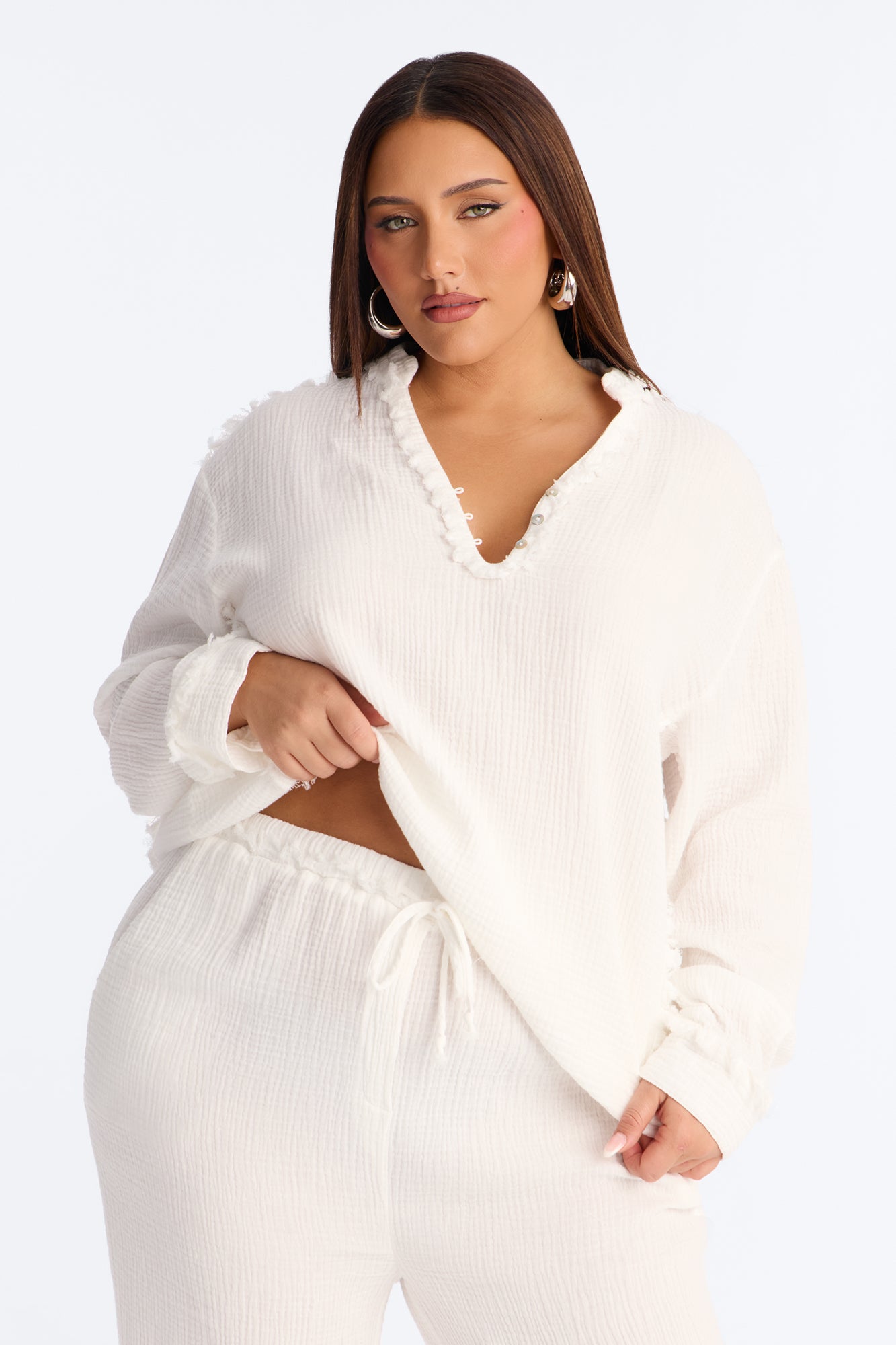 The Isabella Gauze Wide Leg Pant Set - White is currently on sale for $59.99 (originally $59.99, save 0%). Price includes free shipping on orders over $49.