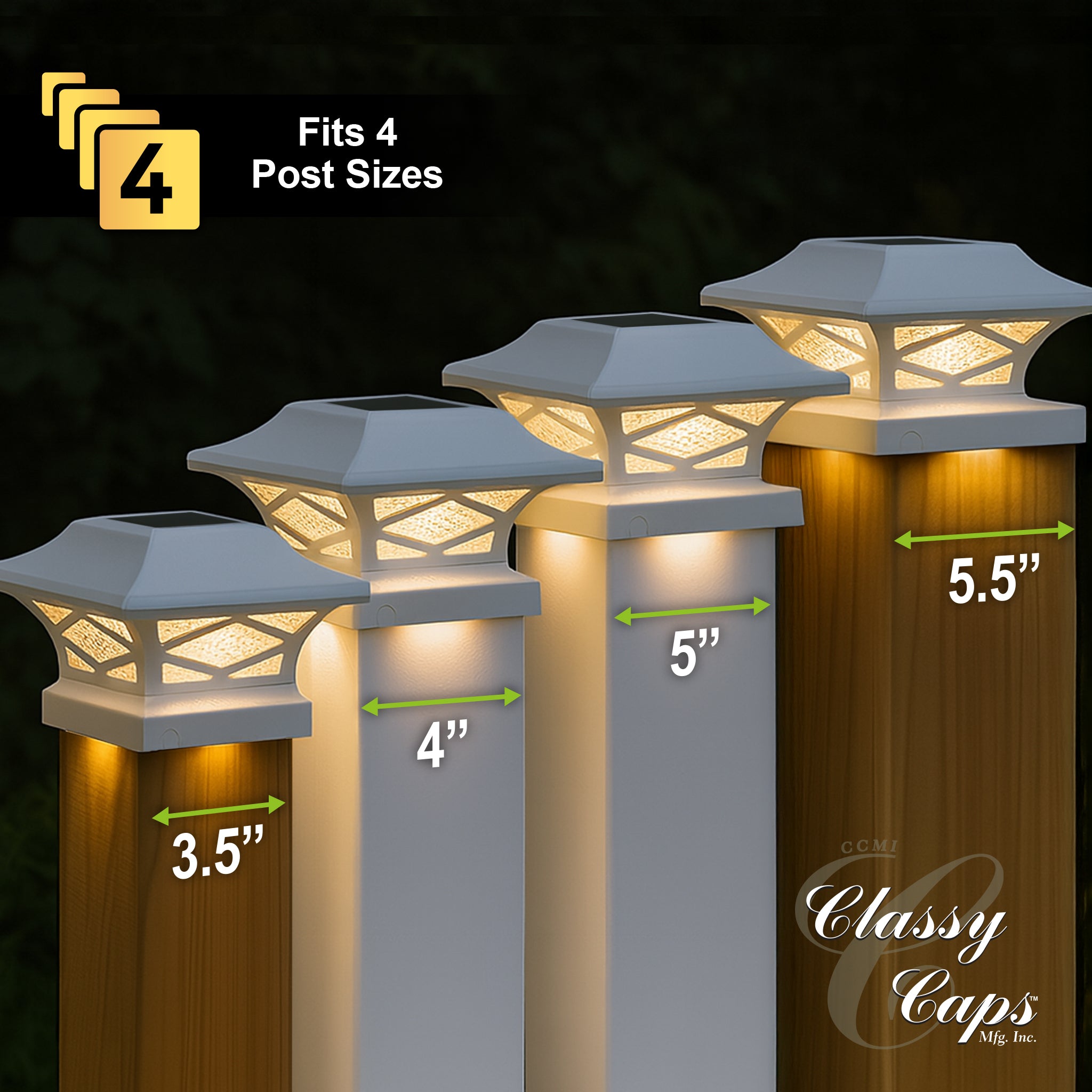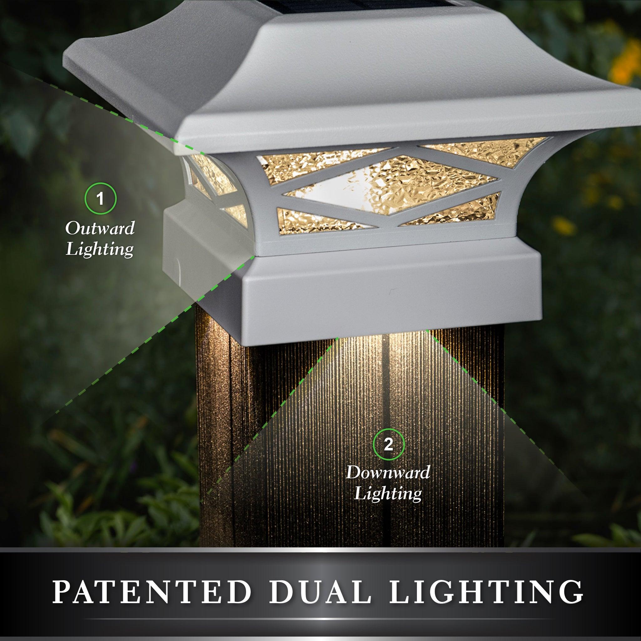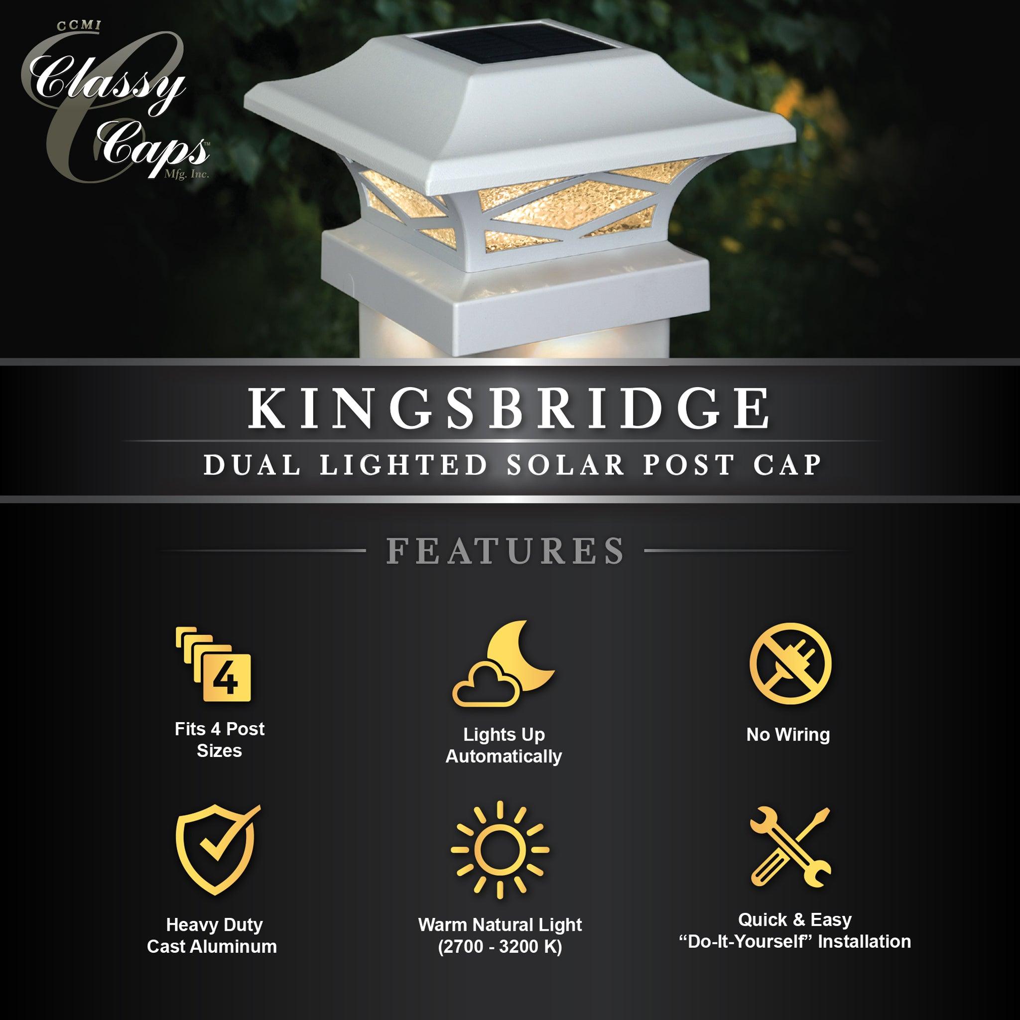Introducing the durably crafted Kingsbridge dual lighting solar post cap, designed and manufactured only by Classy Caps Mfg. Inc. This unique, one-of-a-kind Solar Post Cap is a one-cap fits-all patent pending design with the versatility to fit over four standard-size posts. The cast aluminum Kingsbridge exudes quality, offering a monocrystalline solar panel and 3.2V LifeP04 rechargeable battery for many years of maintenance-free reliability. The real pebbled glass lens and strategically placed surface mount LED’s will cast magnificent warm lighting accents to highlight your fence, deck, landscape and more. Your neighbors will most certainly be envious of the Kingsbridge Dual Lighting Solar Post Cap that is truly fit for a King!