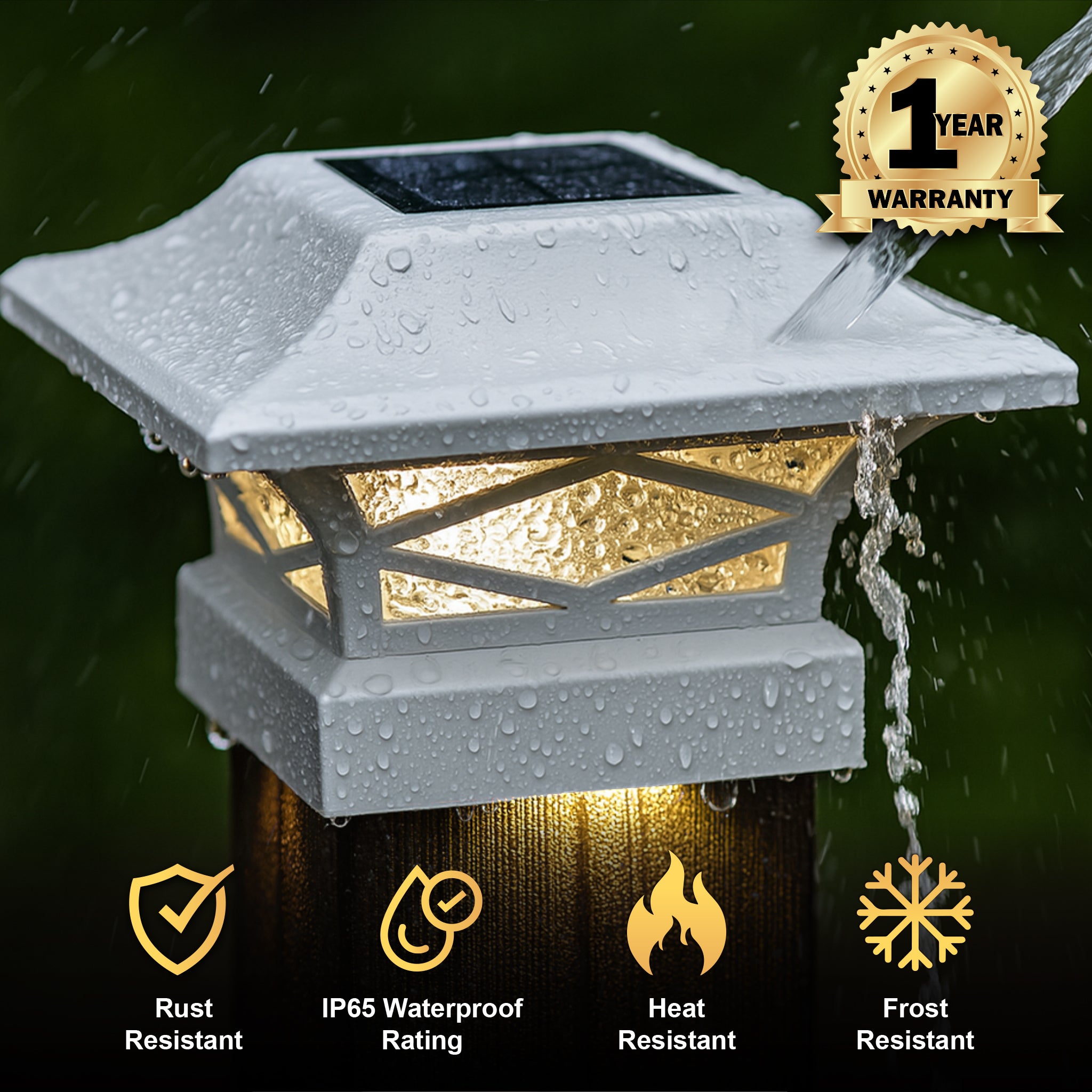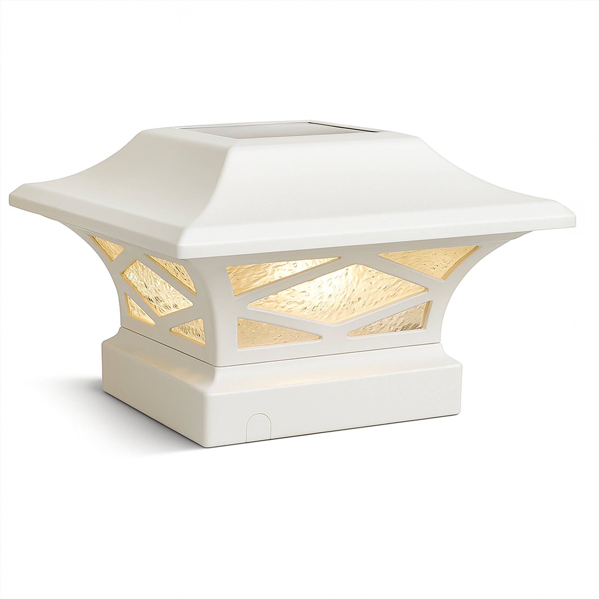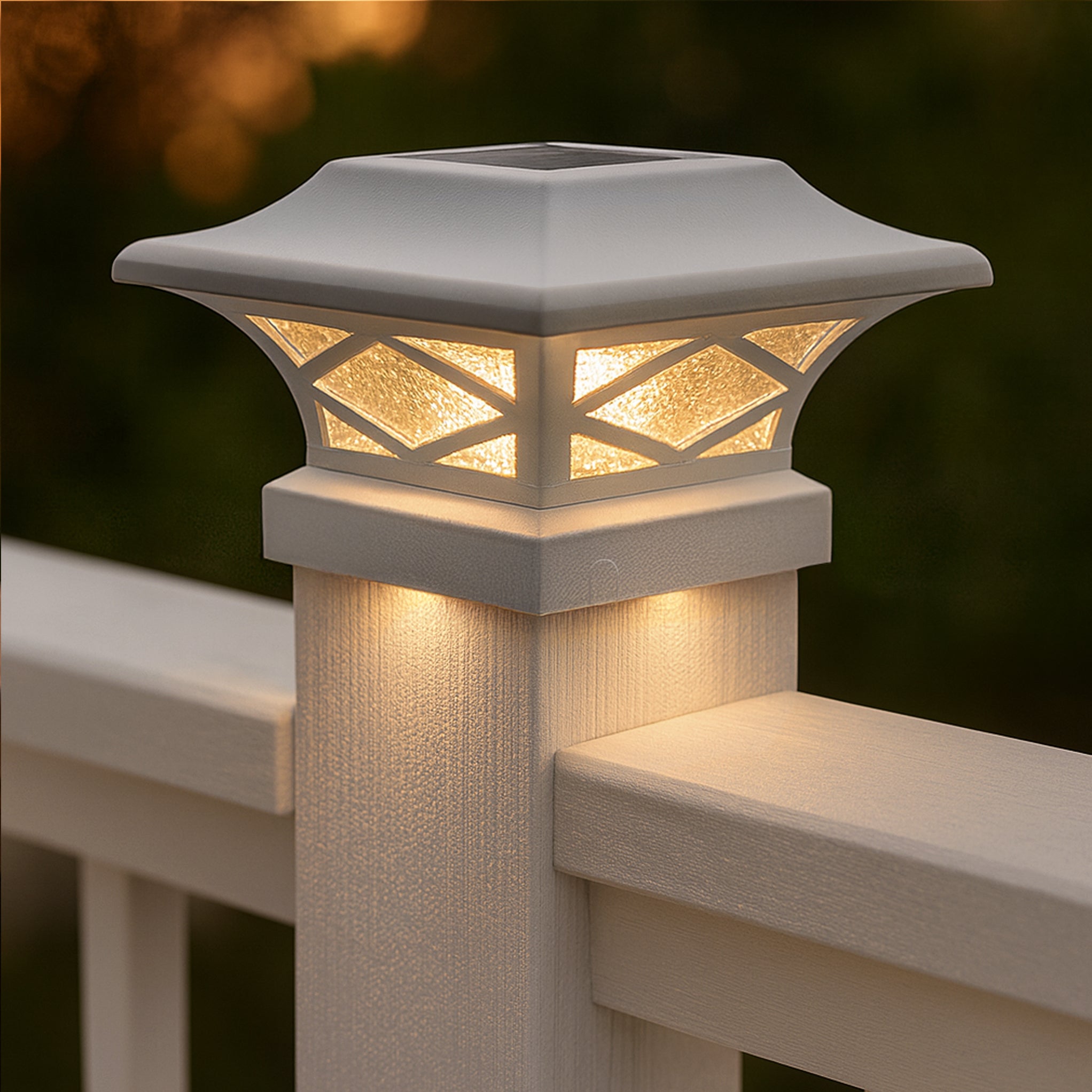 Introducing the durably crafted Kingsbridge dual lighting solar post cap, designed and manufactured only by Classy Caps Mfg. Inc. This unique, one-of-a-kind Solar Post Cap is a one-cap fits-all patent pending design with the versatility to fit over four standard-size posts. The cast aluminum Kingsbridge exudes quality, offering a monocrystalline solar panel and 3.2V LifeP04 rechargeable battery for many years of maintenance-free reliability. The real pebbled glass lens and strategically placed surface mount LED’s will cast magnificent warm lighting accents to highlight your fence, deck, landscape and more. Your neighbors will most certainly be envious of the Kingsbridge Dual Lighting Solar Post Cap that is truly fit for a King!
