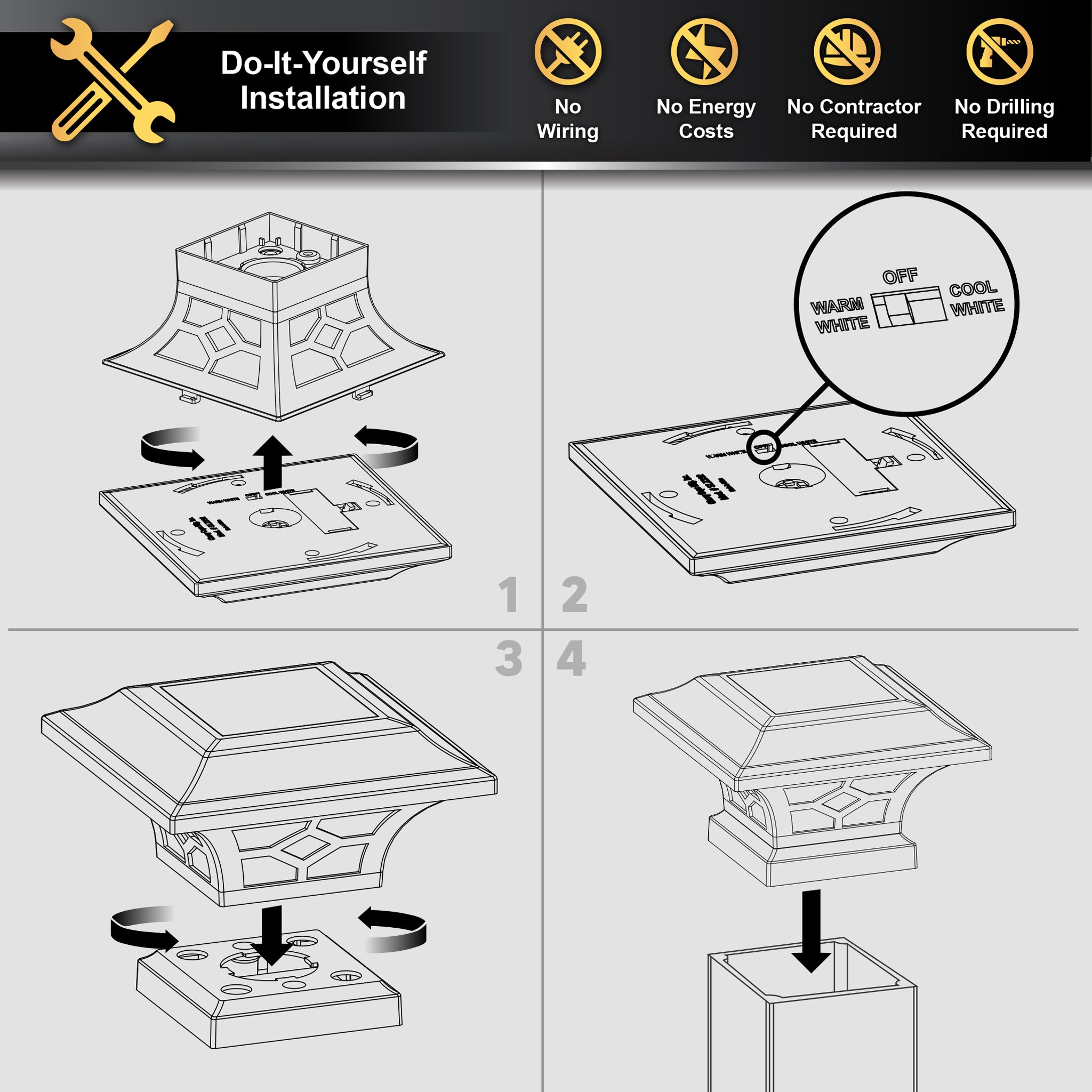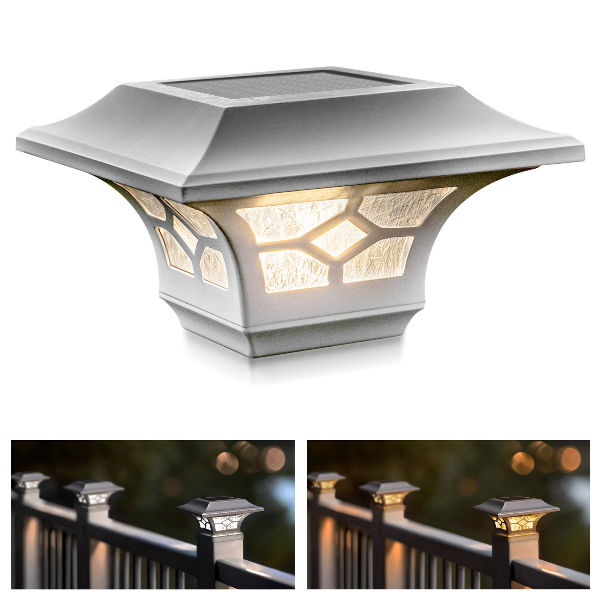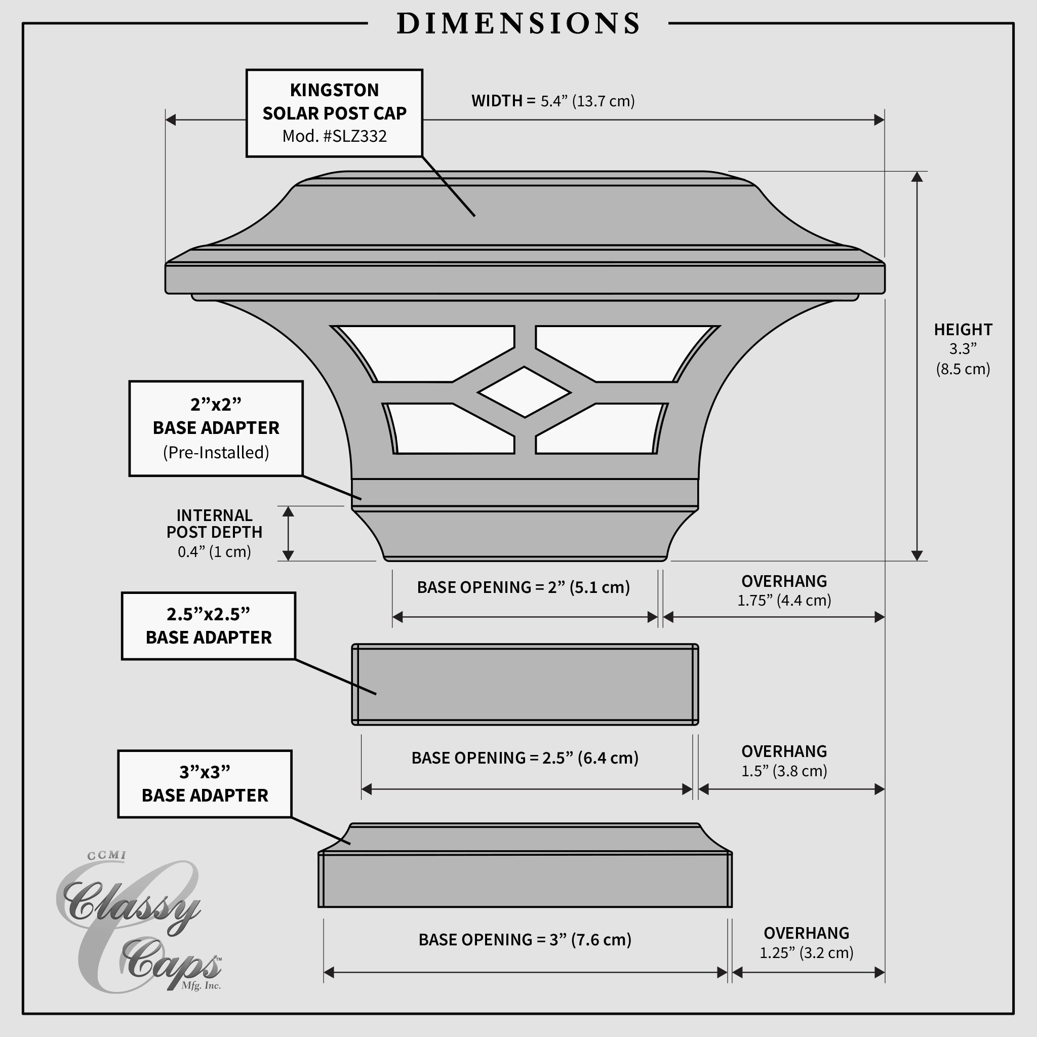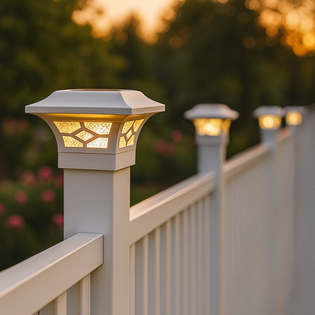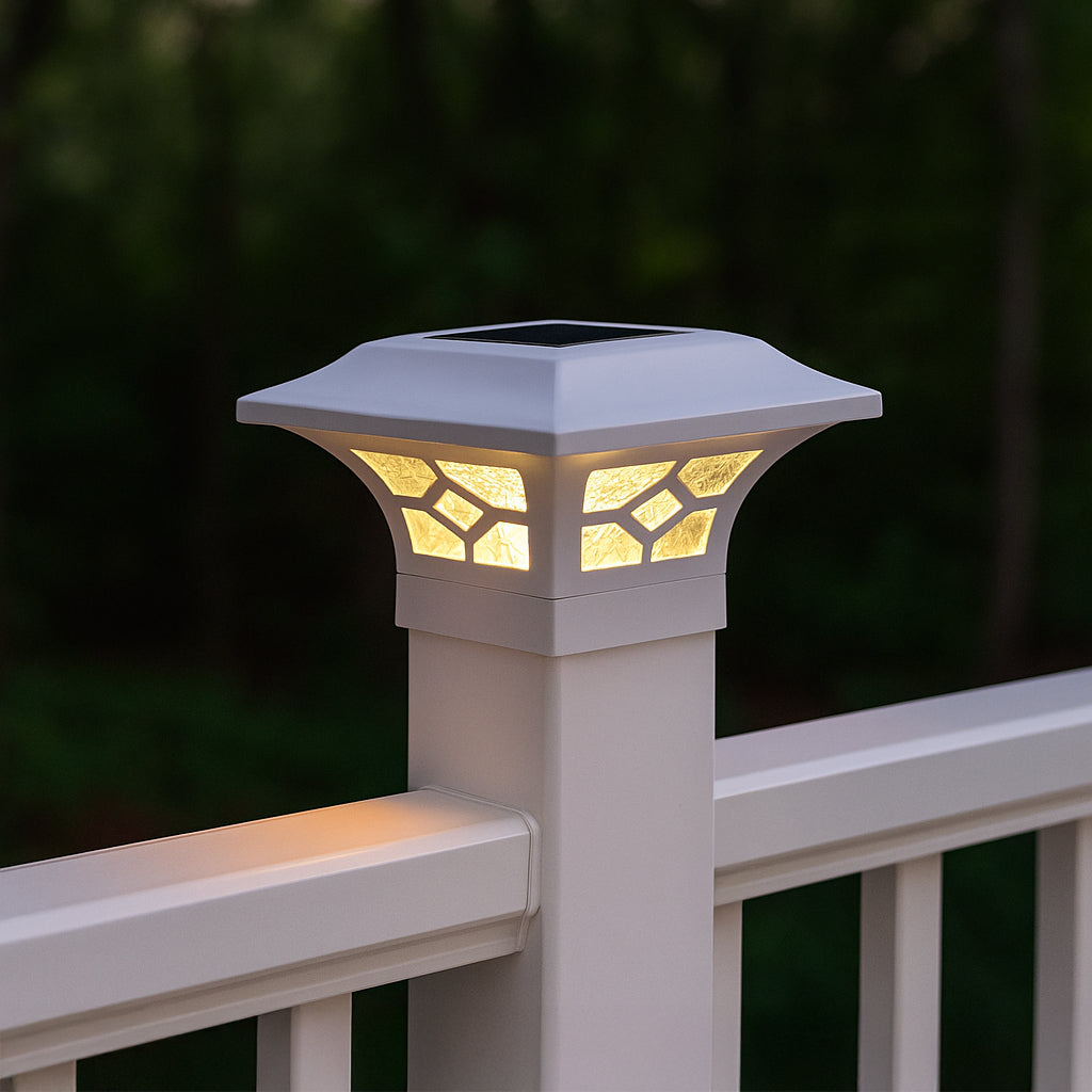 Introducing the Classy Caps Kingston Solar Post Cap, a masterpiece of elegance and innovation. This stunning fixture is the perfect addition to elevate your aluminum deck railing, aluminum fence, or ornamental fence. Crafted to fit 2" x 2”, 2.5" x 2.5”, and 3" x 3” posts, its versatility is matched only by its convenience. With its compression-fit design, installation is a breeze, as it effortlessly secures to the post without the need for drilling, screws, or wiring. The Kingston’s allure extends beyond practicality; the warm and cool light modes create the perfect ambiance for any occasion and effortlessly transform your nights into enchanting evenings. Constructed from the finest materials, featuring a sturdy cast aluminum frame and real glass lens this light ensures both durability and timeless elegance. Illuminate your outdoor oasis with style and ease, thanks to the Kingston Solar Post Cap from Classy Caps.