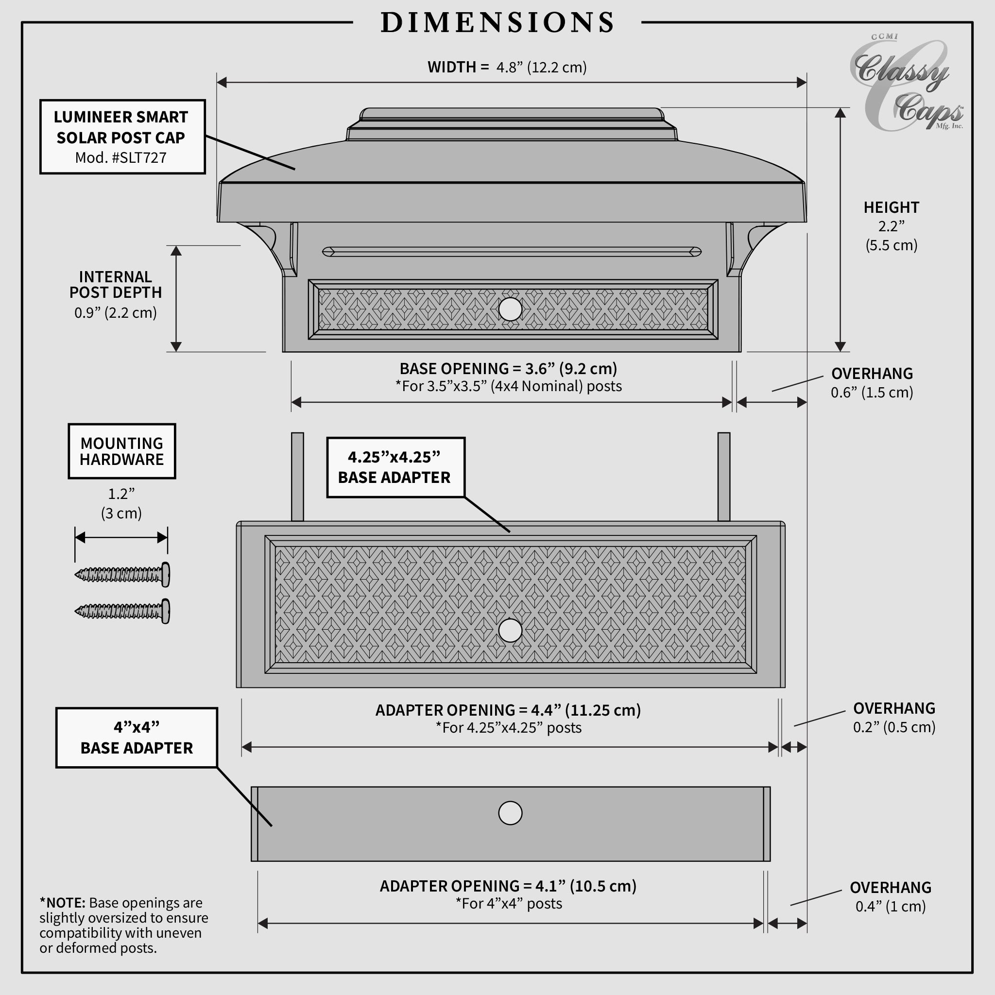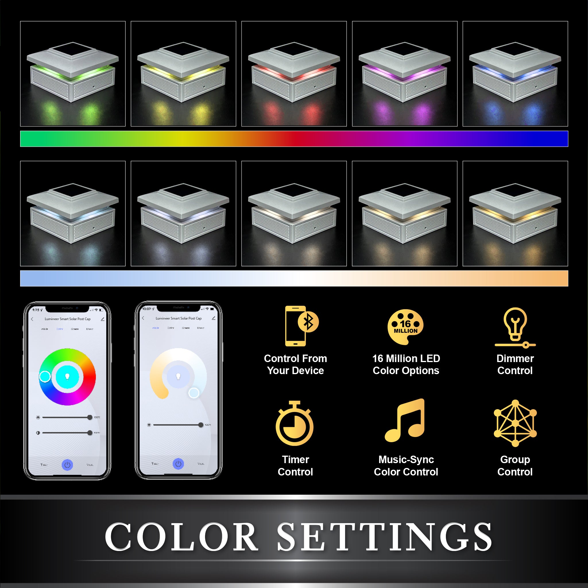 Introducing the new innovative Classy Caps Lumineer Smart Solar Post Light! Our first smart Solar post light will creatively accent your outdoor space. Manufactured from the highest quality materials, the versatile black 2 in 1 design can be mounted on 3 different size posts to light up your mailbox, deck posts, or fence. Group multiple lights together to create a full atmosphere for your outdoor living space that will truly impress. Remote control the solar light with your cell phone through Tuya Smart App.
