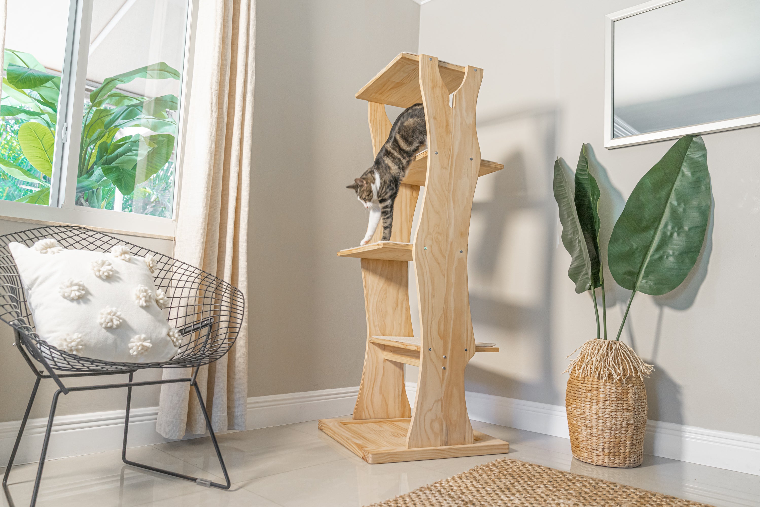 Tested by cats and their owners, our second iteration of this sleek, modern cat tower is better than ever with wider perching platforms so that cats of all shapes, sizes, and breeds can enjoy! Four sturdy wood platforms in a staggered ladder design provide your cat with plenty of vertical climbing space. Each perch is covered with a removable sisal scratchpad, designed to entice your cat to scratch the tree instead of your furniture. The durable sisal mats and sturdy wood will hold up to even the most fervent of cat scratchers.
