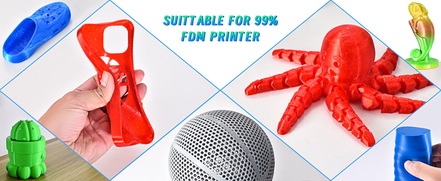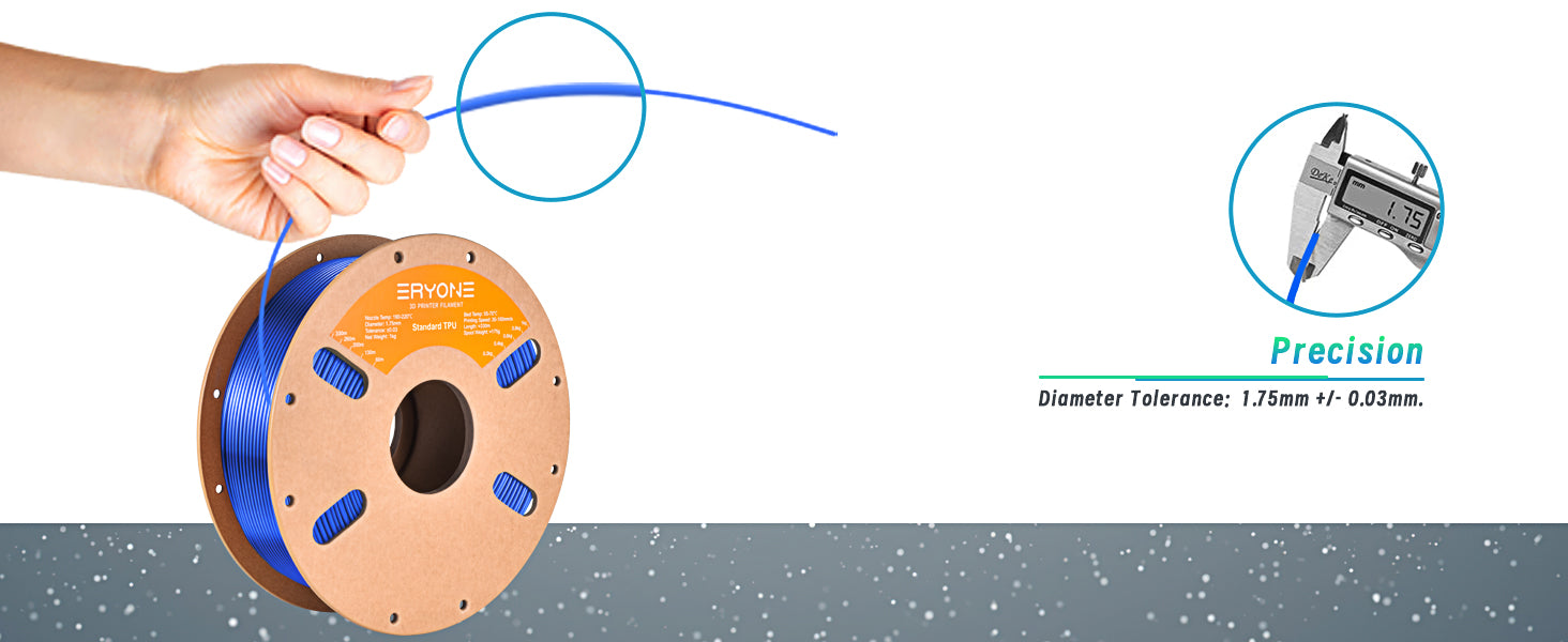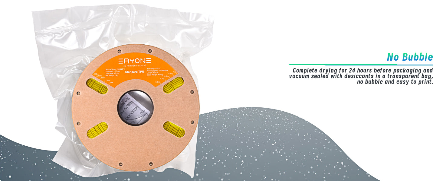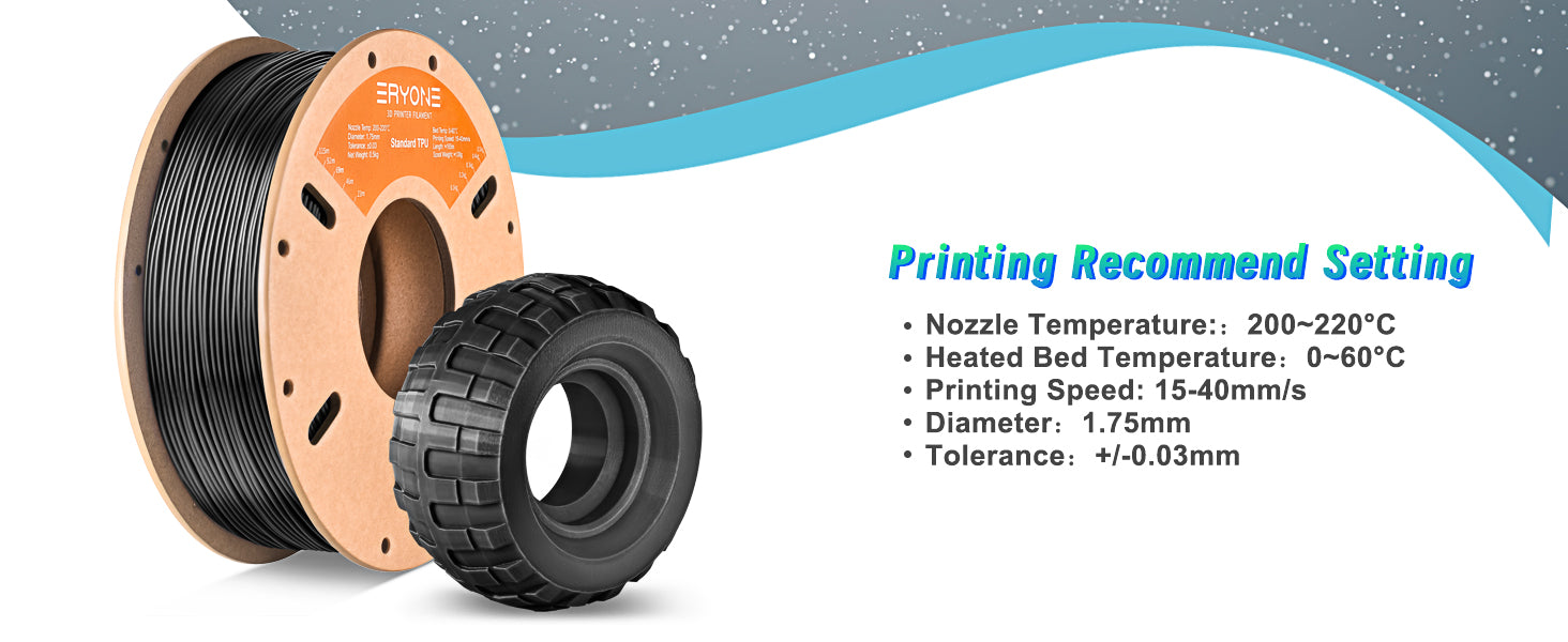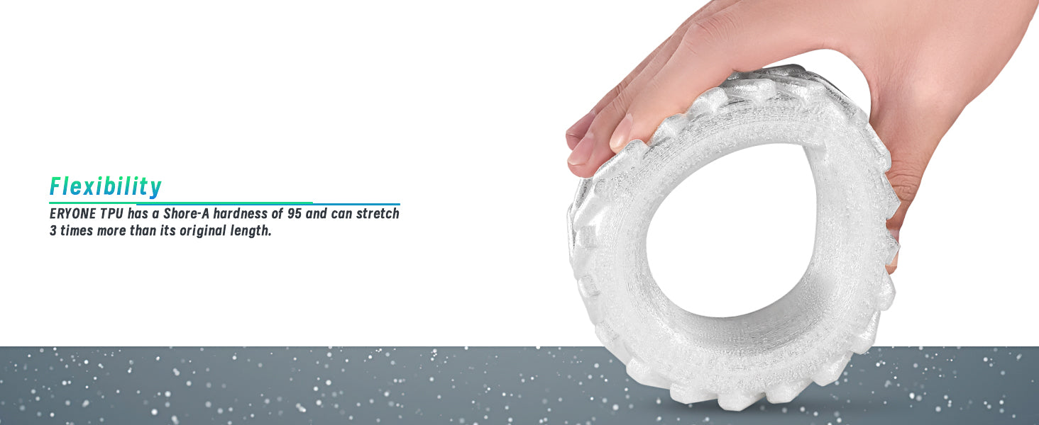 ERYONE TPU gains popularity among 3D Printing community for its balance of rigidity and flexibility. In addition, with a 95A Shore Hardness and improved bed adhesion, it is easier to print even with a stock elementary 3D Printer like the Creality&Ender 3.From drone parts, phone cases, to small toys, all can be printed with ease.