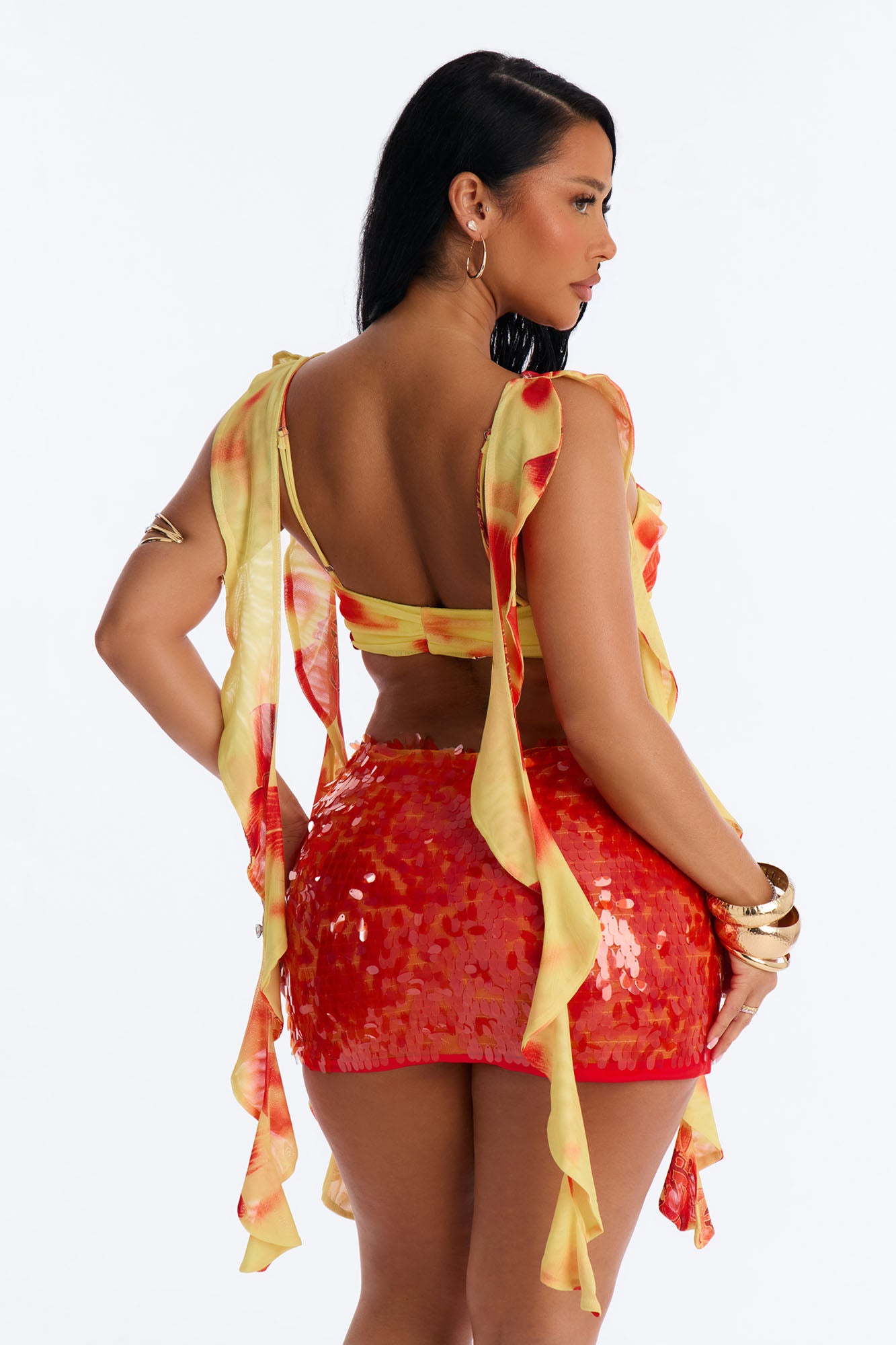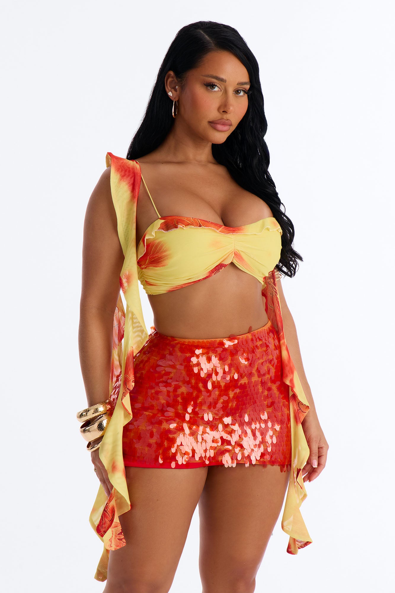 The Perfect Paradise Mesh Drape Ruffle Bra Top - Orange/combo is available in the following options: XS, S, M, L, XL. Check the product page for current stock availability.