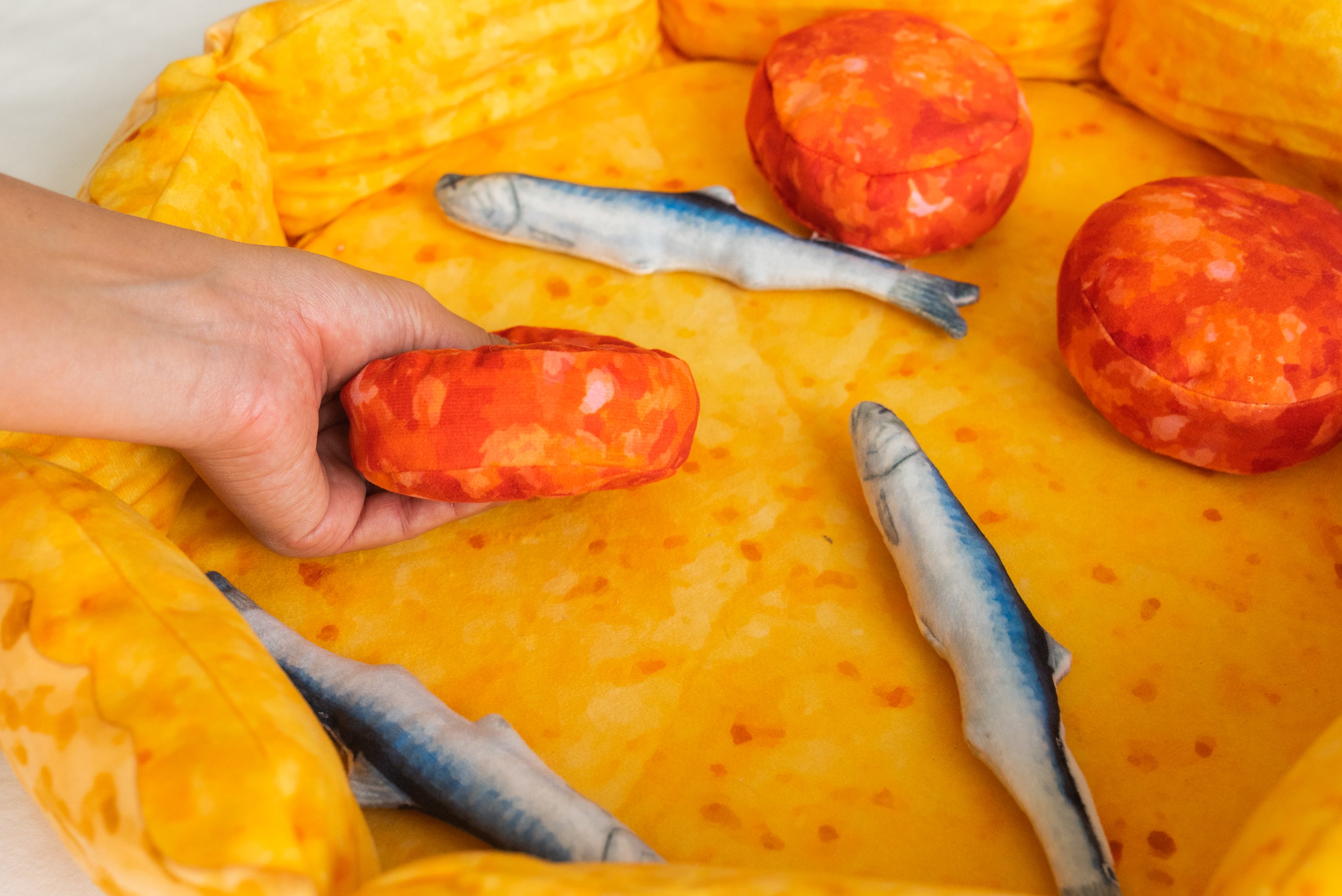 Your cat will spend hours curled up in this pepperoni pizza cat bed, happily nestled among the warm pizza crust and snuggled up to the pepperoni and anchovy pillows!