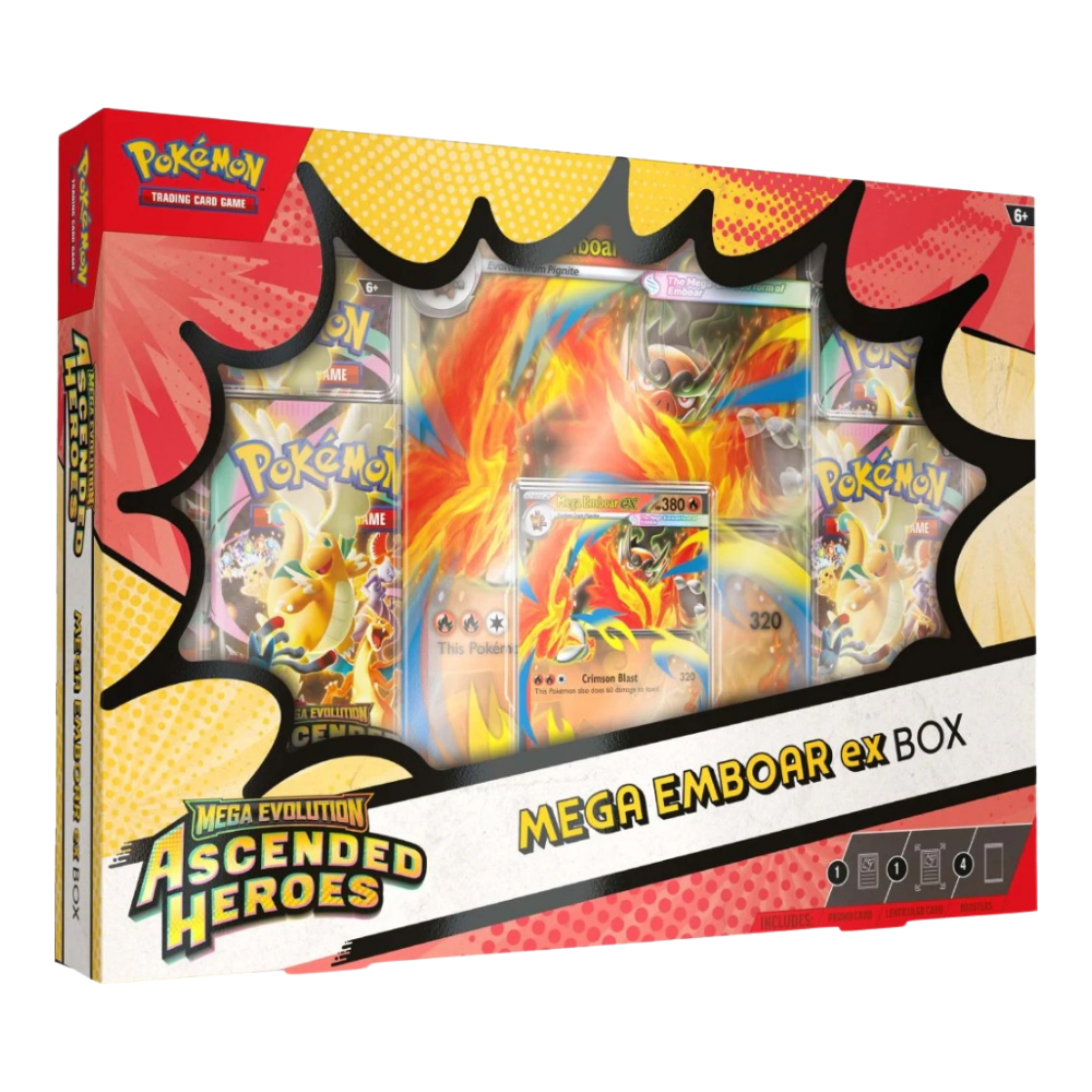 Forge a bond that takes your partner Pokémon’s strength past the limit with Mega Evolution! In this box, you’ll find Mega Emboar ex as a playable foil promo card, along with an oversize lenticular card with dynamic artwork and four booster packs from the special Mega Evolution—Ascended Heroes expansion.