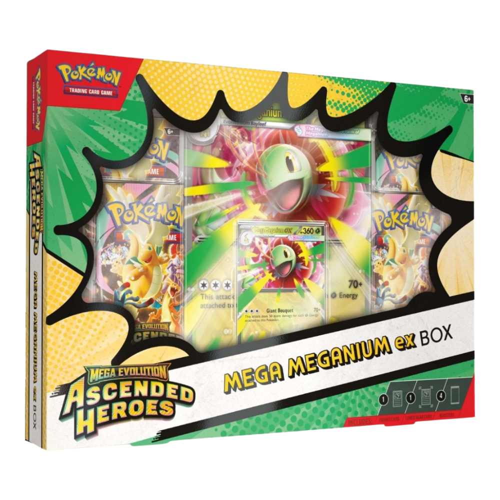 Forge a bond that takes your partner Pokémon’s strength past the limit with Mega Evolution! In this box, you’ll find Mega Meganium ex as a playable foil promo card, along with an oversize lenticular card with dynamic artwork and four booster packs from the special Mega Evolution—Ascended Heroes expansion.