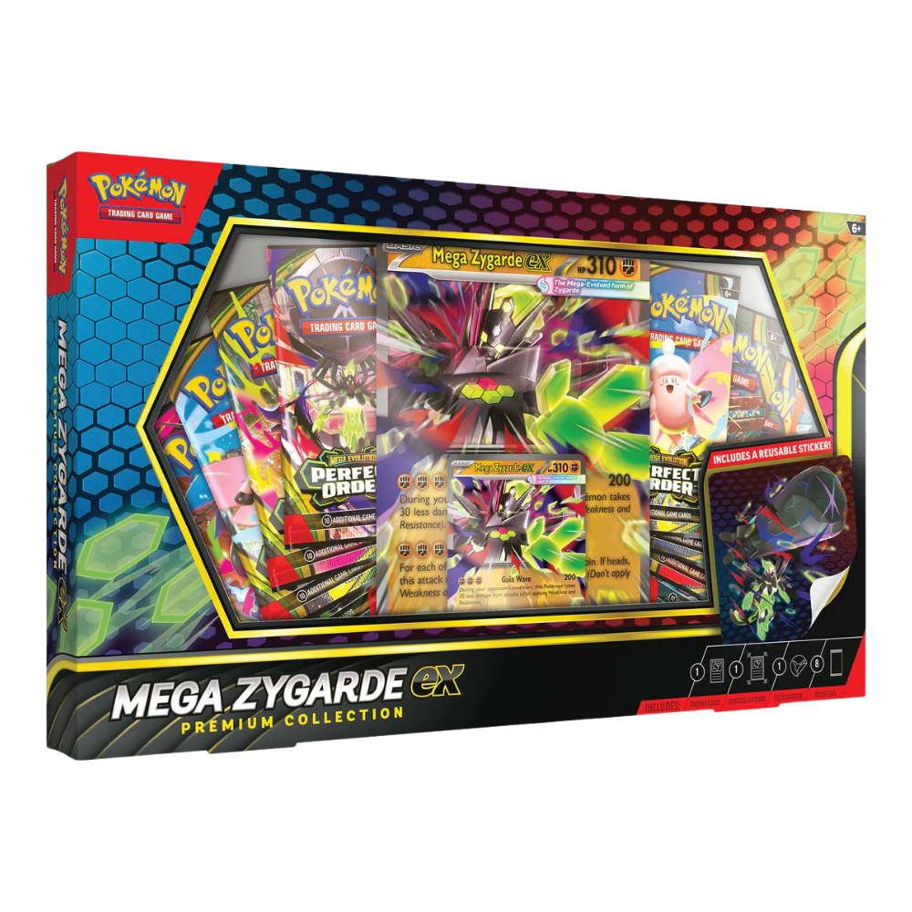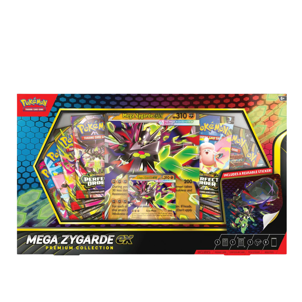 With multiple Formes and legendary power, Zygarde is full of surprises—including the ability to become a Mega Evolution Pokémon ex. Decimate your opponent’s strategy with overwhelming damage from Zygarde’s incredible attacks. With this collection, you get a ready-to-play foil promo card featuring Mega Zygarde ex, along with an oversize lenticular card and a tech sticker for display. Boost your game and offer support to Mega Zygarde ex with a stack of booster packs from different Pokémon TCG expansions.
