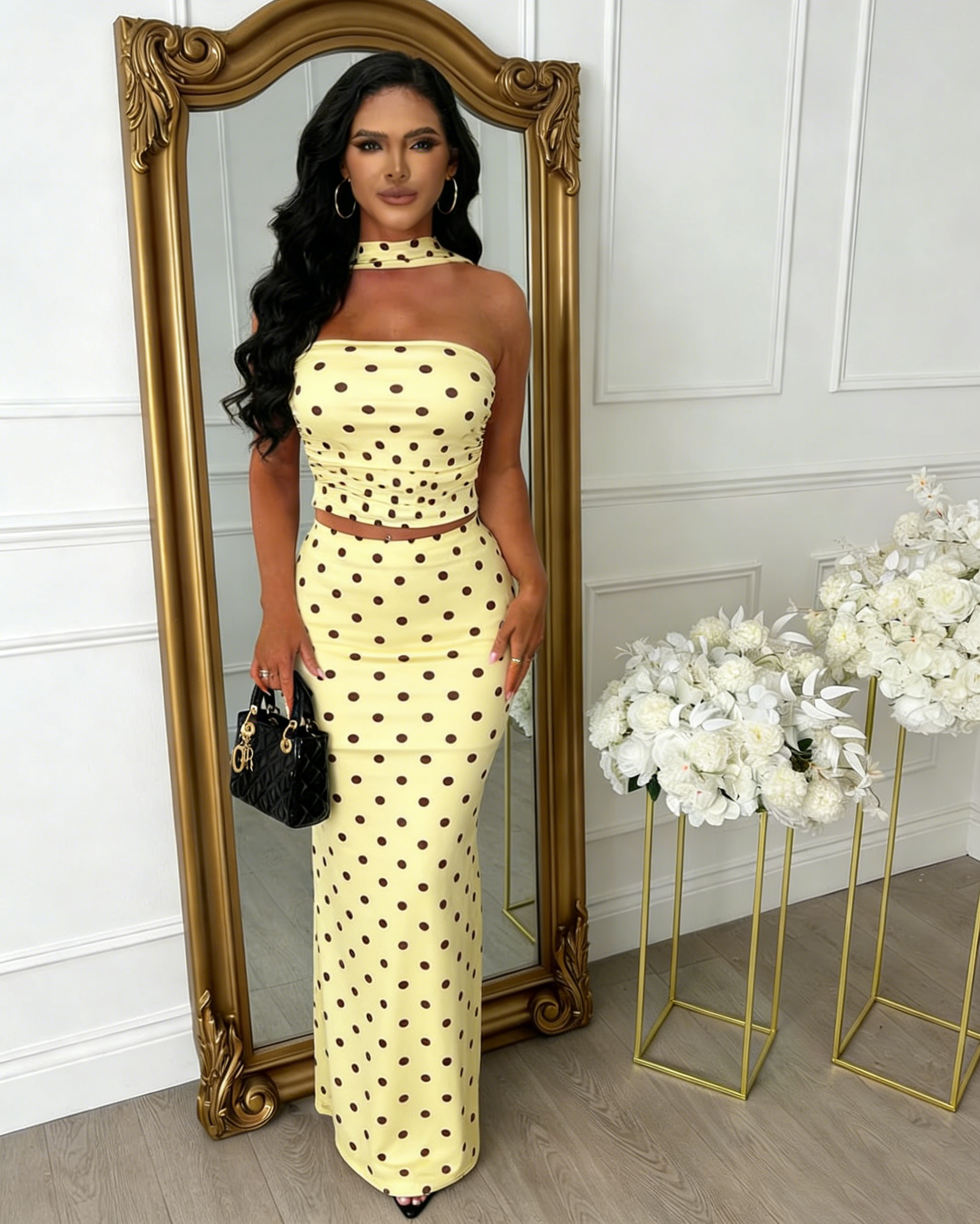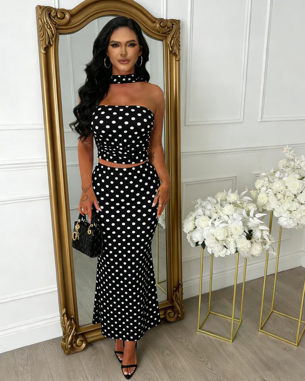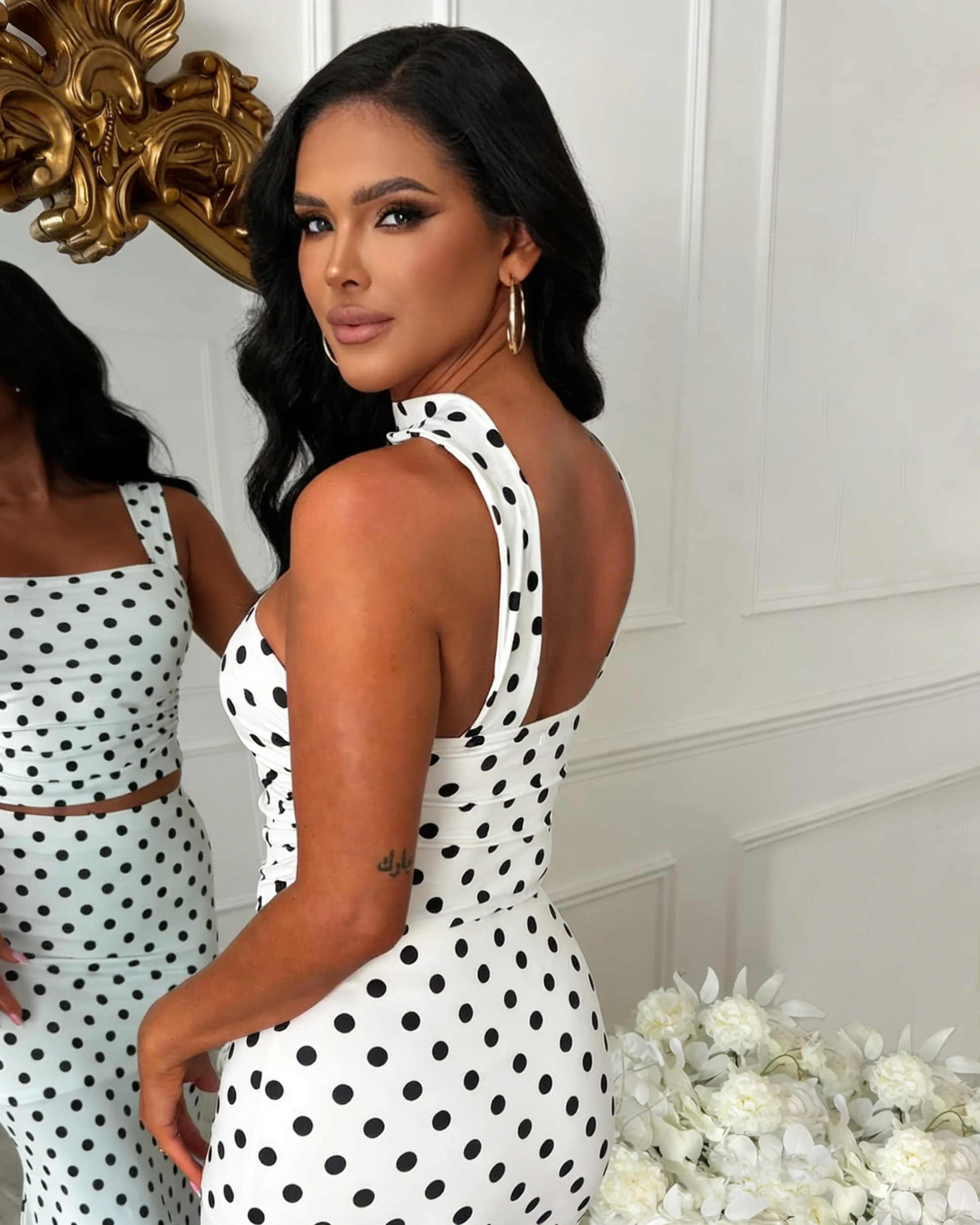 Elevate your wardrobe with this Polka Dot Skinny Figure Dress Set featuring a crisp white base adorned with classic polka dots. The scarf detail top adds an effortless touch of sophistication, while the midaxi skirt creates a flattering, elongated silhouette. Perfect dressed-up occasions. Mix and match with your existing pieces or wear together for an instantly polished look.
