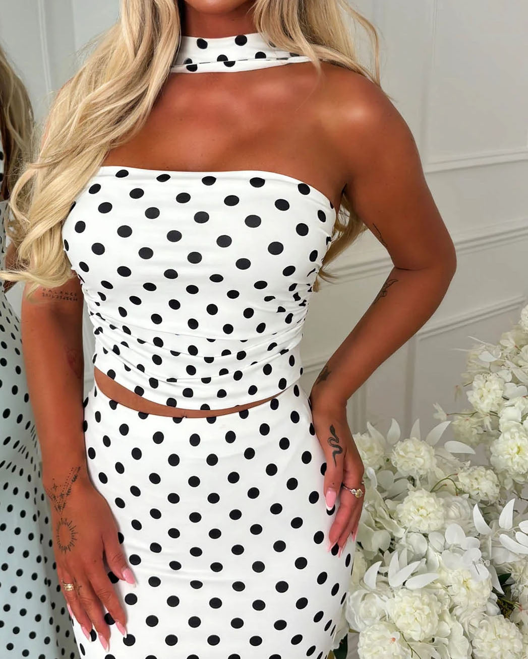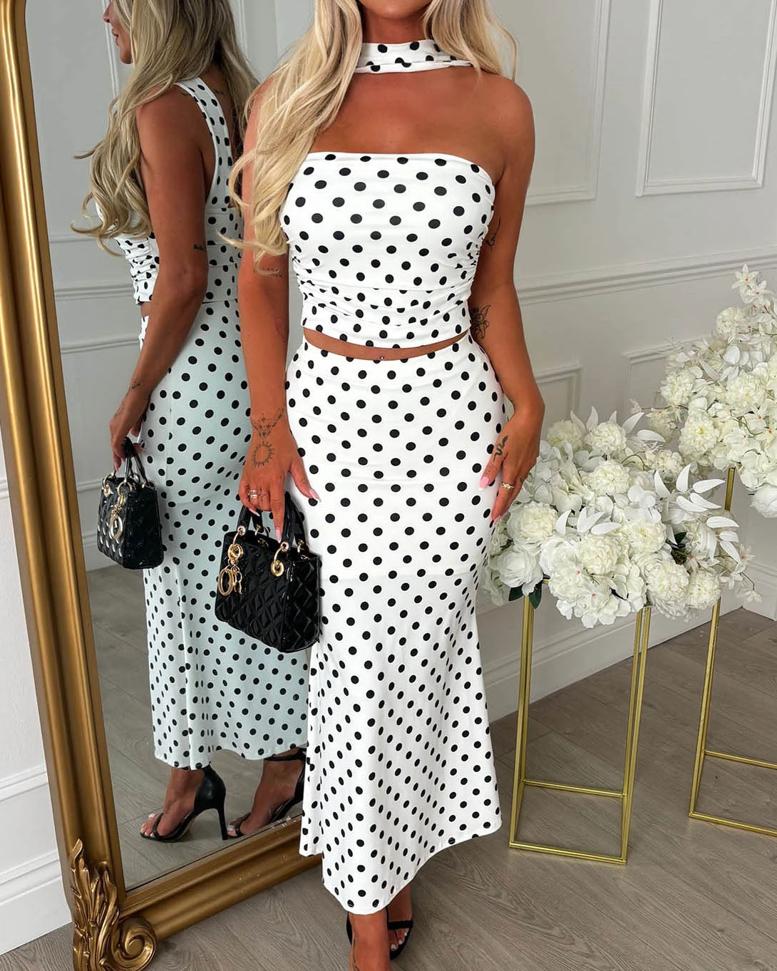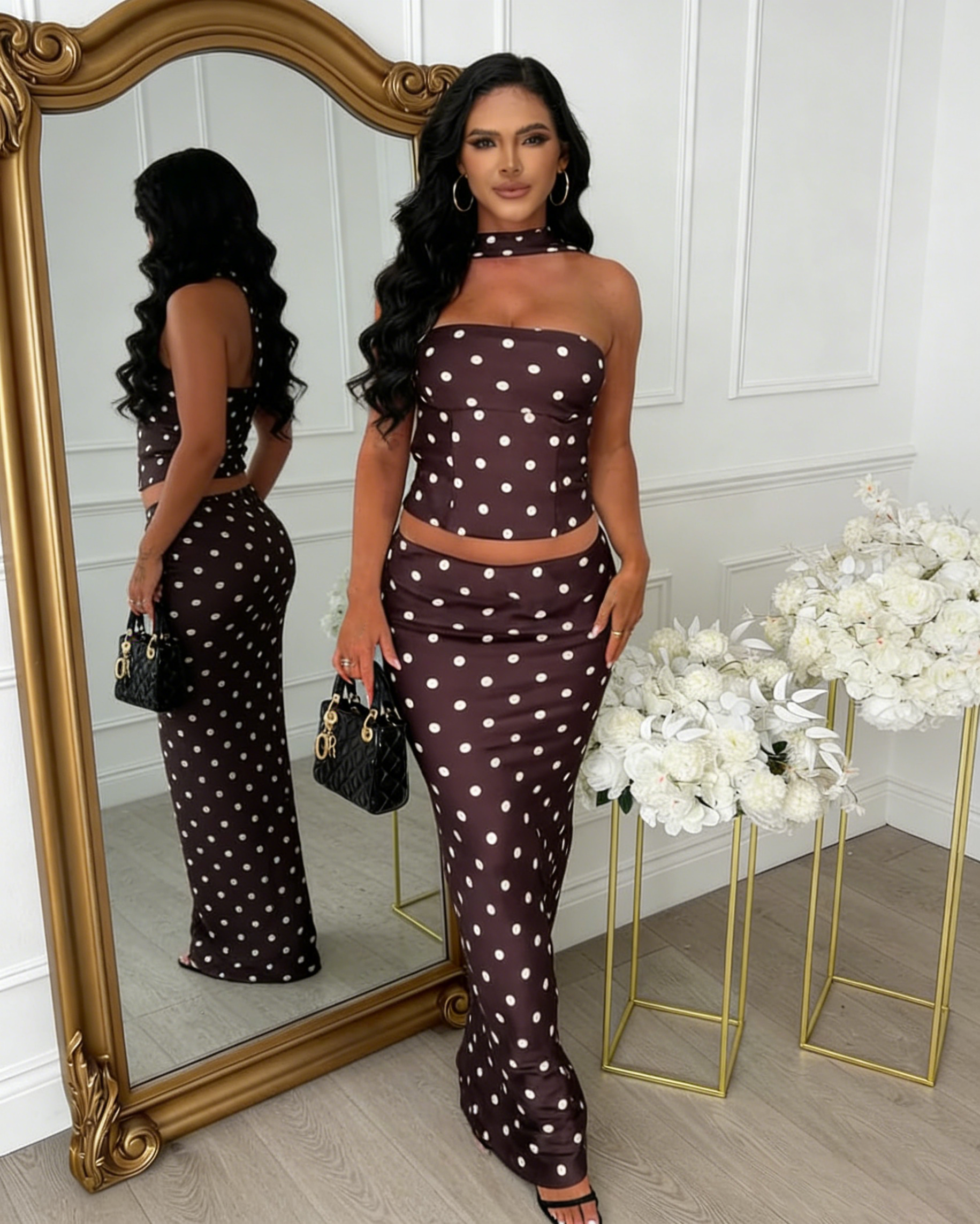 Elevate your wardrobe with this Polka Dot Skinny Figure Dress Set featuring a crisp white base adorned with classic polka dots. The scarf detail top adds an effortless touch of sophistication, while the midaxi skirt creates a flattering, elongated silhouette. Perfect dressed-up occasions. Mix and match with your existing pieces or wear together for an instantly polished look.