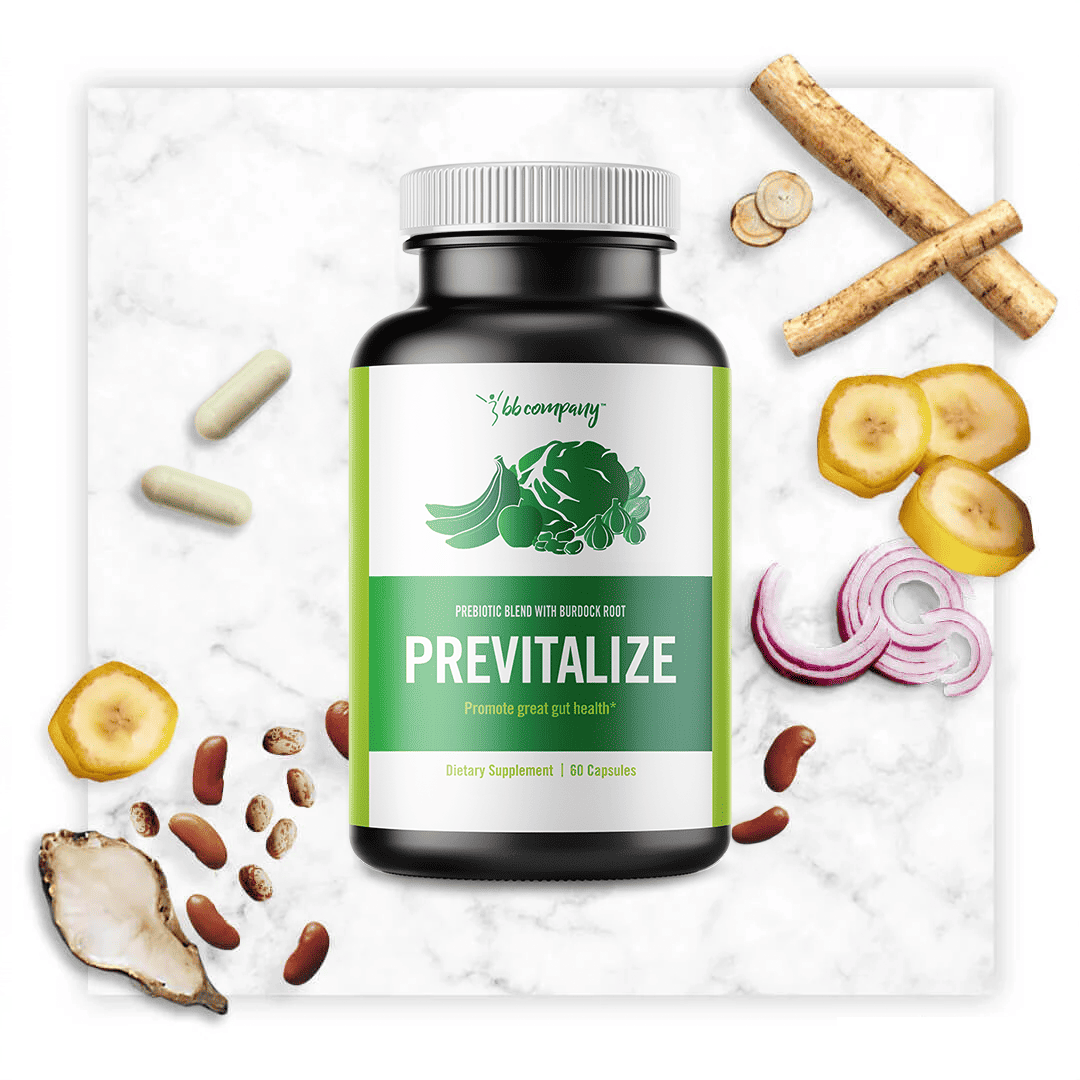 Unlike some brands only having a singular kind of prebiotic, Previtalize is made with 4 different kinds of prebiotic fibres extracted from plants and vegetables, making it all-natural. To boost the prebiotic effect even more, we’ve added Burdock Root — a herb that’s packed with prebiotic fibres as well as nutrients that help with managing blood sugar and inflammation.