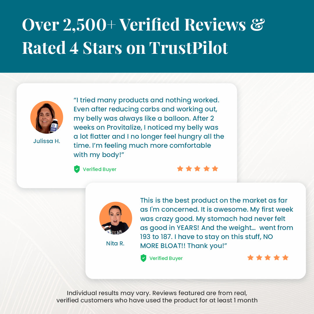 “After 2 weeks, that stubborn, sometimes painful bloat was gone. I feel slimmer and lighter and my clothes fit more comfortably than they have in years without changing anything in my diet. I will continue to use Provitalize indefinitely!”