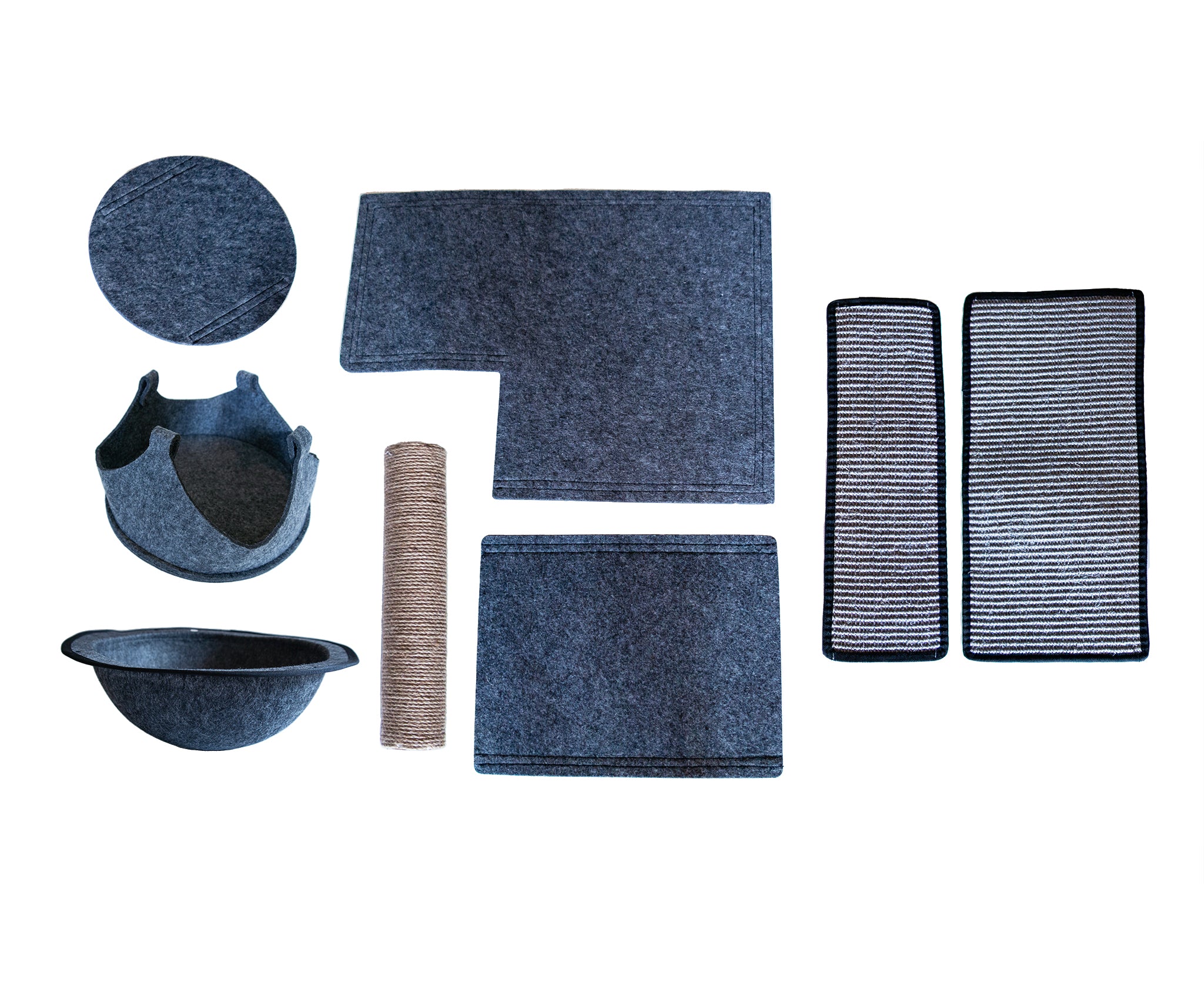 This kit includes all the pieces to the Jungle Gym Cat Tree 2.0 that may show wear and tear after prolonged use by our feline friends; featuring two sisal scratchers, three felt pads, a hammock, a bowl, and one sisal scratching post.