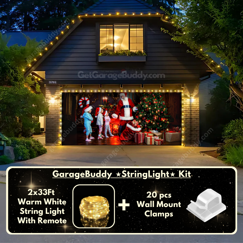 You now have the option to add the GarageBuddy string light kit to your order at 50% off and make your Christmas garage door cover shine even brighter. The kit includes 1x 33 ft warm white string light, a remote control, and 10 sticky wall-mount clamps. The 2-door garage option comes with 2 string light kits. Since the lights work on three AA batteries (not included), there’s no need to worry about tangled wires or power outlets.